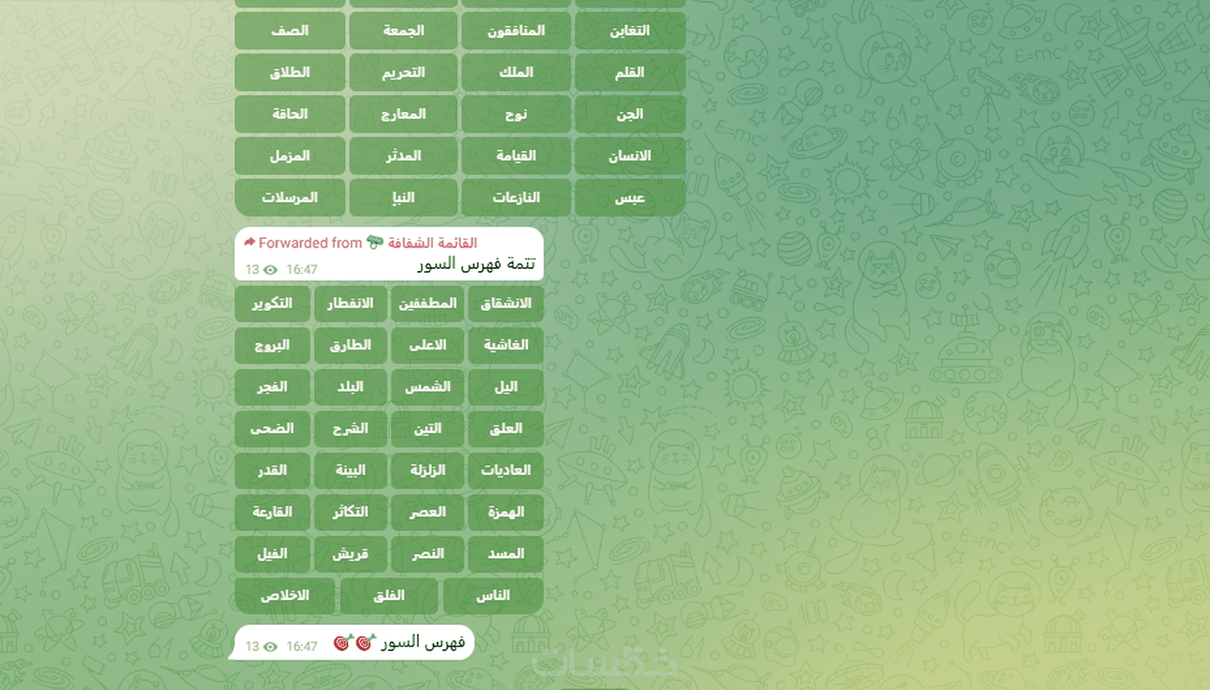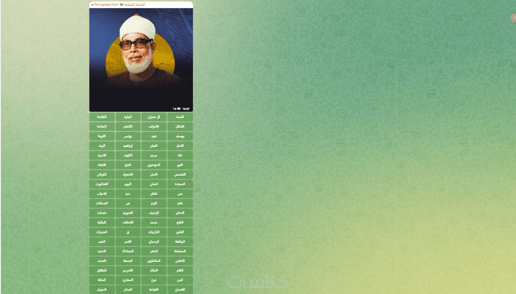 للبدء في العمل يجب أن أتوصل برابط القناة في التلغرام و شرح توضيحي للائحة الأزرار المطلوبة مثالها لائحة أزرار الاحزاب في قنوات القران مثل الموجود في الصورة