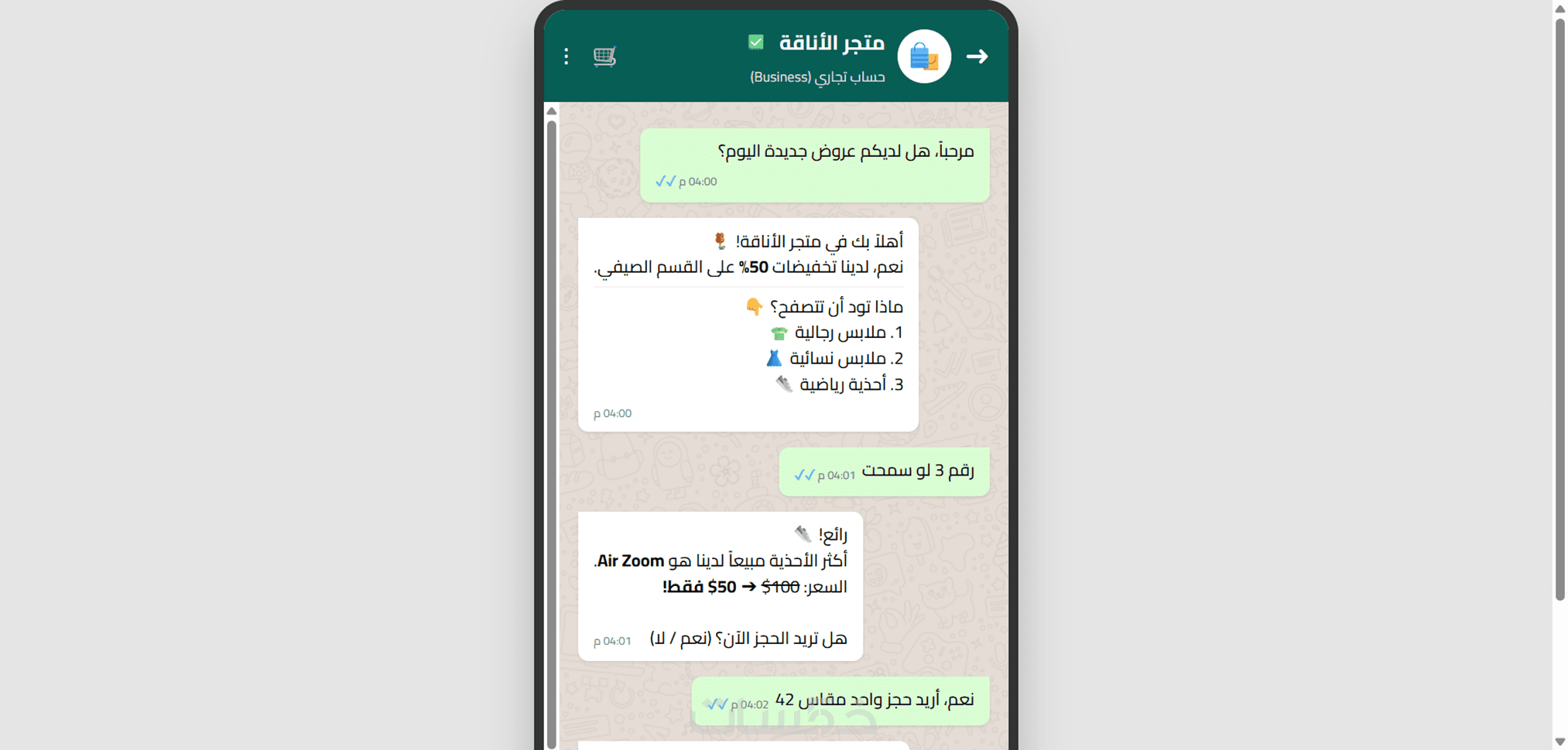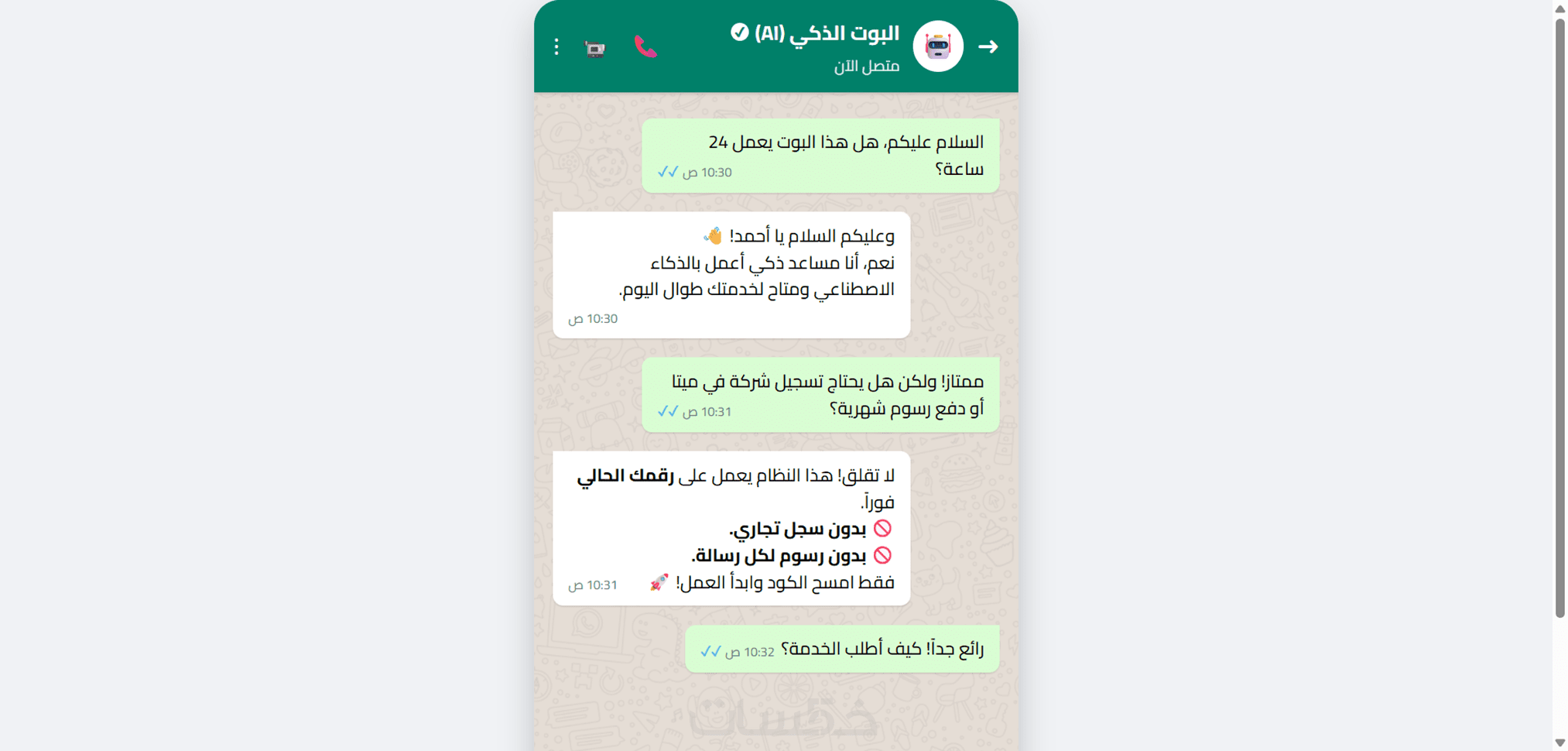 ستحصل على بوت واتساب يعمل 24/7 ويجيب عن أسئلة العملاء والناس بلغة طبيعية وأسلوب تسويقي أو احترافي
