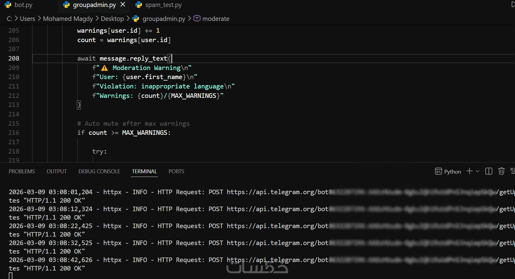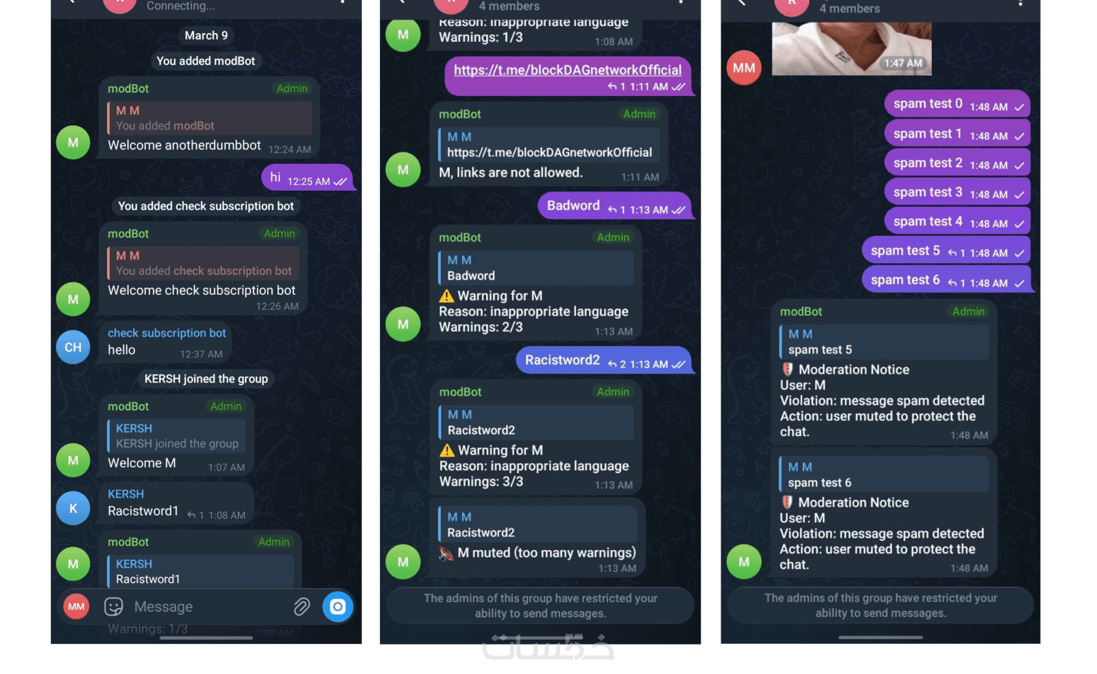 بوت إدارة مجموعات (منع الروابط، فلترة الكلمات، نظام تحذيرات، كشف السبام)