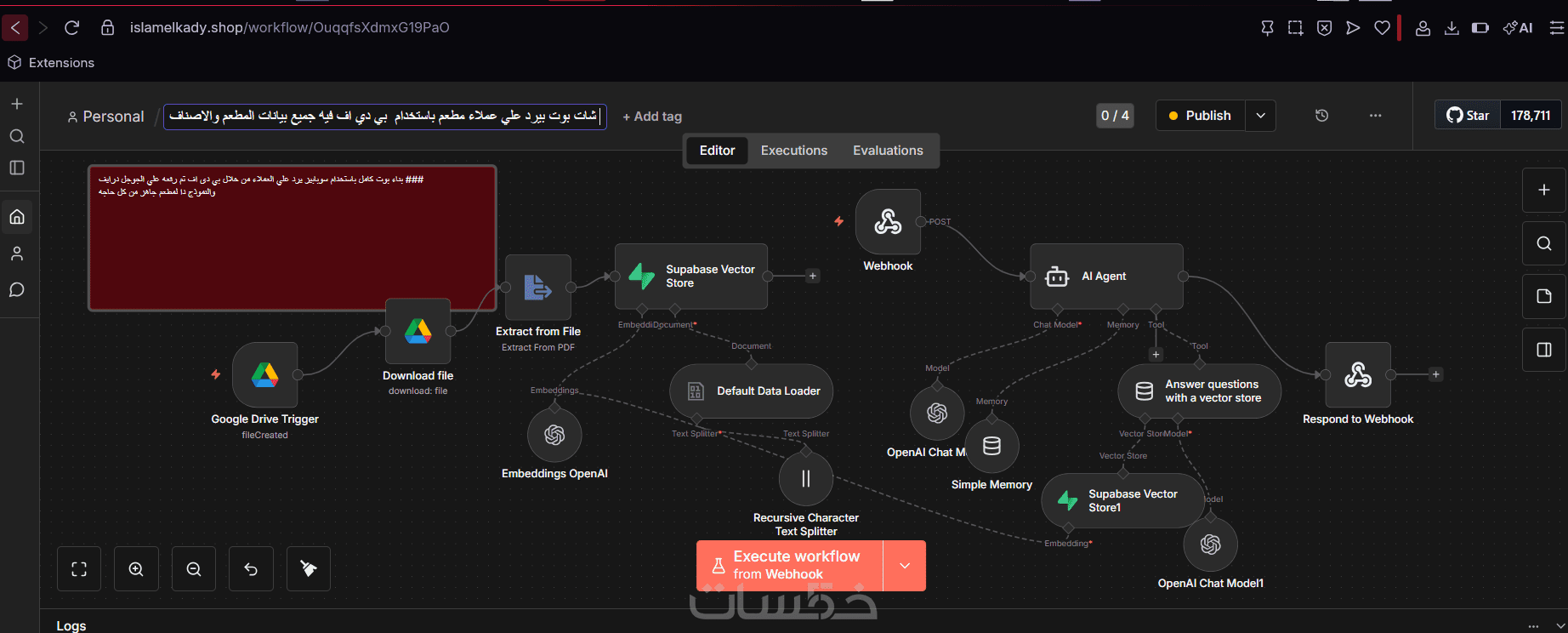 هل تبحث عن رفع كفاءة عملك وتحويل مستنداتك إلى مساعد ذكي يجيب على عملائك؟ أقدم لك خدمة بناء نظام أتمتة متكامل باستخدام منصة n8n يجمع بين الذكاء الاصطناعي وإدارة البيانات بذكاء.