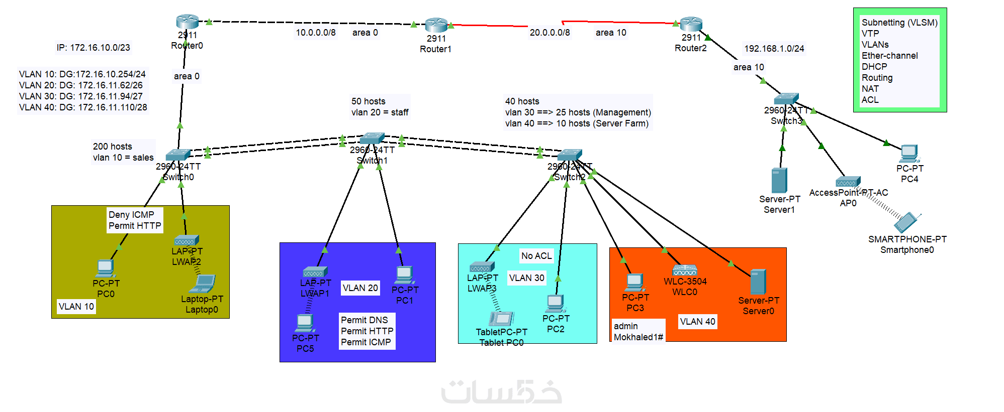 - الخدمات المطلوبة (VLAN, DHCP, NAT, OSPF...).