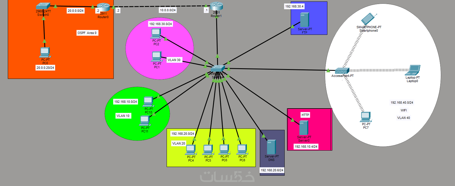 إعداد 3 سيرفرات (DNS – HTTP – FTP) وربطها بالشبكة.