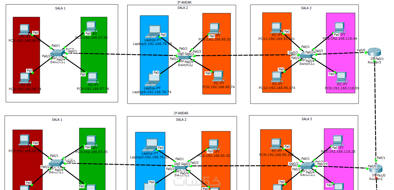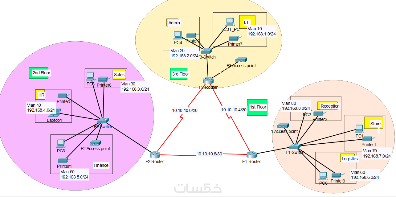إعداد أجهزة الراوتر والسويتشات (Configuration) وربط الأجهزة النهائية حتى 30 جهاز .