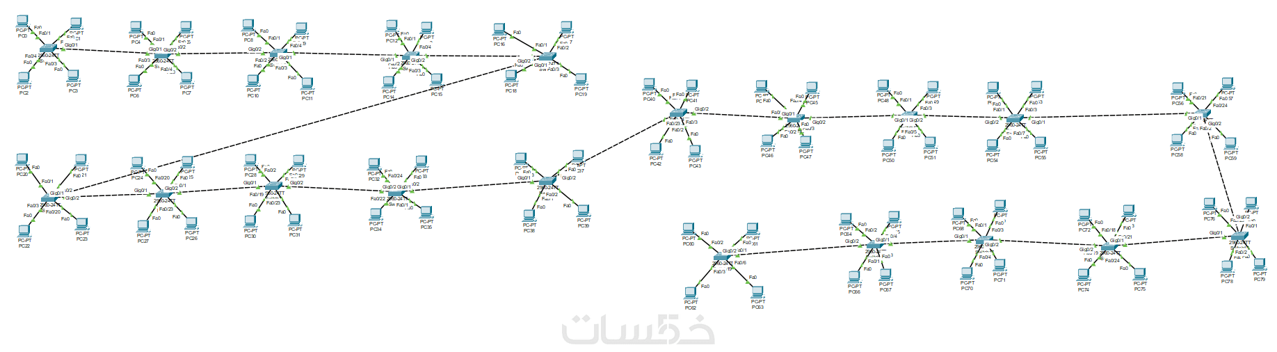 تصميم شبكة مؤسسية (100 جهاز) تشمل 3 راوتر، 6 سويتش، سيرفر وجدار حماية