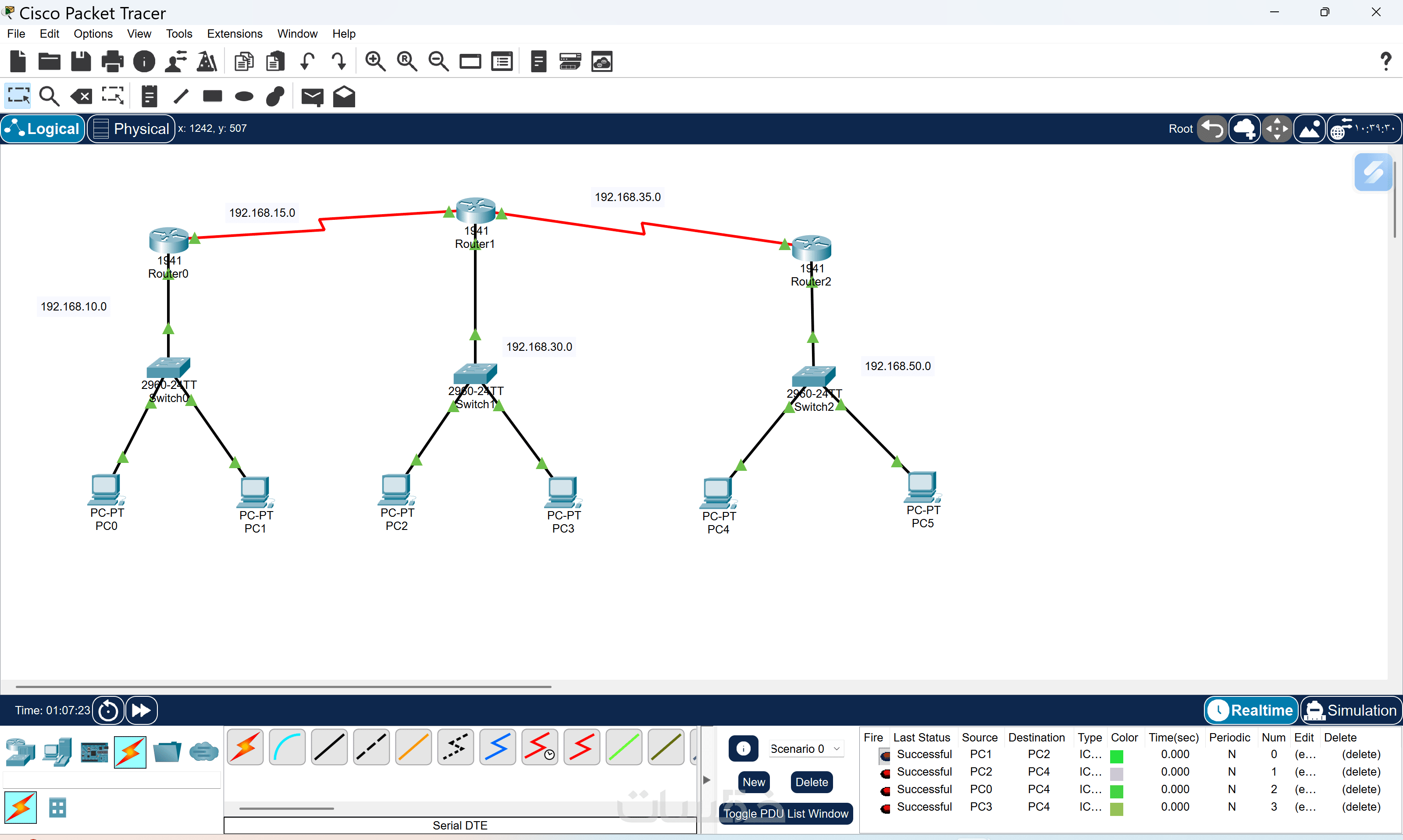 تصميم شبكة موسعة (4 راوتر، 4 سويتش، 15 جهاز) مع برمجة بروتوكولات OSPF/EIGRP وإعداد VLANs بالكامل.
