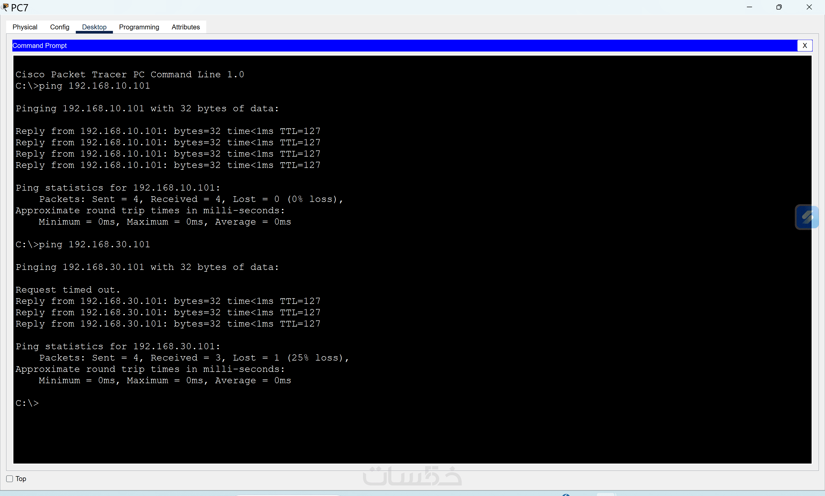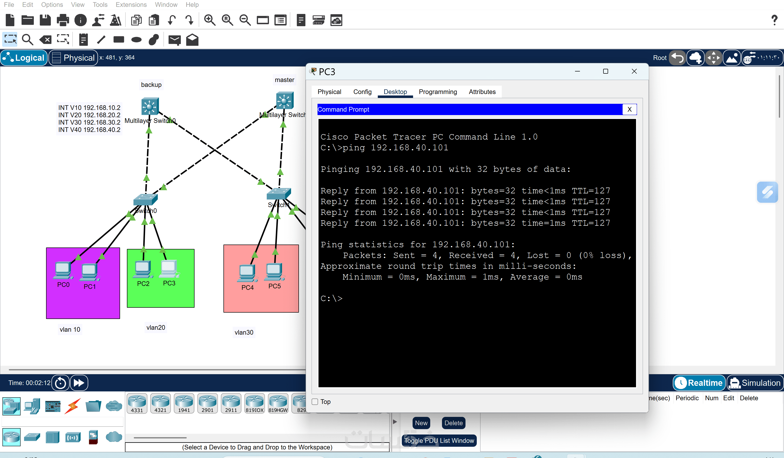 صورة (Screenshot) توضح نجاح اختبار الاتصال بين جميع أجهزة الشبكة (Successful Ping) لضمان أن الشبكة تعمل بكفاءة 100%.