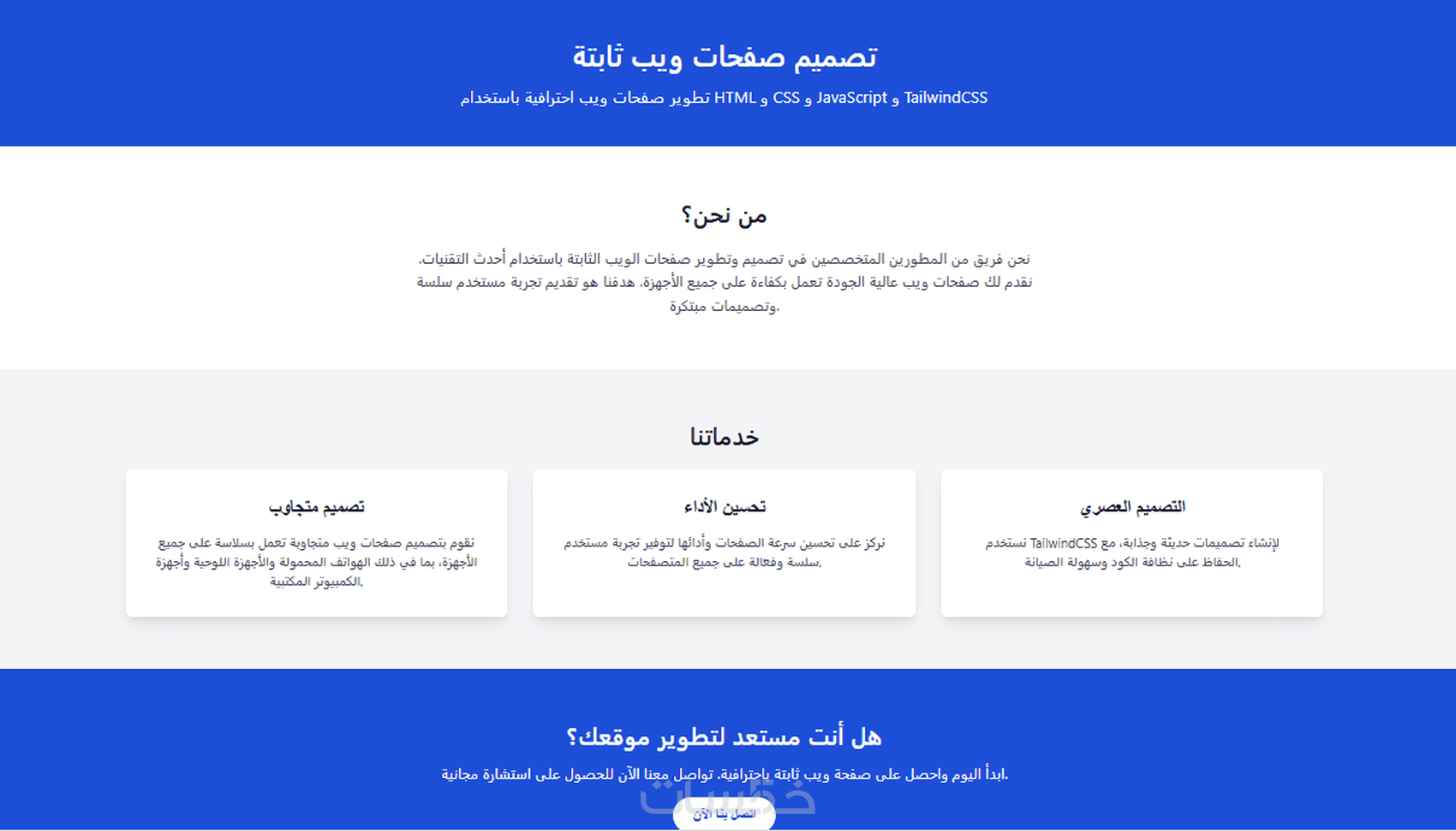 تصميم صفحة ويب ثابتة وعصرية باستخدام HTML وCSS وJavaScript وTailwindCSS.