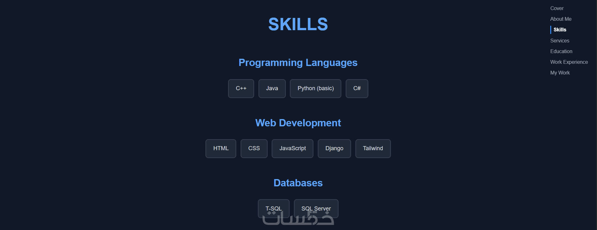 الأقسام: إمكانية إضافة أقسام للصفحة الرئيسية حسب طلبك (بحد أقصى 7 أقسام)، مثل: المقدمة، من أنا (About)، أعمالي (Projects)، مهاراتي (Skills)، وتواصل معي (Contact).