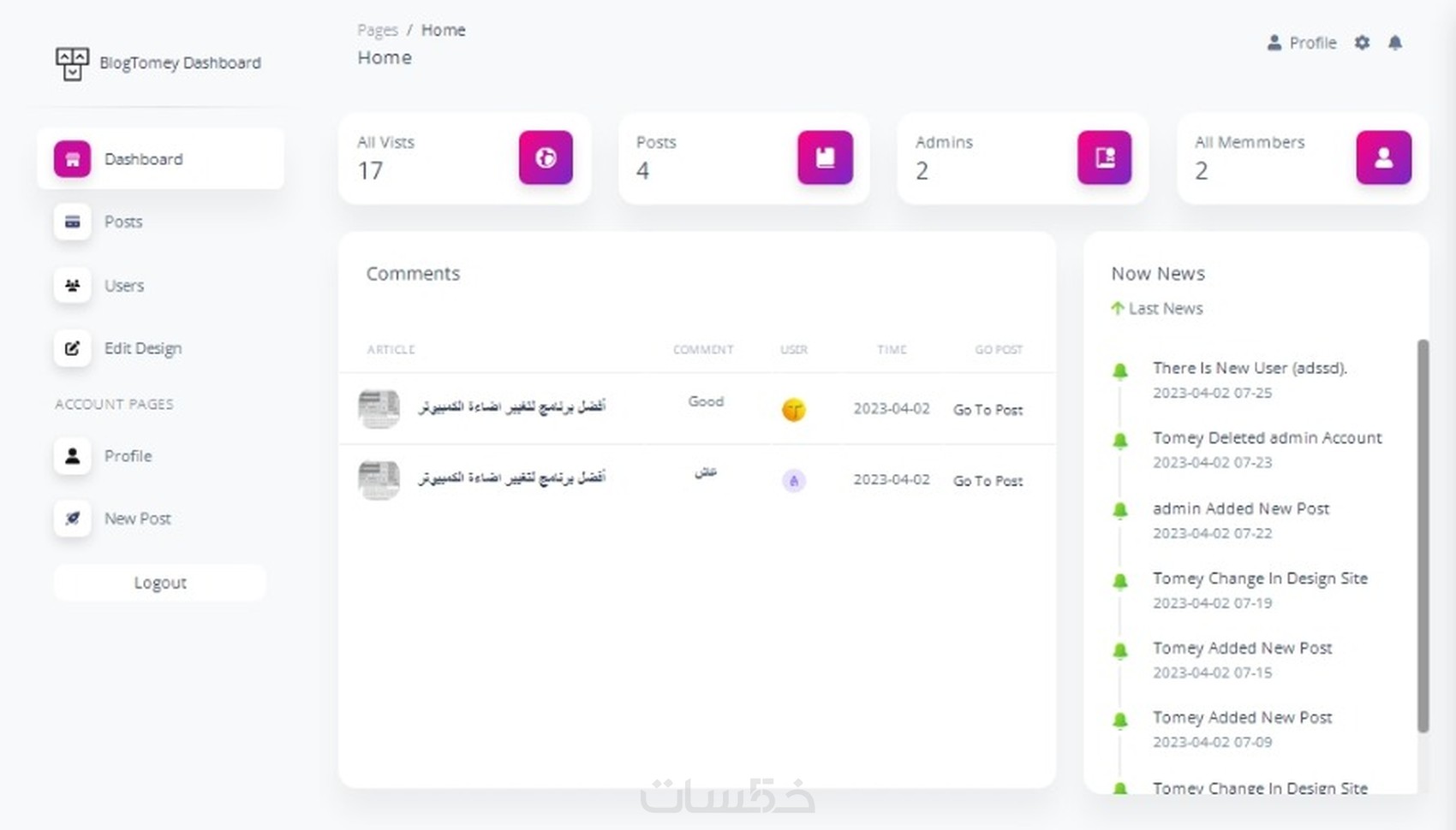 1- Home: يمكنك منها رأيته عدد الزوار وعدد المقالاتك والاعضاء والادمن.