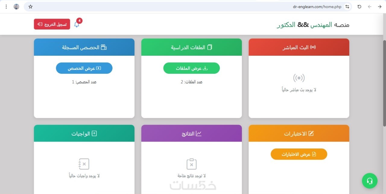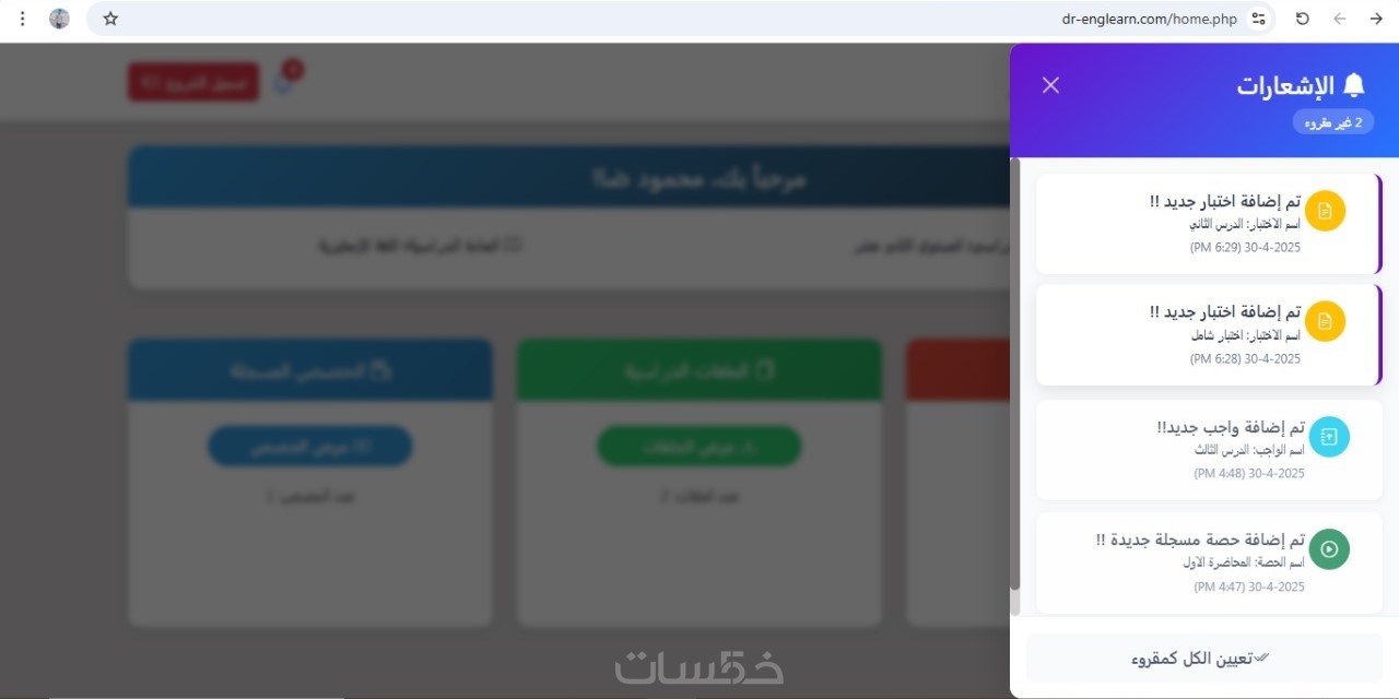 * شريط إشعارات يخطر الطلاب فور إضافة أي محتوى جديد (اختبارات، فيديوهات، واجبات).