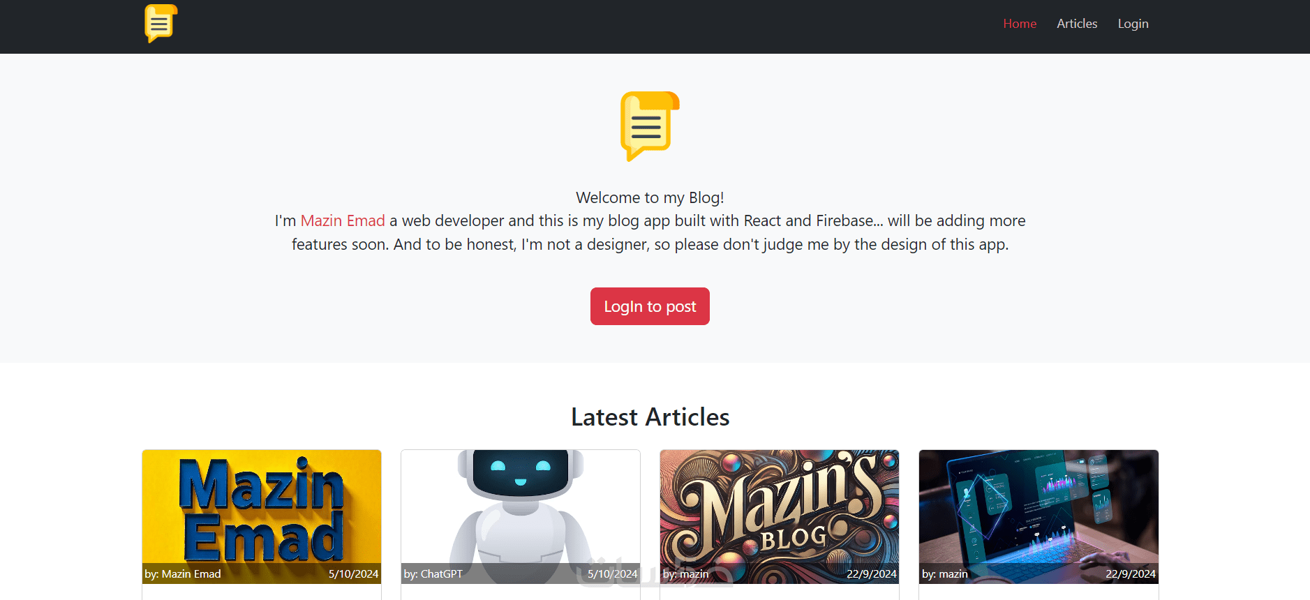 أنا مازن عماد، مطور واجهات أمامية ومواقع ويب بخبرة في تقنيات حديثة مثل React.js, Next.js, Node.js, Firebase و MongoDB. أقدم لك خدمة تصميم وتطوير مواقع ويب عالية الأداء ومخصصة لتلبية احتياجاتك.