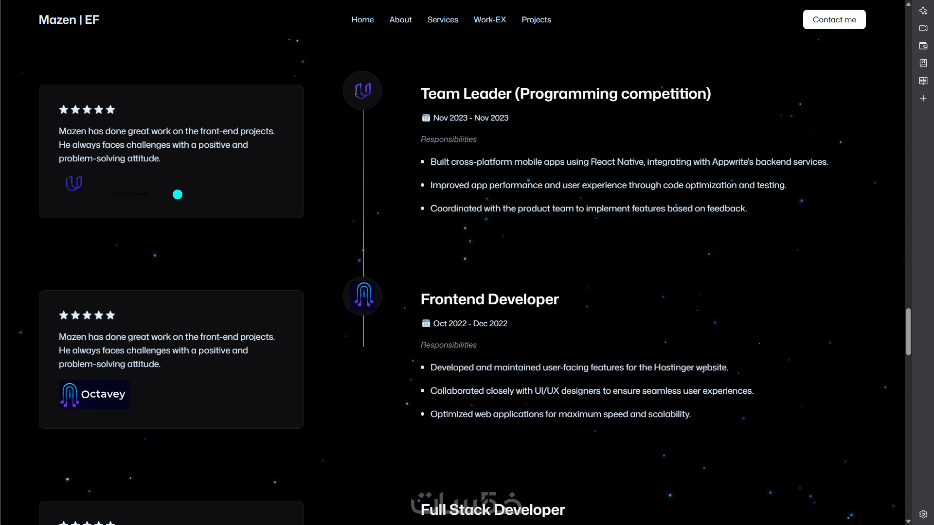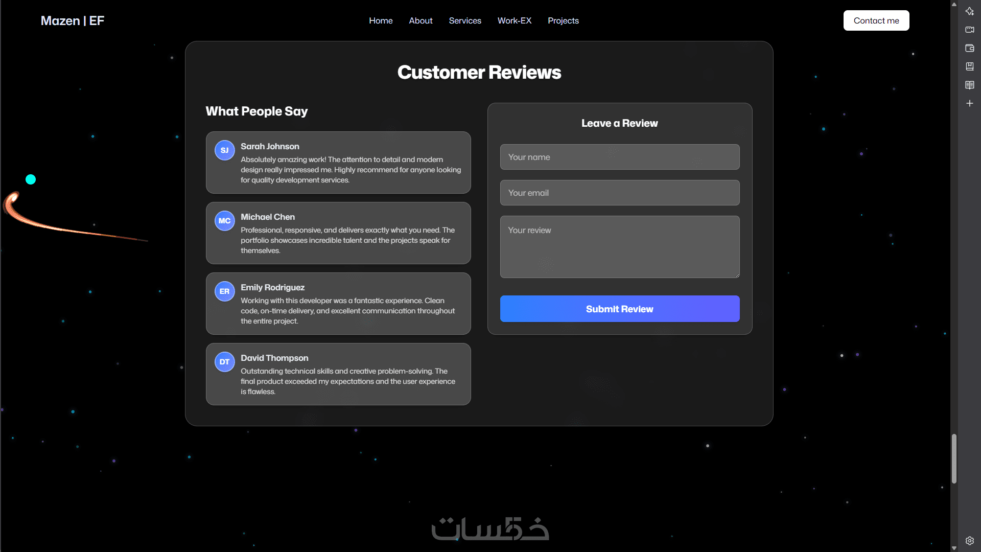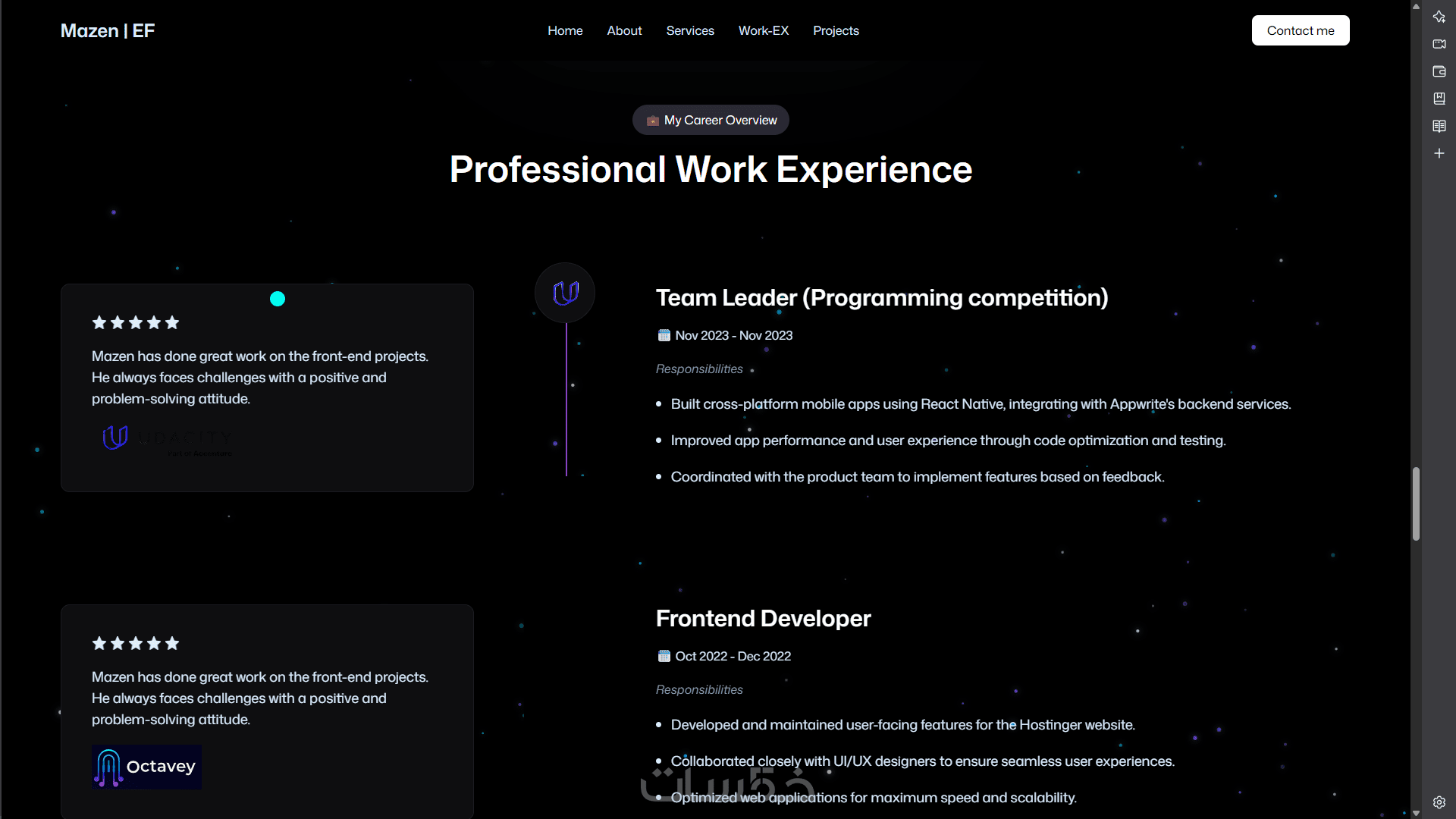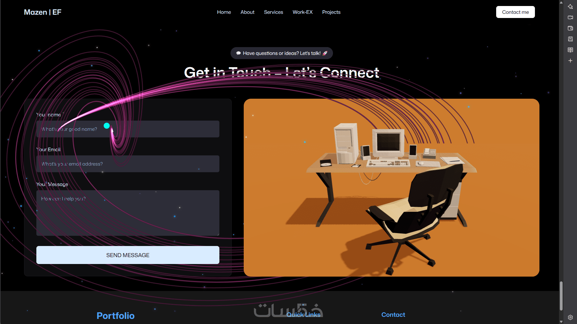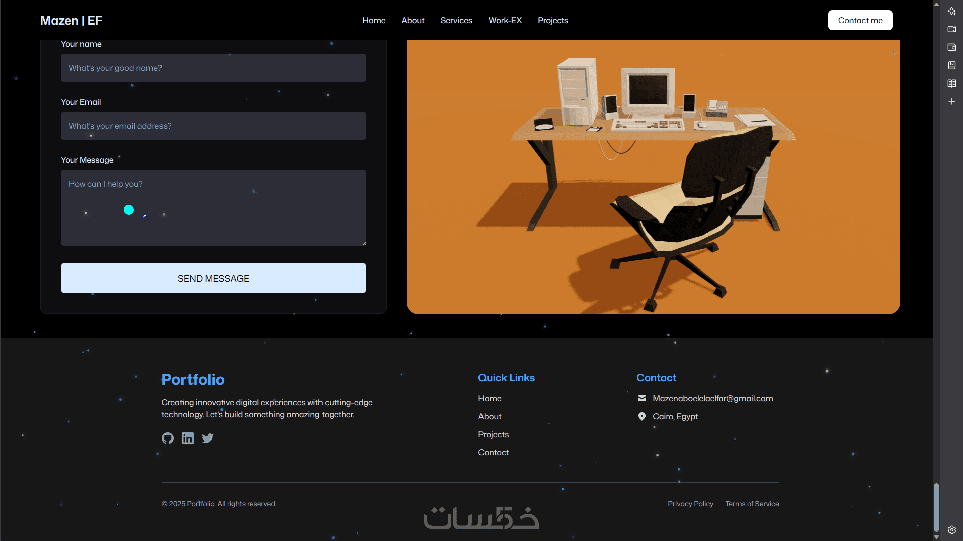 سأقوم بتصميم وبناء موقع بورتفوليو شخصي لك باستخدام React.js وTailwind CSS، يتضمن واجهة تفاعلية ورسوم متحركة سلسة بـ GSAP وThree.js (إذا رغبت)، مع تصميم متجاوب يظهر بشكل ممتاز على جميع الأجهزة.