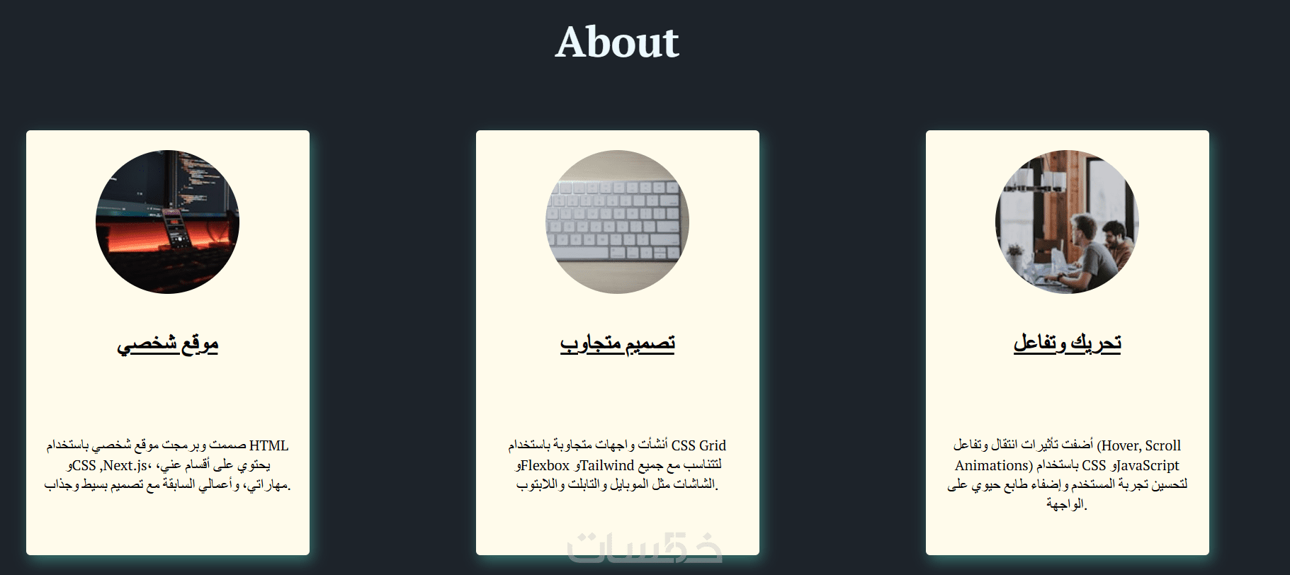 سأقوم بتصميم وبرمجة موقع شخصي احترافي (Portfolio) مخصص لك باستخدام أحدث التقنيات في والبرمجة و يكون متوافق مع جميع الأجهزة موبايل تابلت كمبيوتر