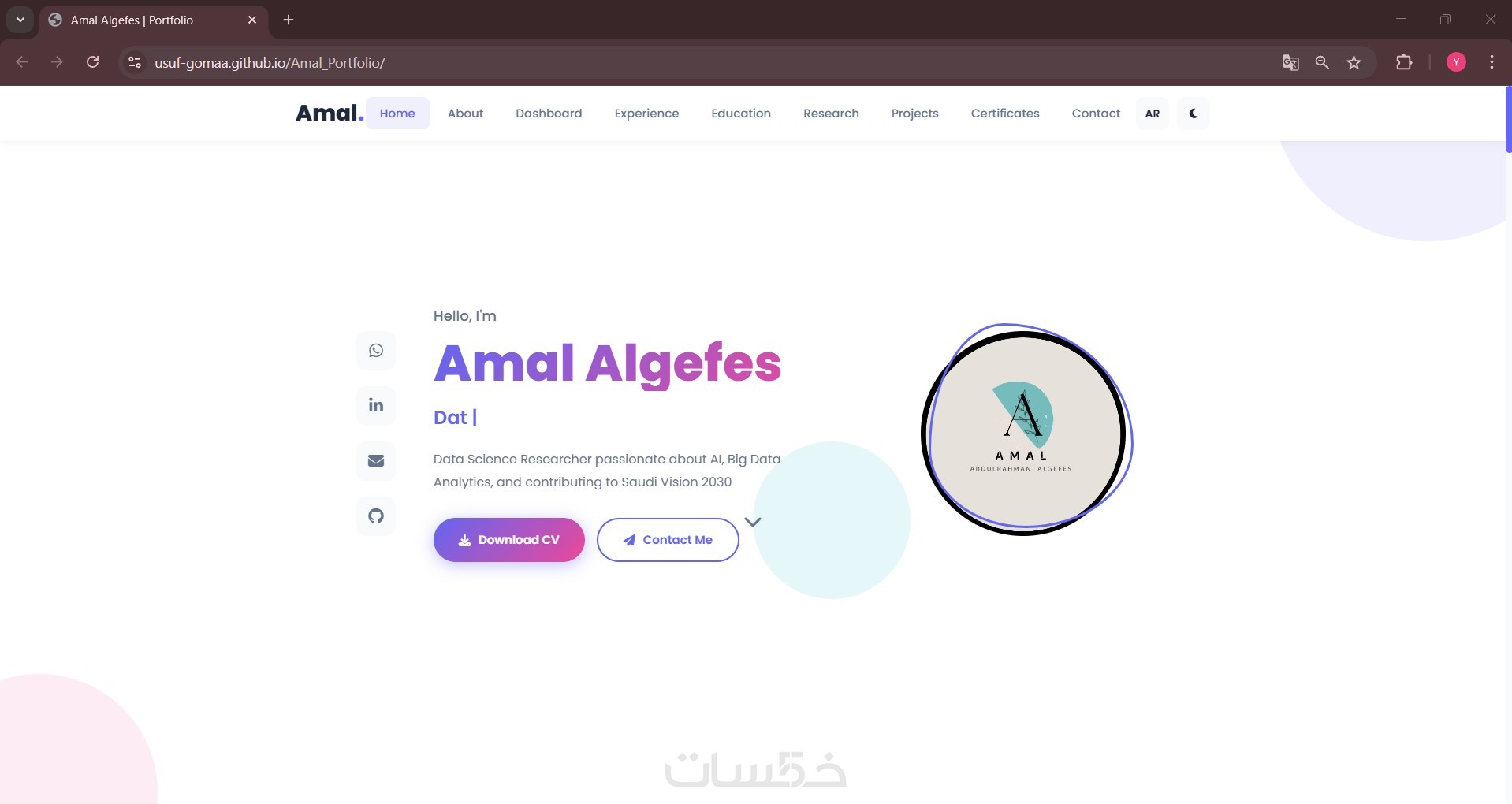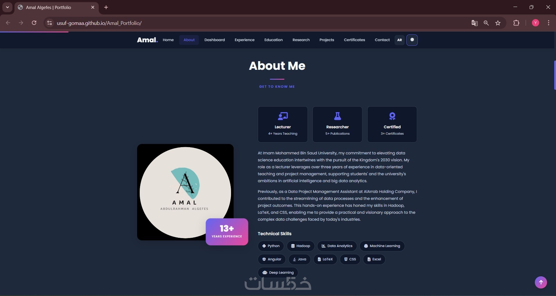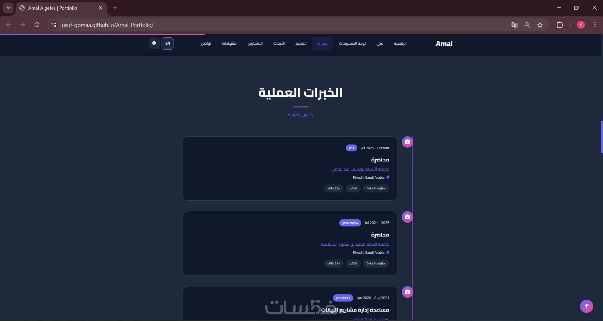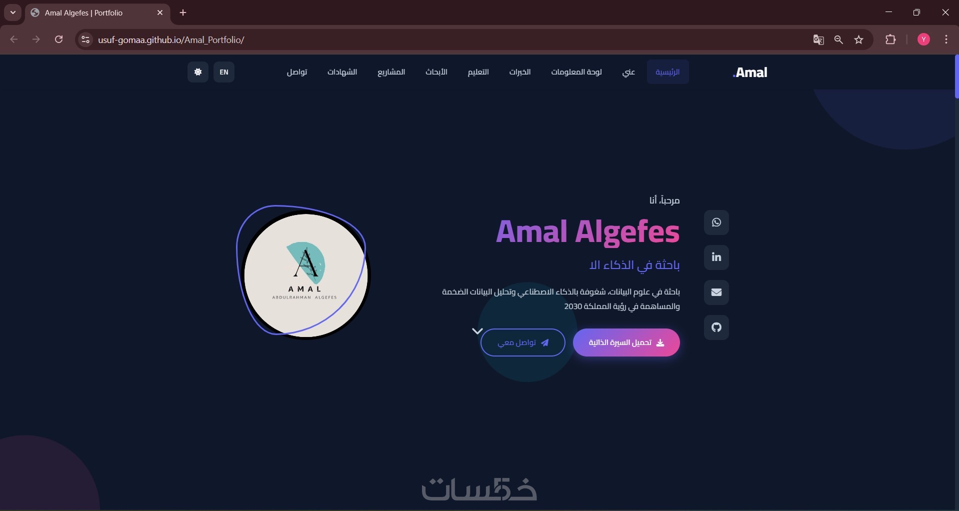 تصميم وبرمجة بورتفوليو شخصي متكامل باستخدام أحدث تقنيات HTML5, CSS3, JavaScript، مع تصميم عصري ومتجاوب يعمل بسلاسة على جميع الأجهزة (كمبيوتر – تابلت – موبايل).