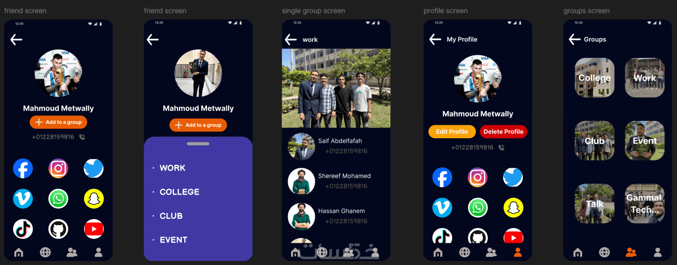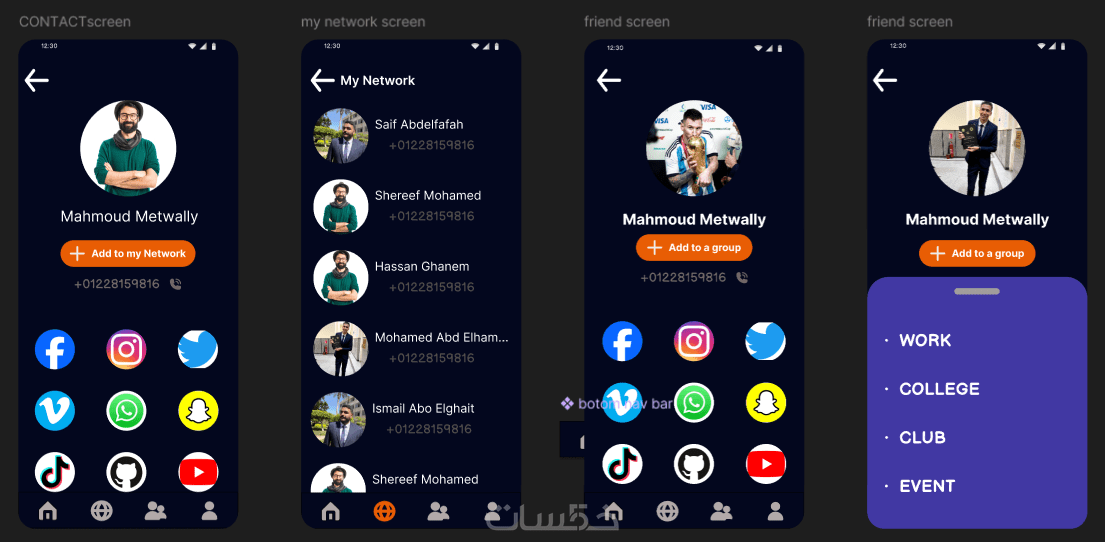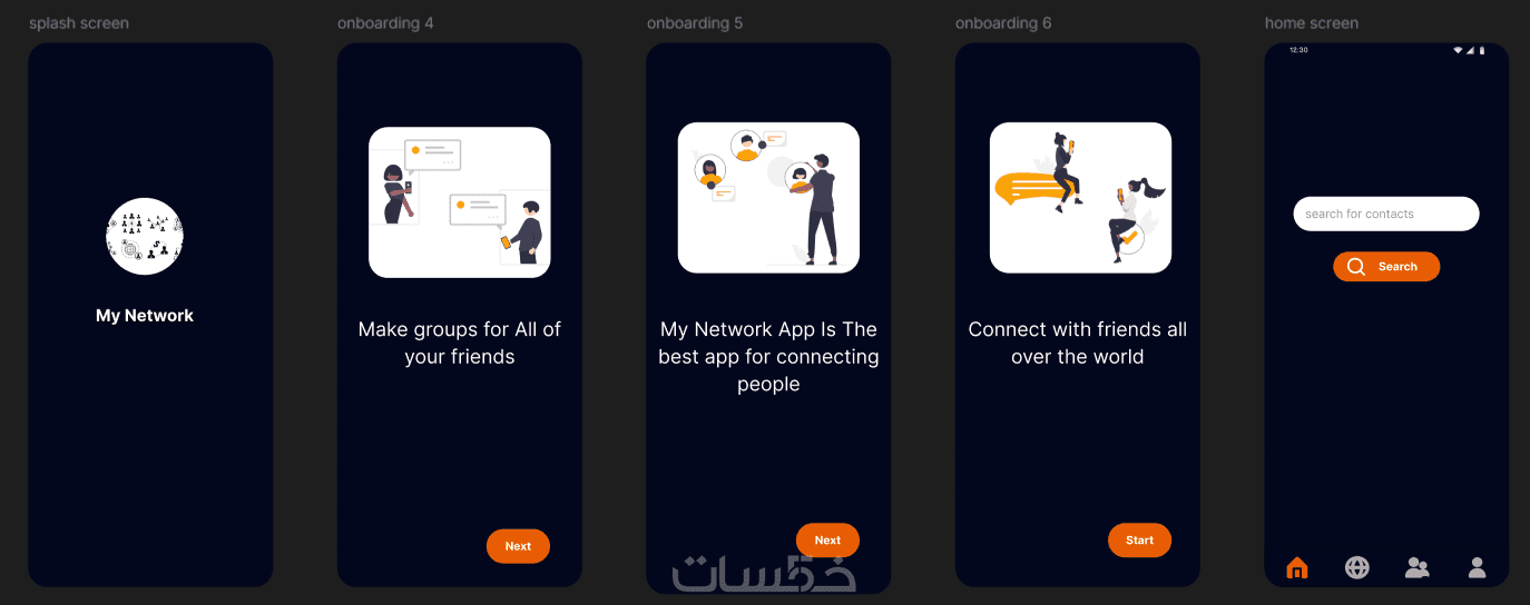 مثلاً: شاشة تسجيل الدخول، صفحة رئيسية، صفحة ملف شخصي، صفحة إعدادات، شاشة تفاصيل وصفحات تانيه كتير