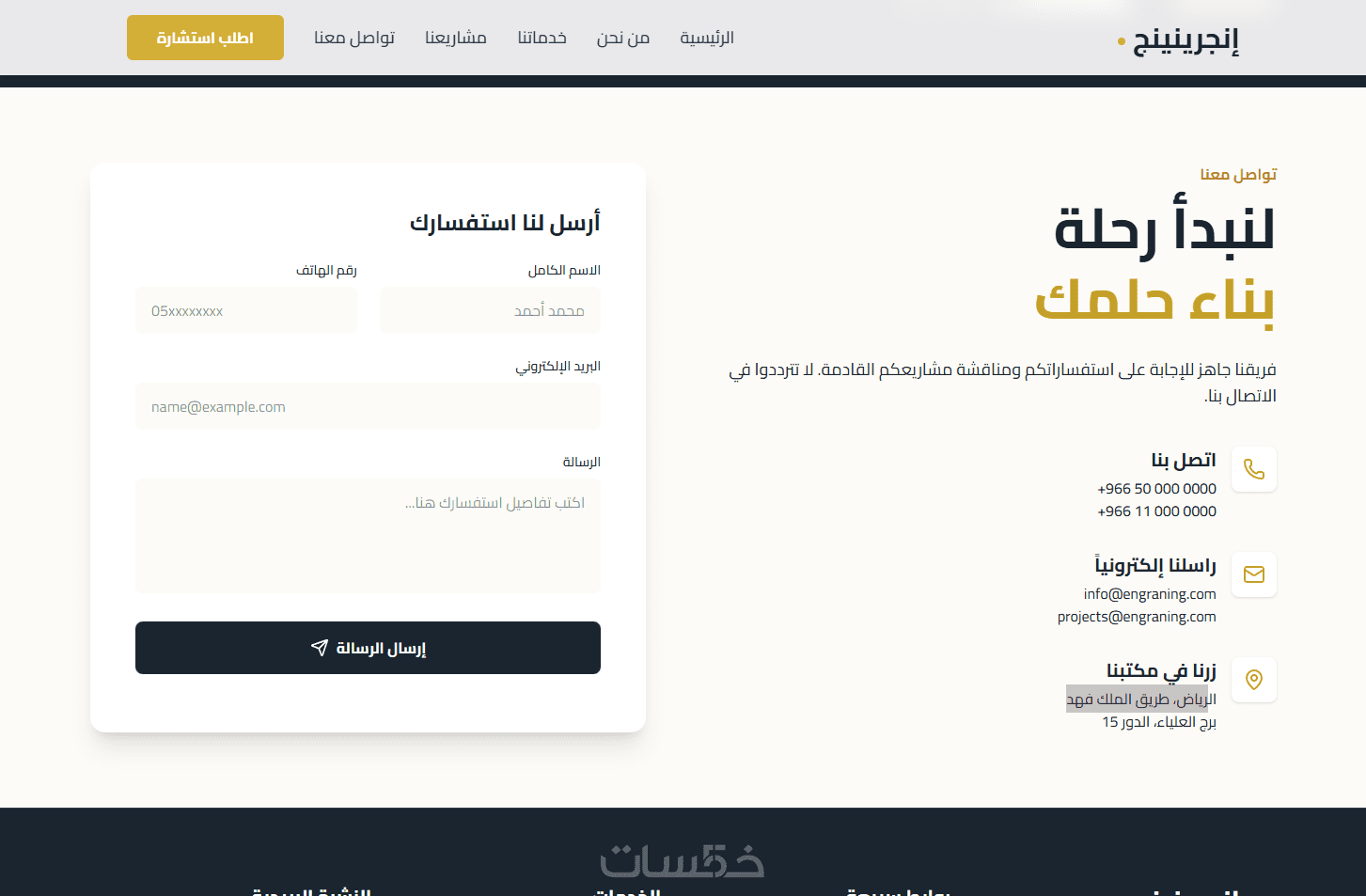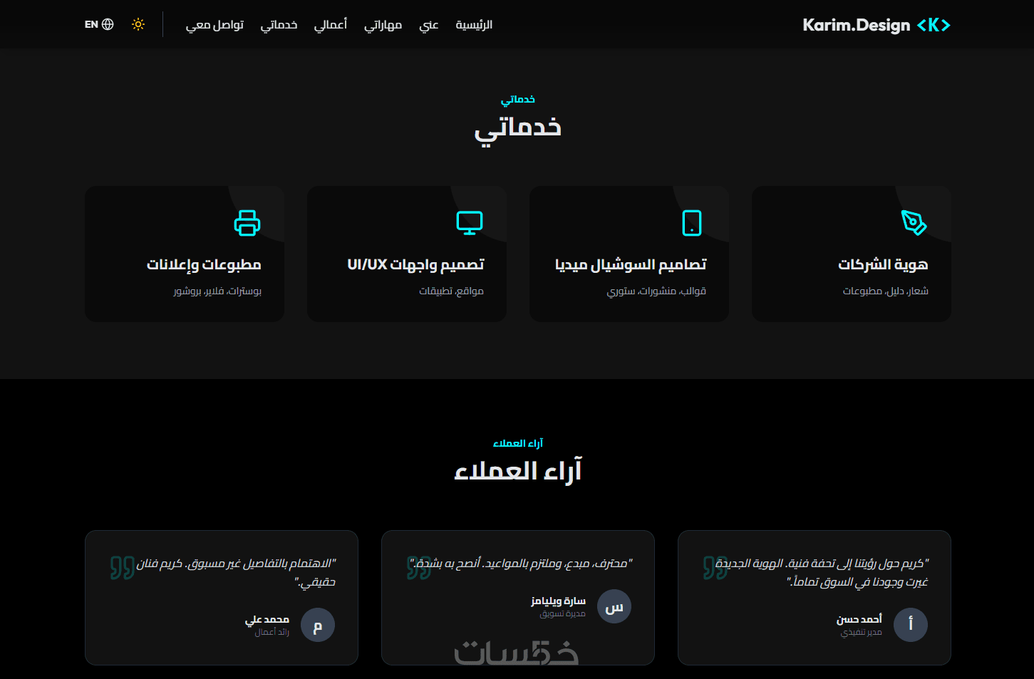 موقع متكامل ومتجاوب يشمل الصفحات الأساسية: الصفحة الرئيسية، معرض الأعمال، وصفحة التواصل — بتصميم عصري وتجربة مستخدم مميزة تعكس احترافيتك.
