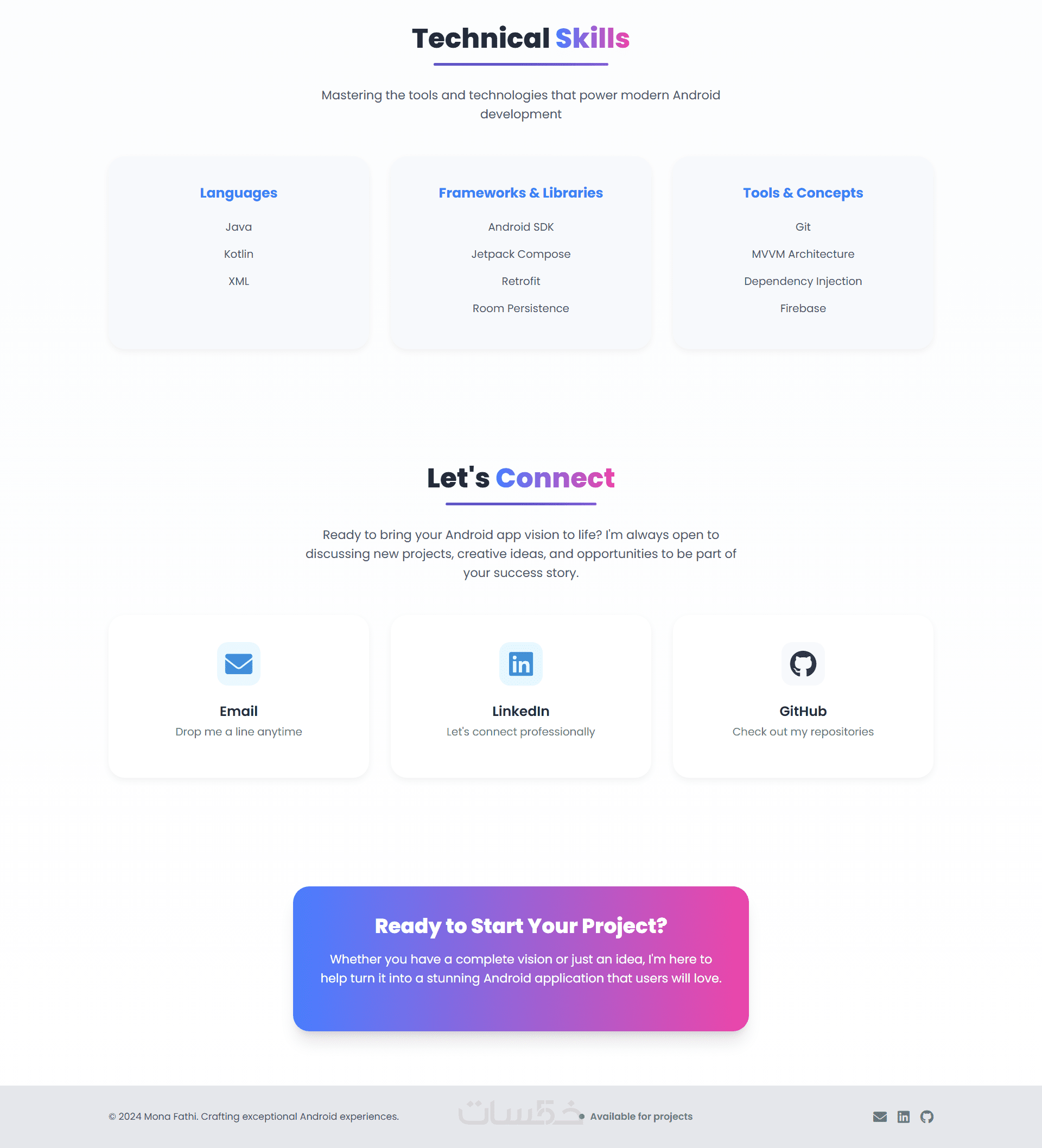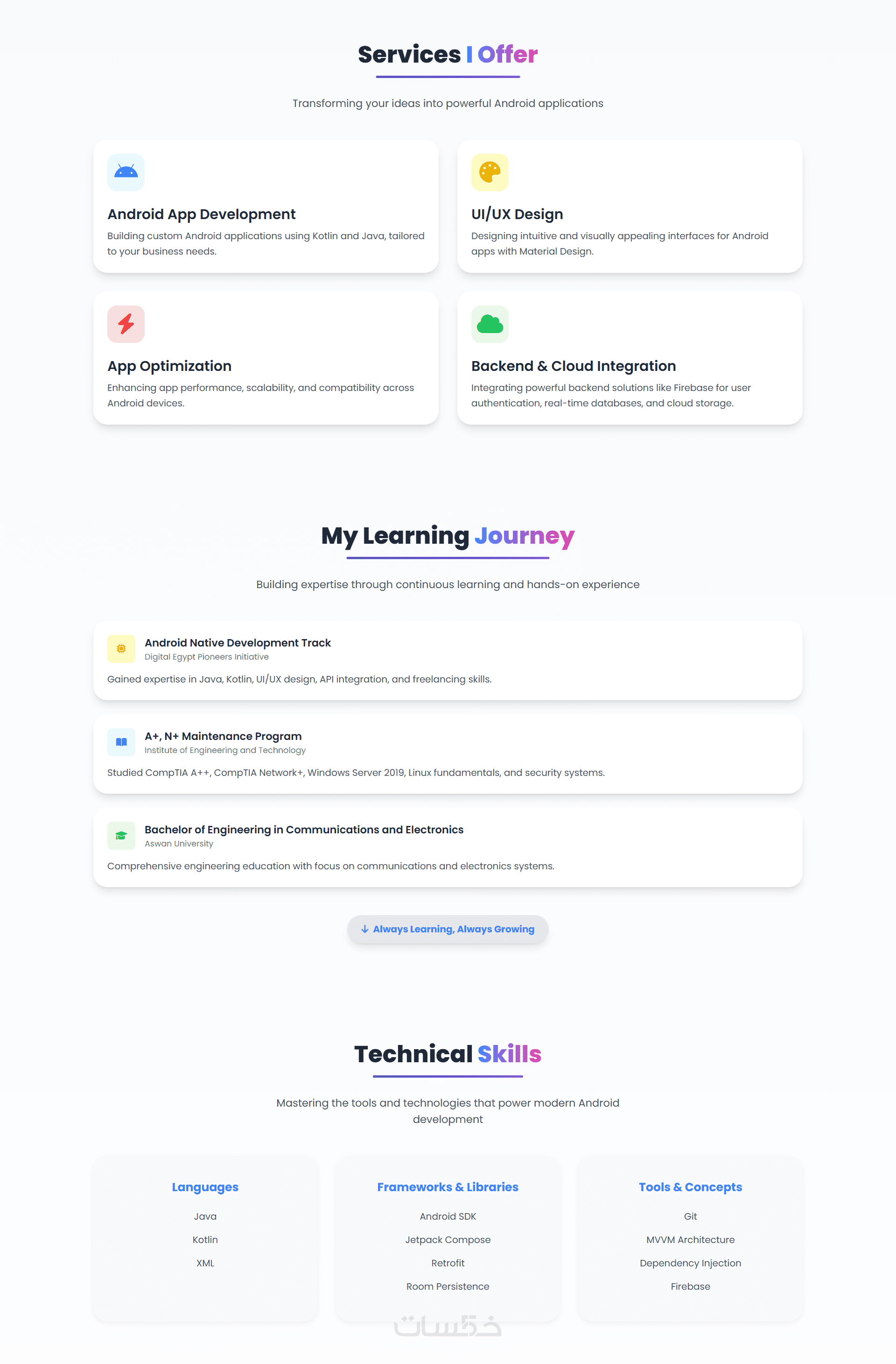 أقدم خدمة تصميم وتطوير صفحة بورتفوليو (Portfolio) شخصي متجاوبة (Responsive) لعرض مهاراتك وأعمالك بشكل عصري وجذاب. هذا الموقع هو بطاقتك الاحترافية على الإنترنت.