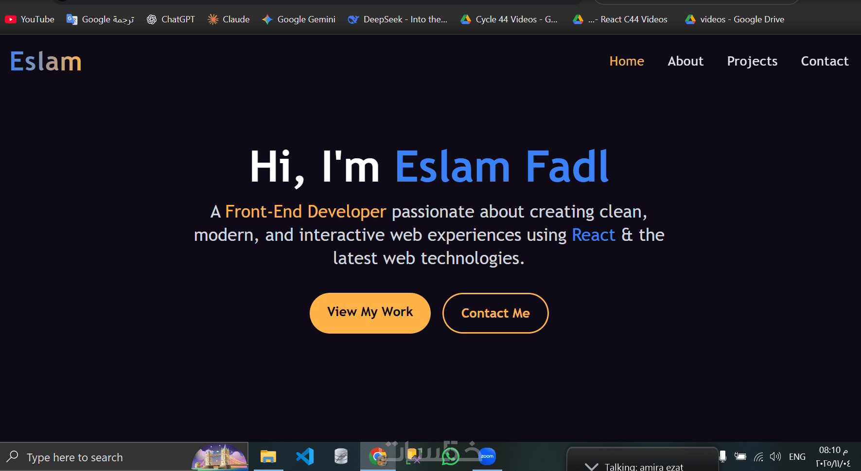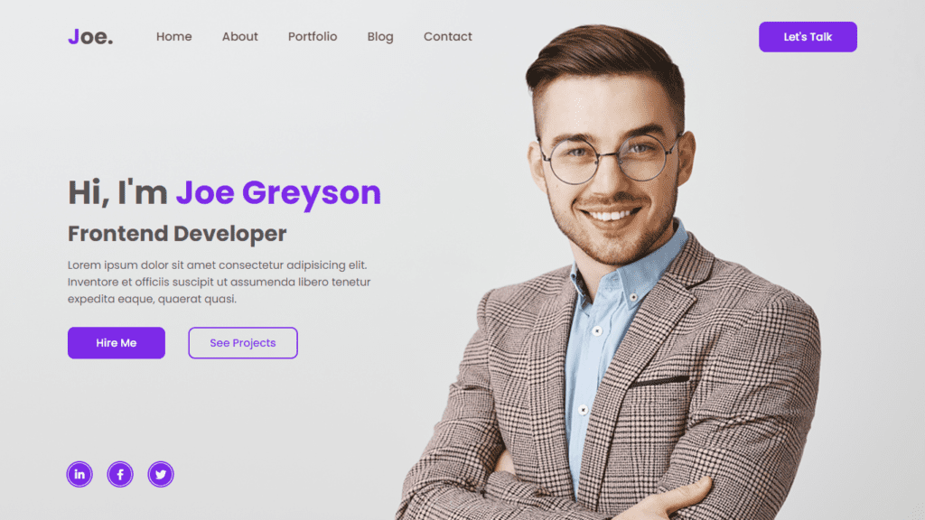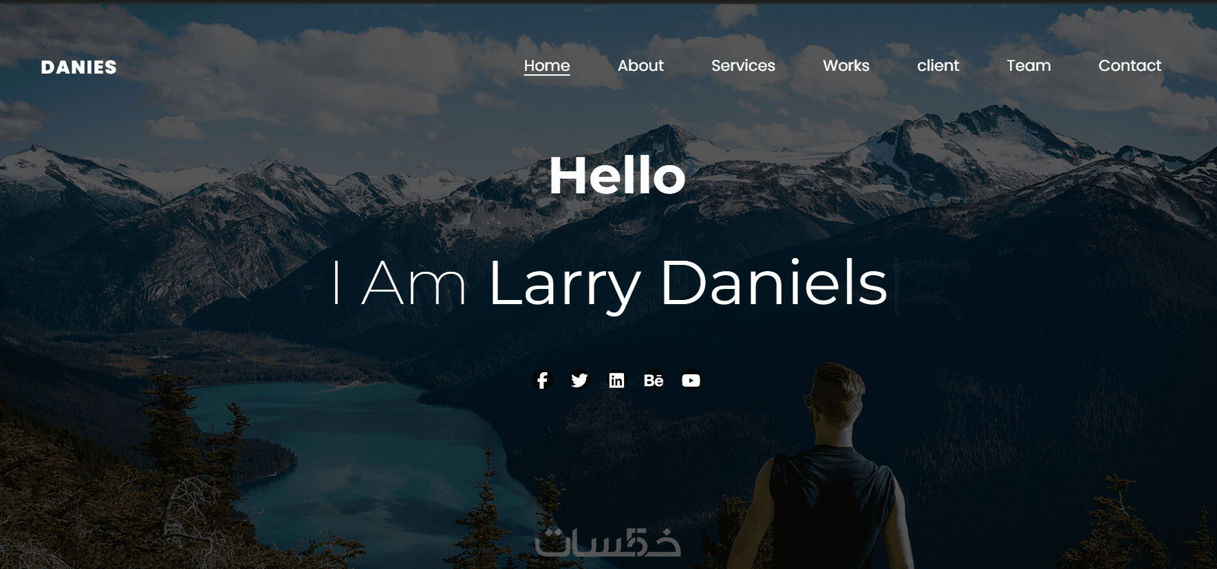 قسم الهيدر (Header) — يحتوي على اسمك والروابط الأساسية (مثل Home / About / Projects / Contact).