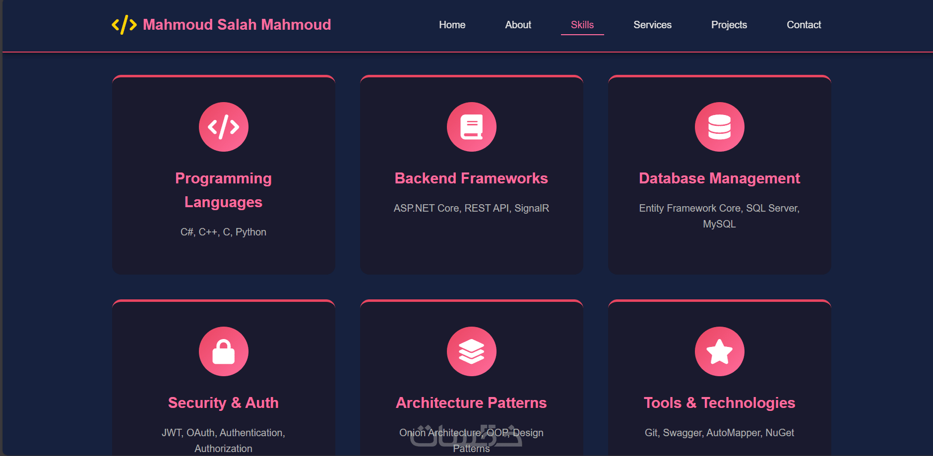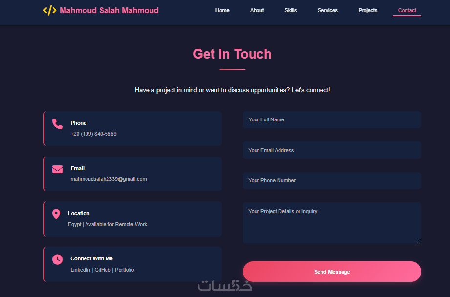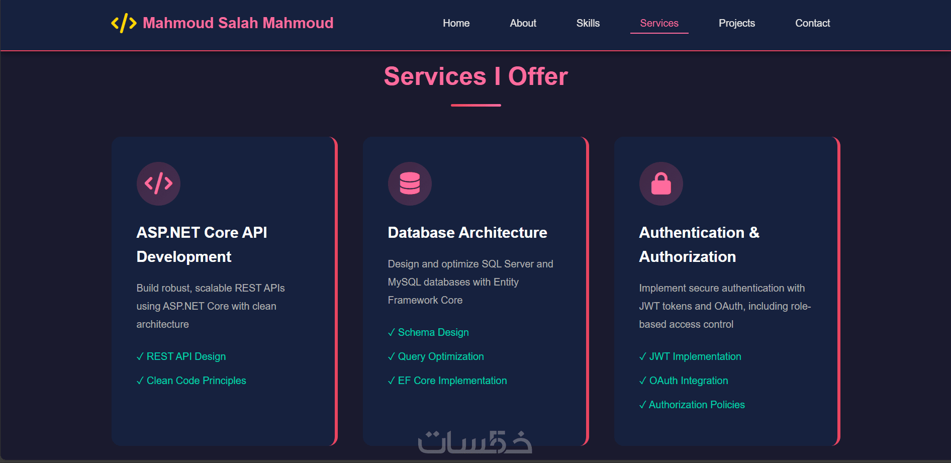 يحتوي البورتفوليو على خمسة أقسام رئيسية تُبرز أعمالك وخبراتك بشكل احترافي. كما يضمن تصميم الموقع استجابة كاملة لجميع الأجهزة (الكمبيوتر، التابلت، والهواتف الذكية)، مما يعزّز تجربة المستخدم ويزيد من فرص وصول العملاء إليك.
