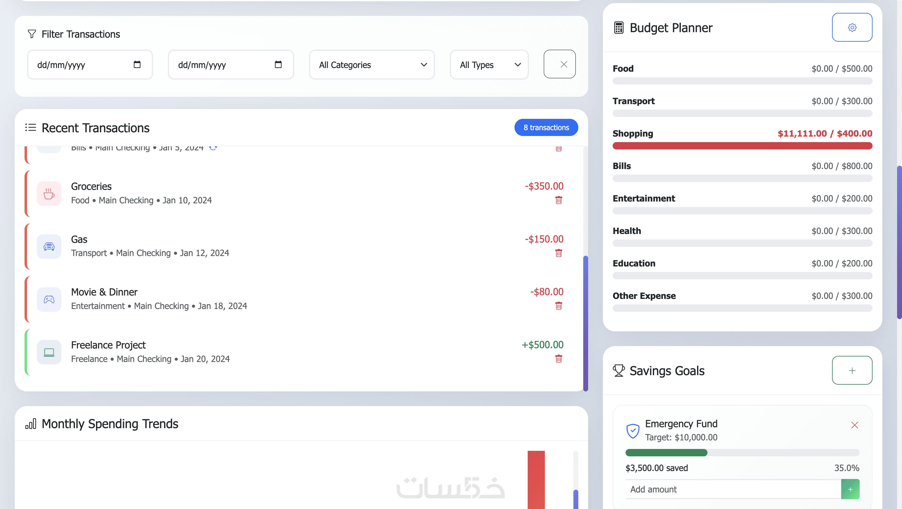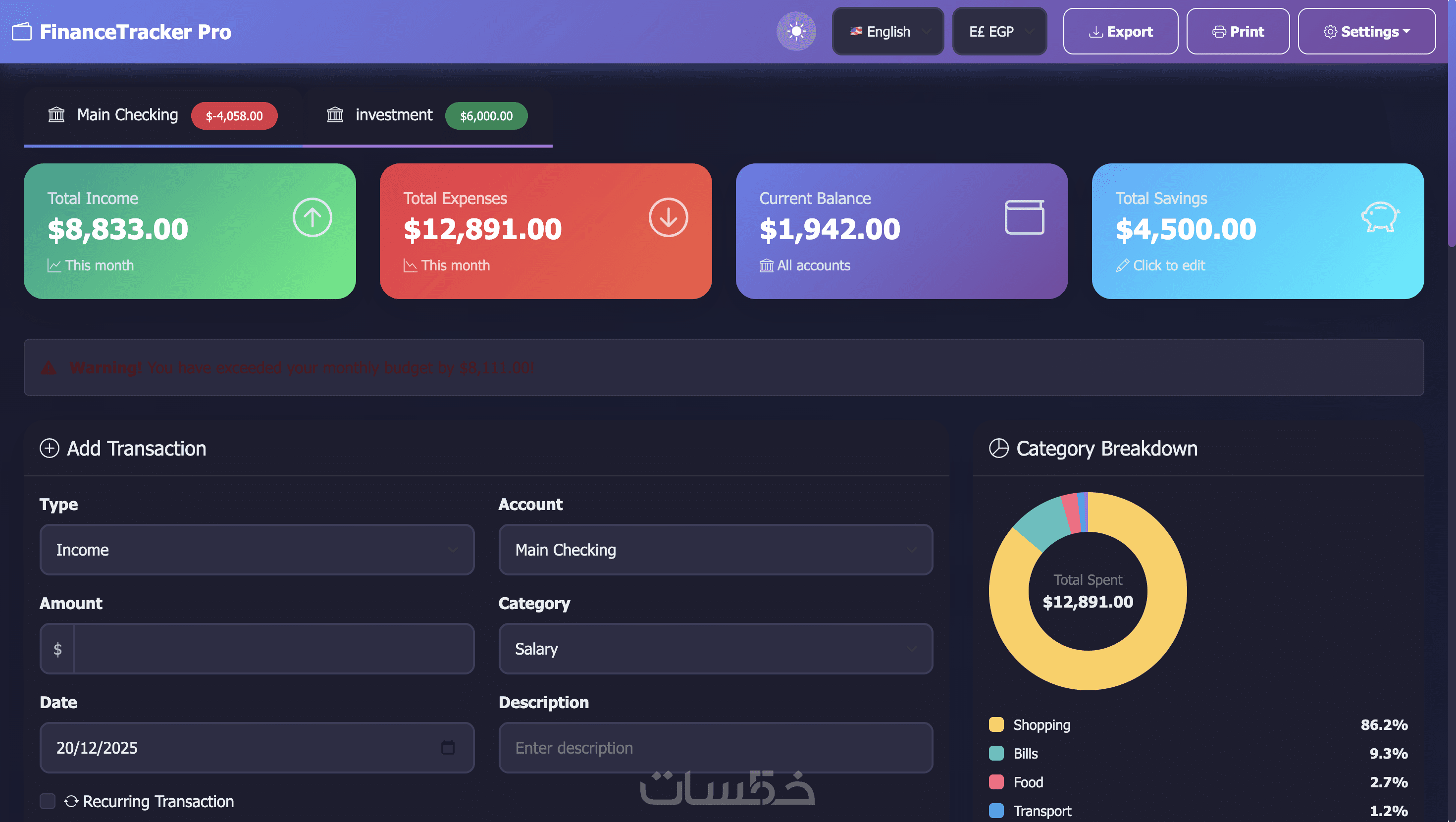 - Category Breakdown (Charts) رسم بياني للمصروفات
