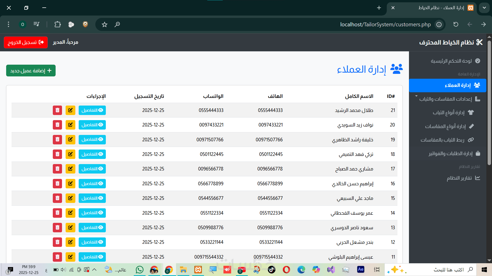 تحتوي على جميع العملاء الذين تم اضافتهم للنظام وكذلك على صفحة اضافة عميل جديد وصفحة تعديل بيانات عميل معين وواجهة عرض تفاصيل عميل معين مثل ومقاساتة حسب الثوب مع امكانية اضافة مقاس للعميل لاي نوع من الثياب وامكانية طباعة المقاس المحدد للعميل كما توضح الصور