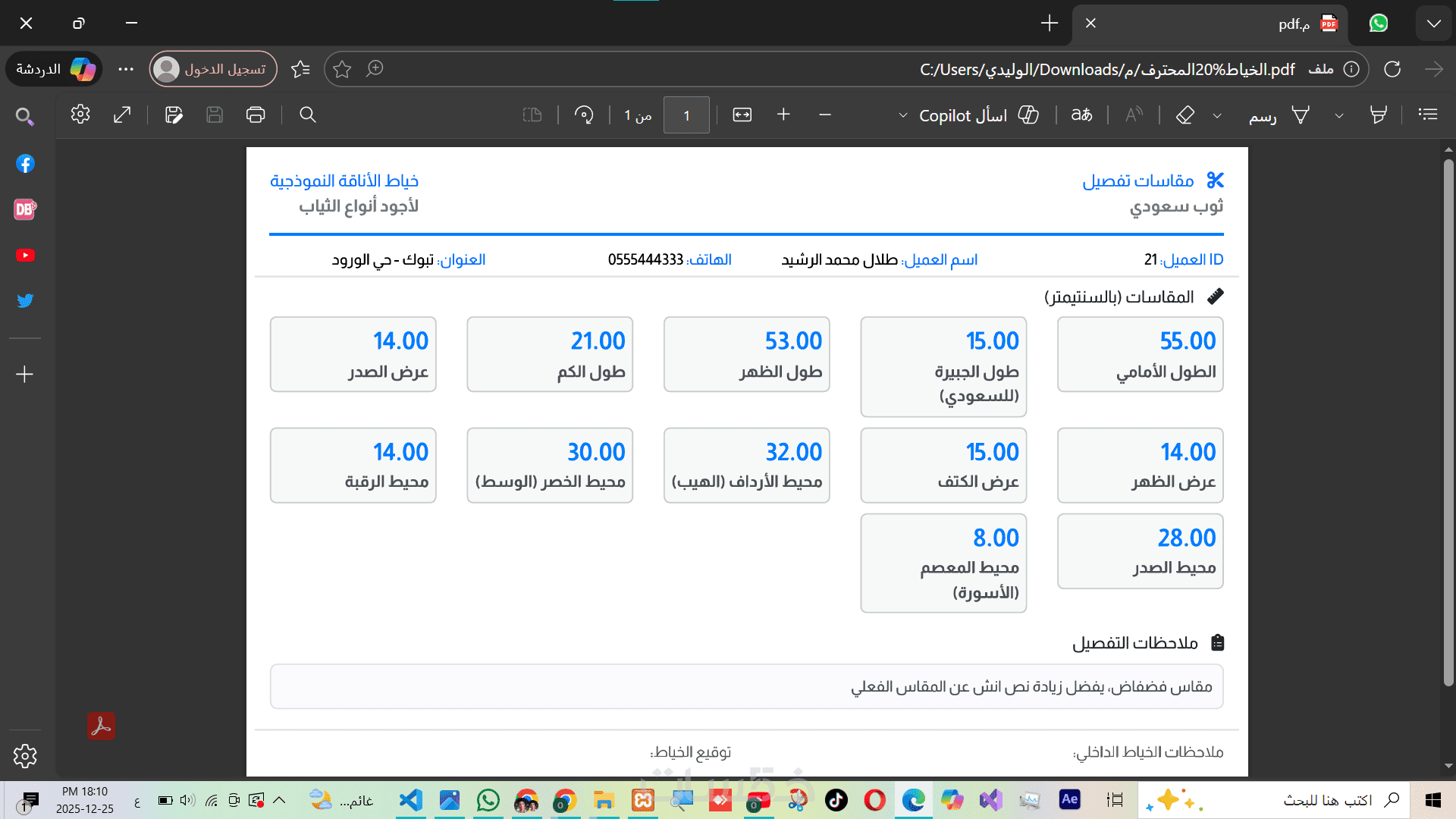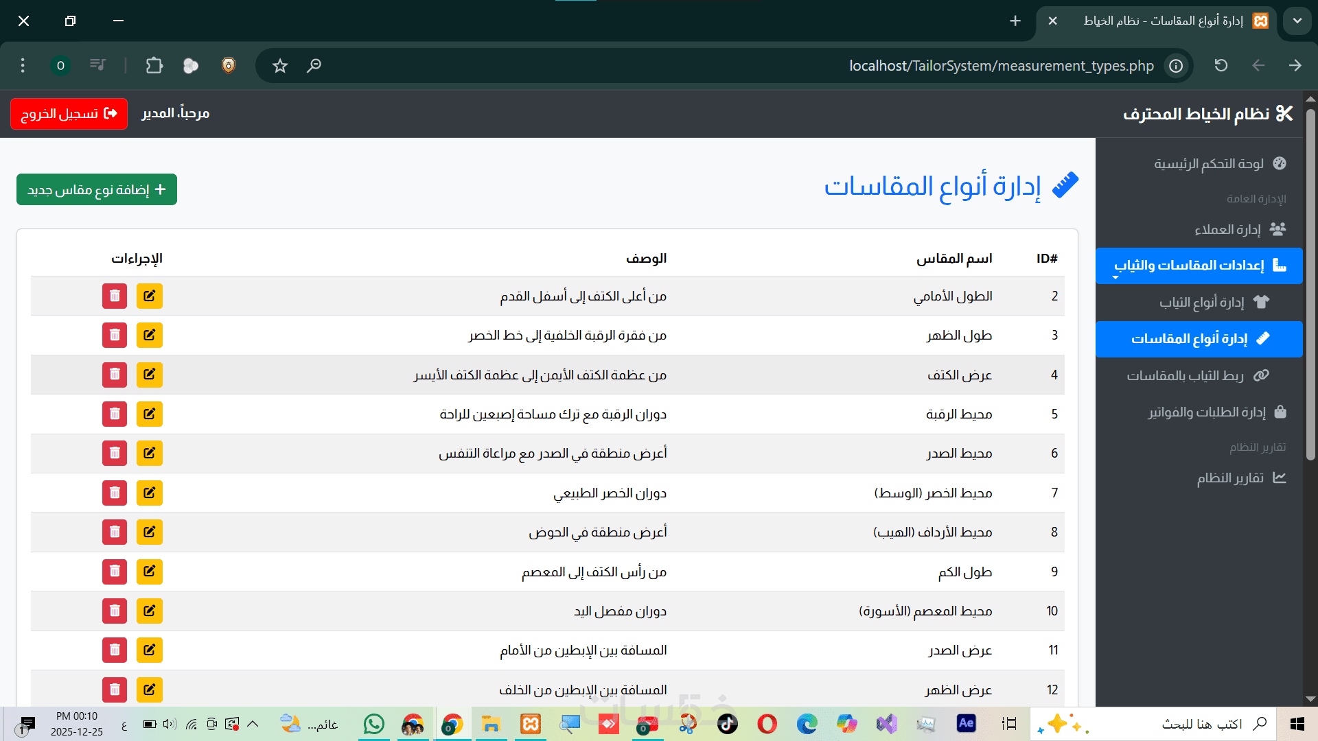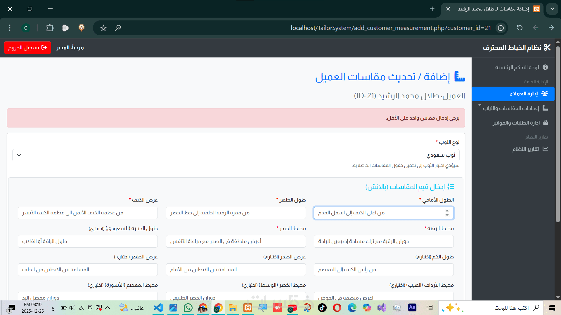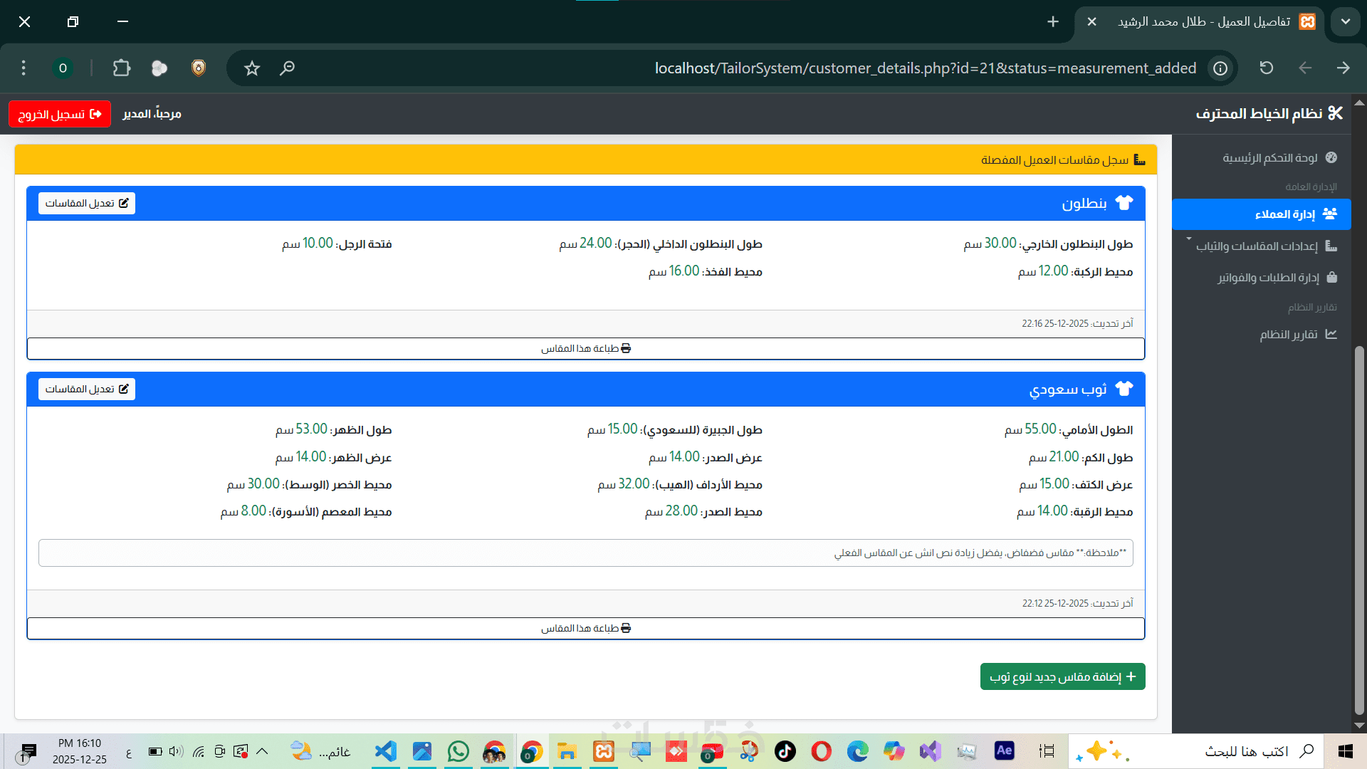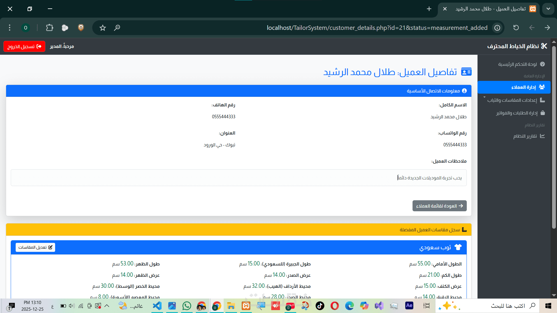 هل تعاني من ضياع سجلات المقاسات الورقية أو صعوبة تنظيم بيانات العملاء في مشغلك؟ أقدم لك نظاماً إلكترونياً (Web System) متكاملًا ومخصصًا لإدارة العملاء والمقاسات، تم بناؤه بهيكلة برمجية متطورة تتيح لك مرونة تامة في إضافة أي نوع من الثياب أو المقاسات دون قيود.