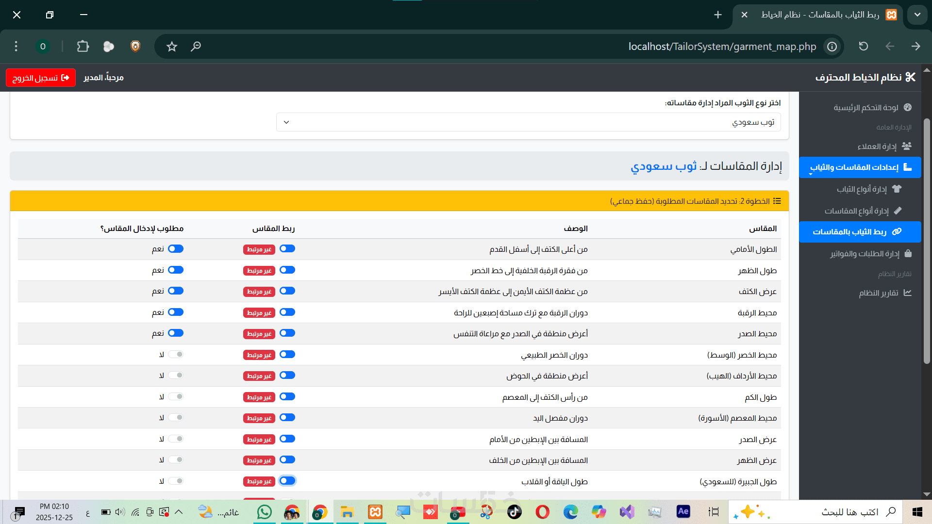 في هذي الواجهة يتم ربط نوع ثياب محدد بالمقاسات المناسبة له مع امكانية تحديد اي المقاس يعتبر اجباري او اختياري