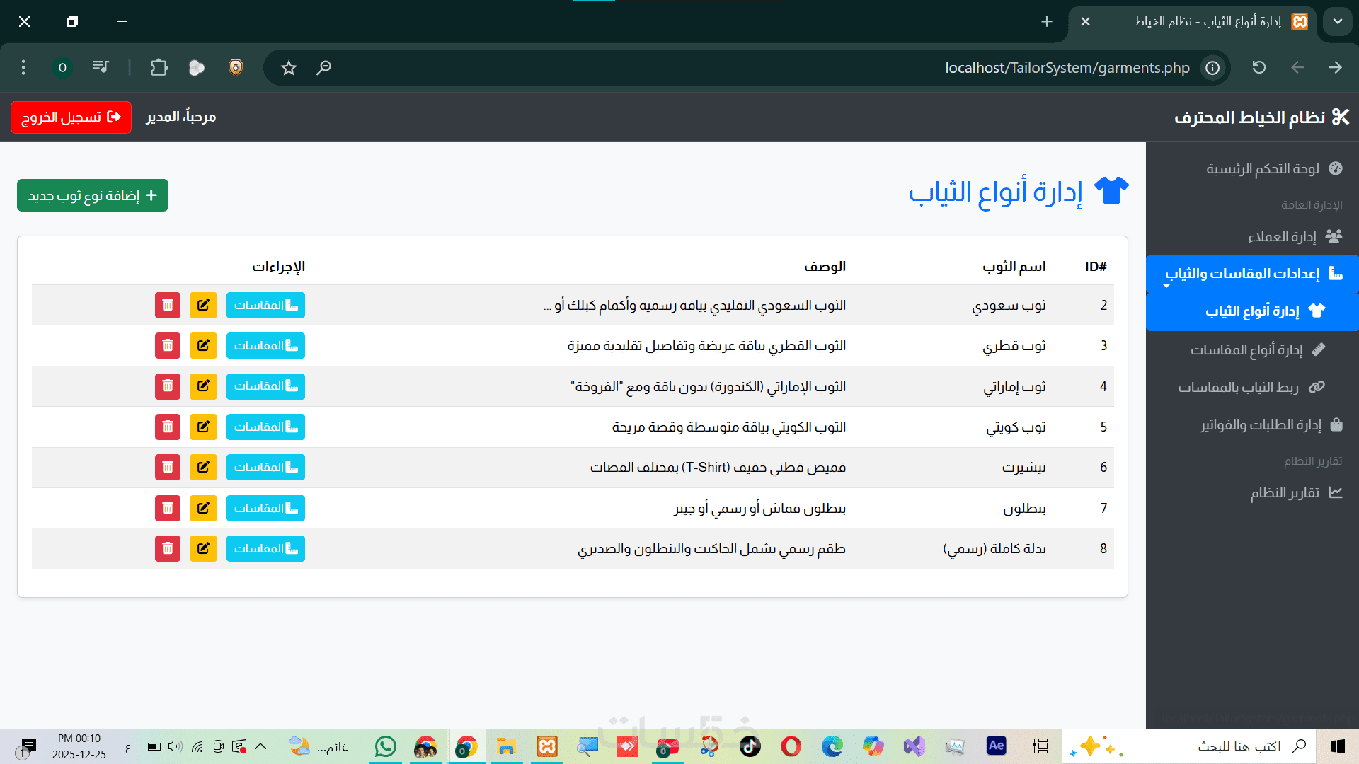 إمكانية إضافة عدد لا نهائي من أنواع الملابس (مثل: ثوب سعودي، ثوب كويتي، قميص) عبر نظام "Garment Types".