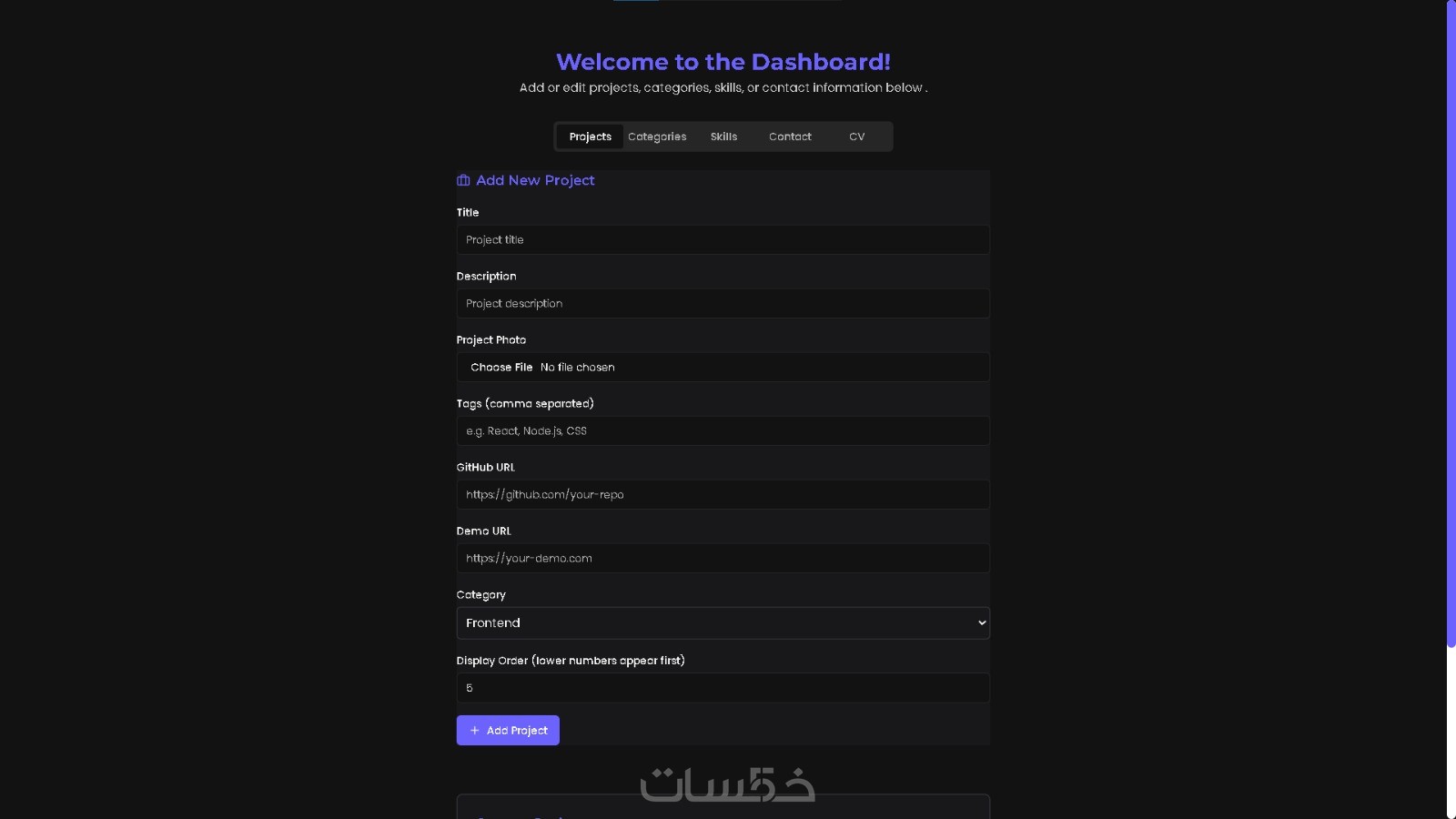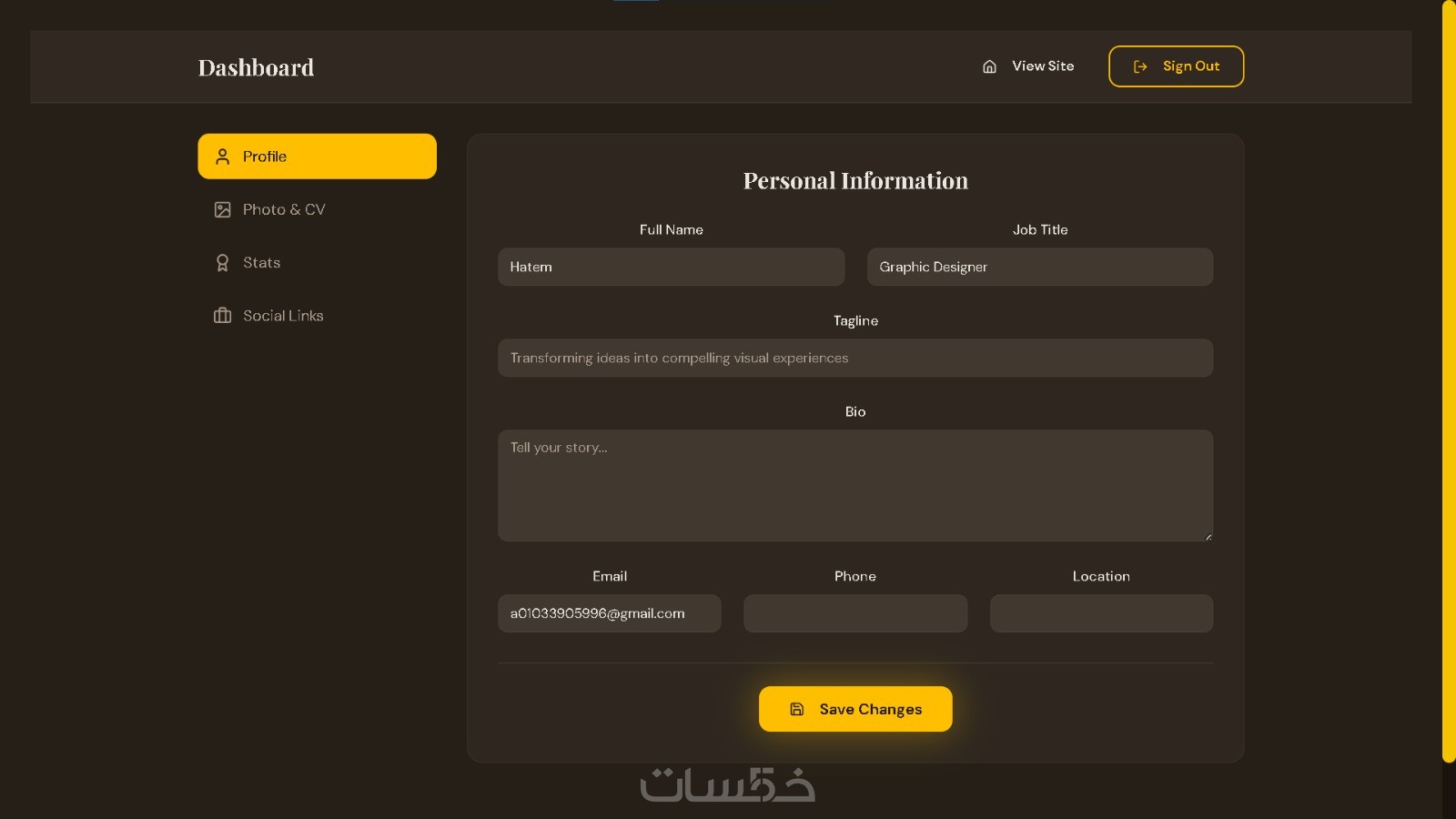 - صفحة لوحة التحكم: للتحكم الكامل في الموقع وتعديل واضافة المهارات والمشاريع الجديدة ورفع السيرة الذاتية والصورة الشخصية، محمية بايميلك الشخصي والباسوورد الخاص بالموقع وامكانية اضافة المزيد من الاعضاء (بموافقة ومراجعة صاحب الموقع) على صفحة لوحة التحكم لتولي مسؤولية ادارة الموقع.