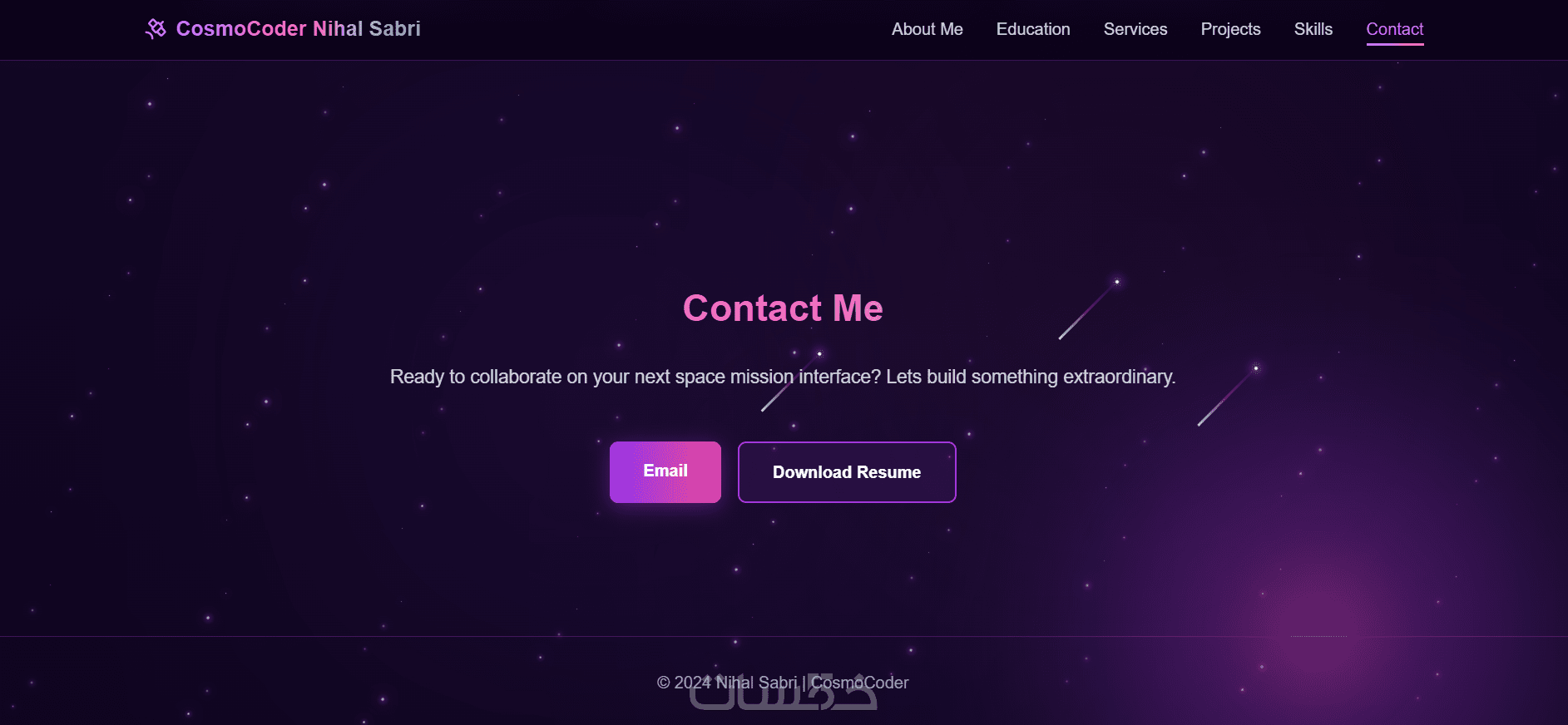 يحتوي علي ٦ أقسام.. قسم به نبذه تعريفية عنك وقسم للتعليم الاكاديمي وقسم للخدمات ما لخدمات التي تقدمها في تخصصك و قسم المشاريع يشمل نماذج من اعمالك السابقة بحيث يشجع الاخرين علي الوثوق بك ومعرفتك جيدا وقسم المهارات يشمل مهارات تقنية ومهارات ناعمة و قسم تواصل معنا متل بعنوان بريدك الالكتروني وزرار لتنزيل السيرة الذاتية الخاصة بك