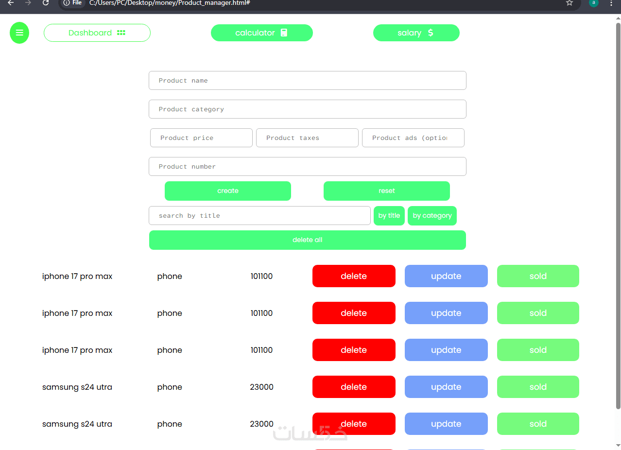 جميع البيانات يتم حفظها باستخدام LocalStorage وتبقى محفوظة حتى بعد إغلاق المتصفح.