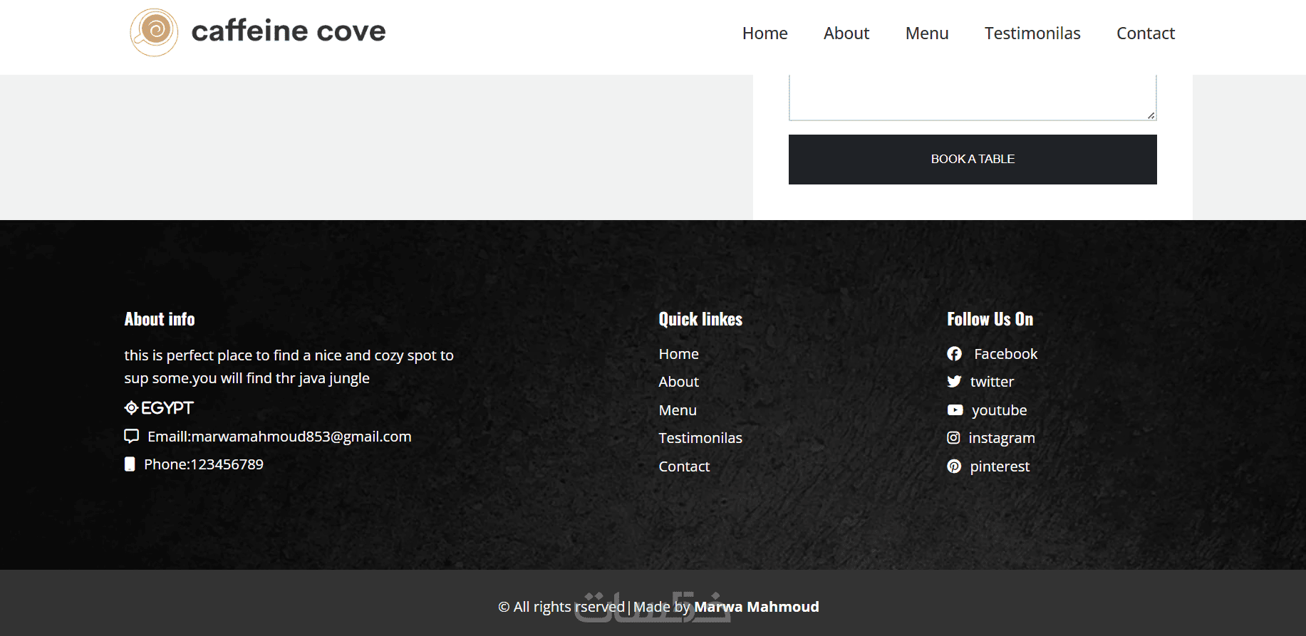 فوتر يحتوي على روابط سريعة ومعلومات التواصل وحسابات السوشيال ميديا.