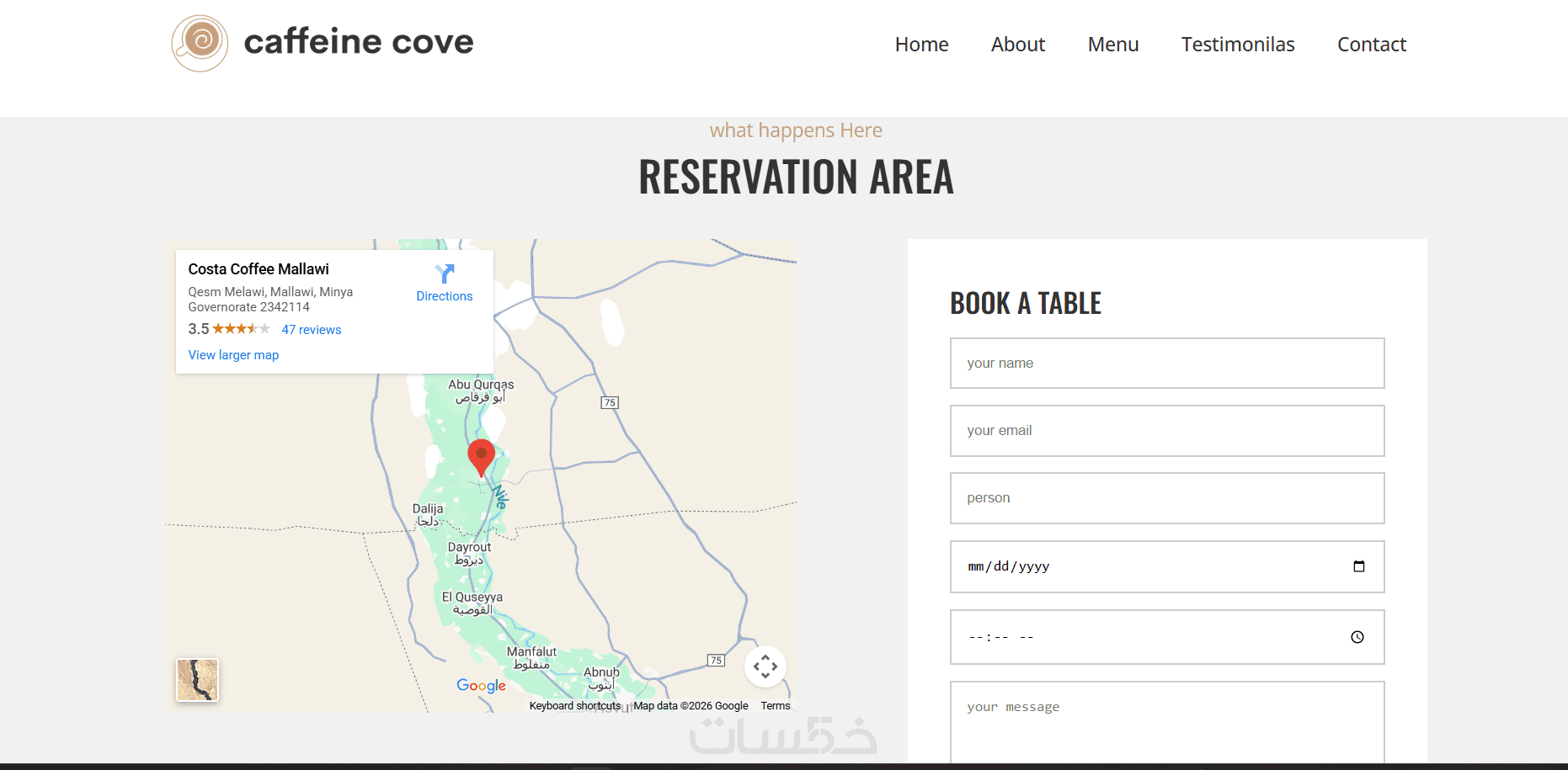 صفحة تواصل وحجز طاولة مع نموذج إدخال بيانات وخريطة جوجل.