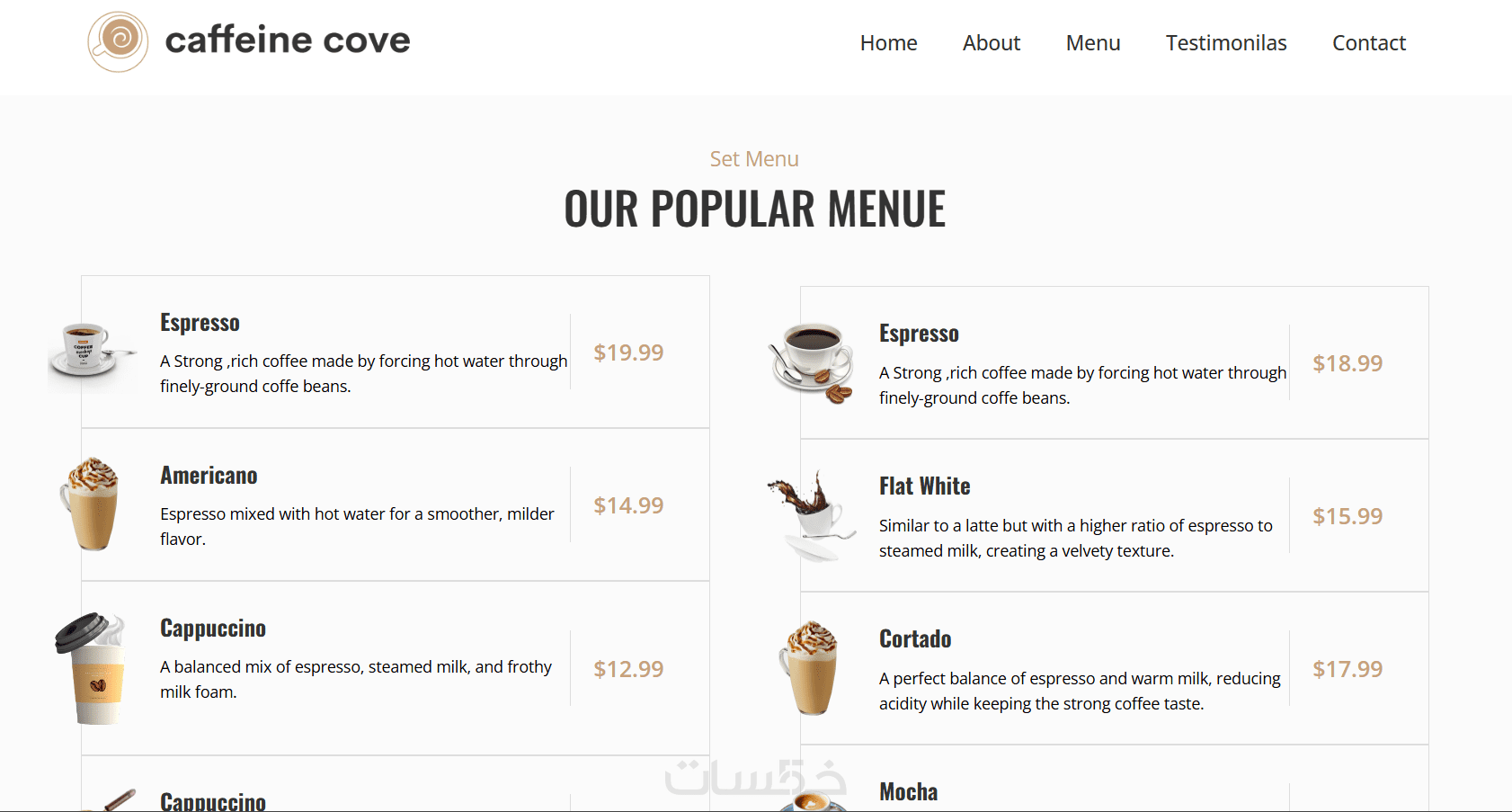قائمة مشروبات/أطعمة مع صور وأسعار.