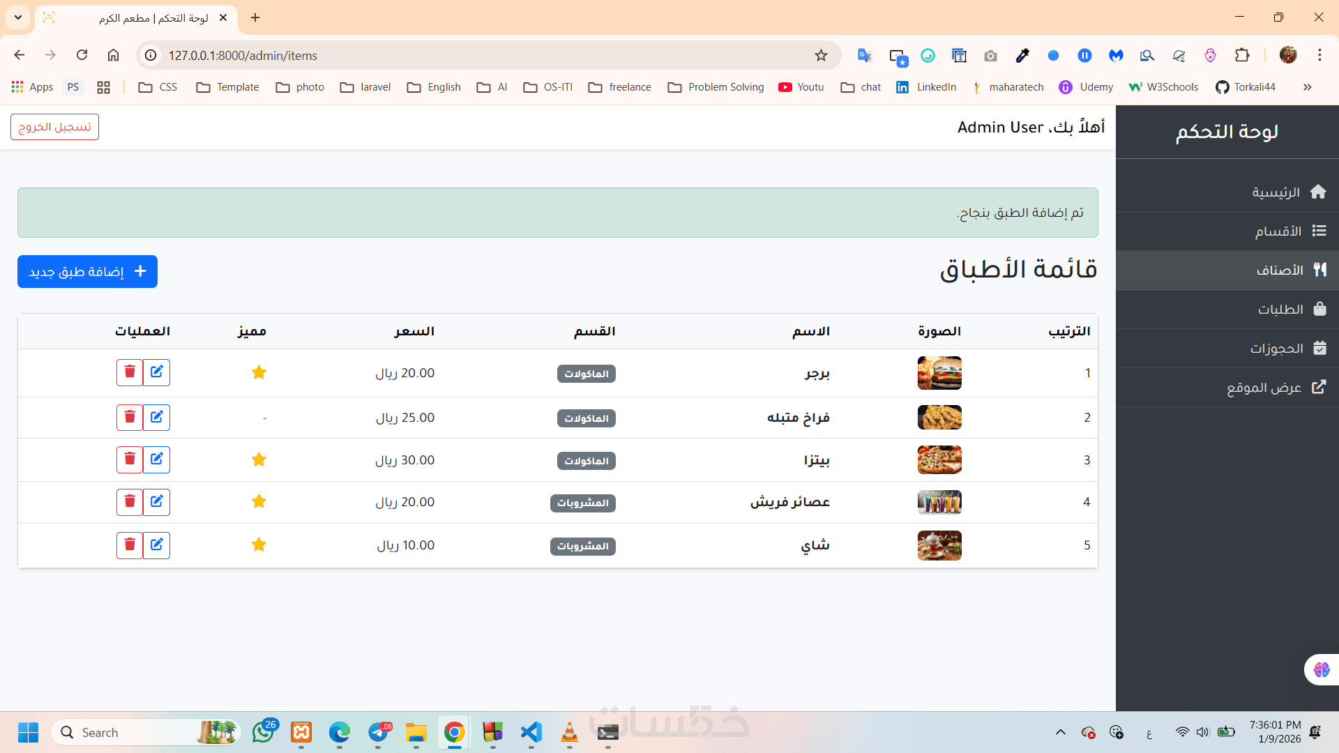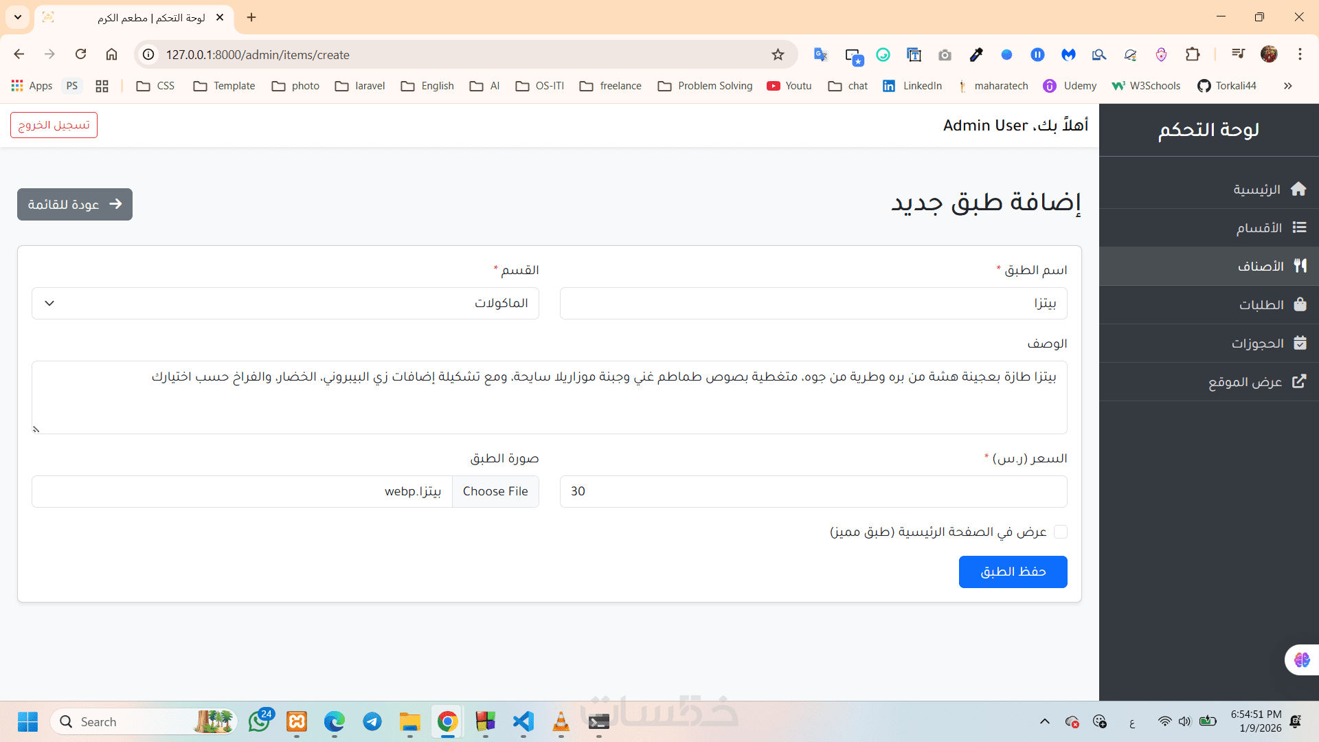 إضافة وتعديل الأصناف مع الاسم، الوصف، السعر، والصورة