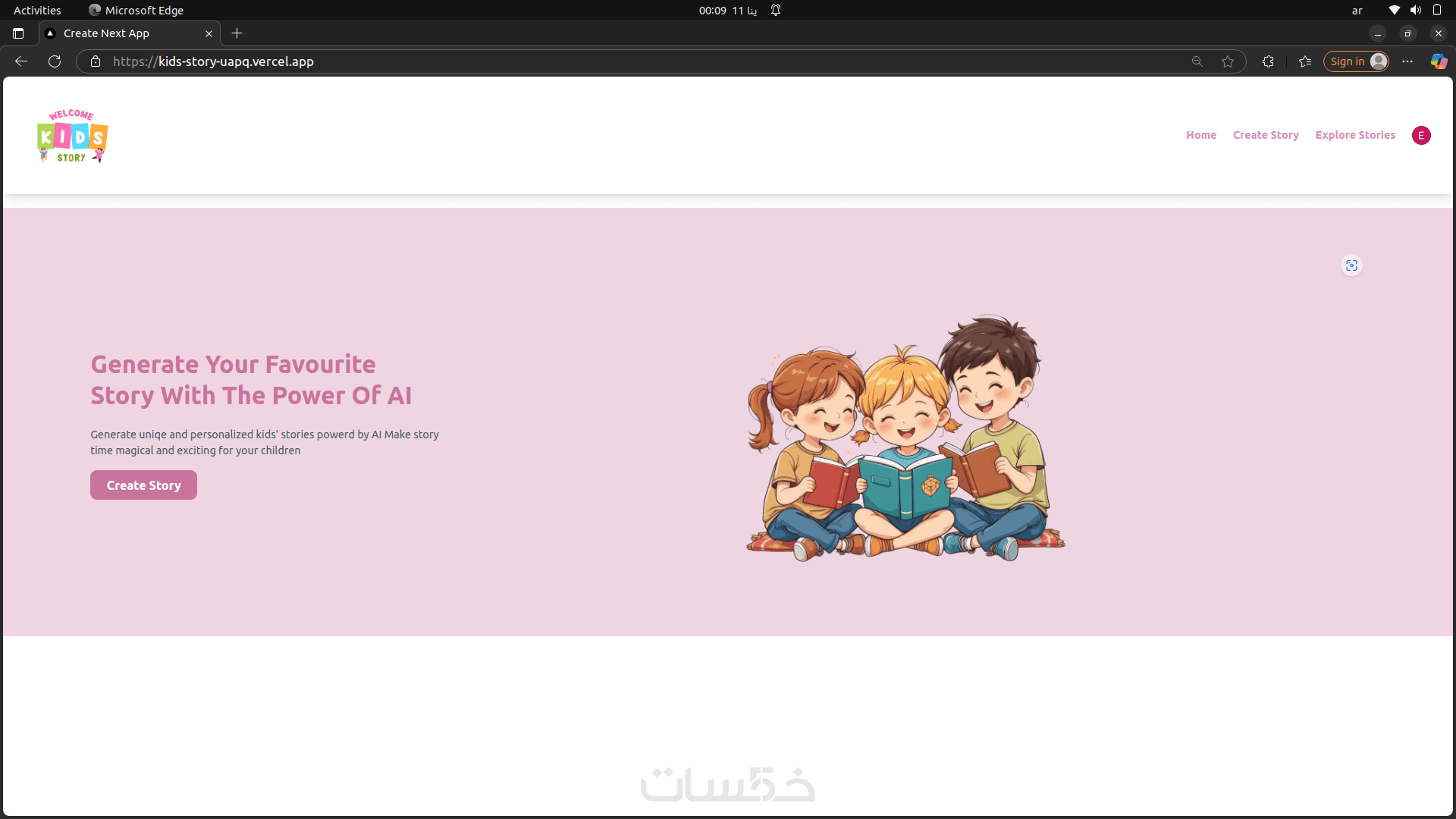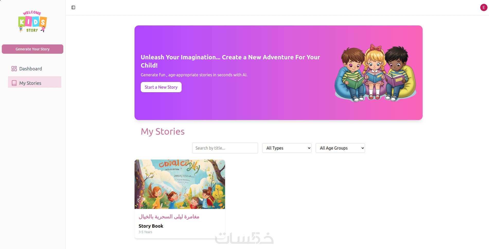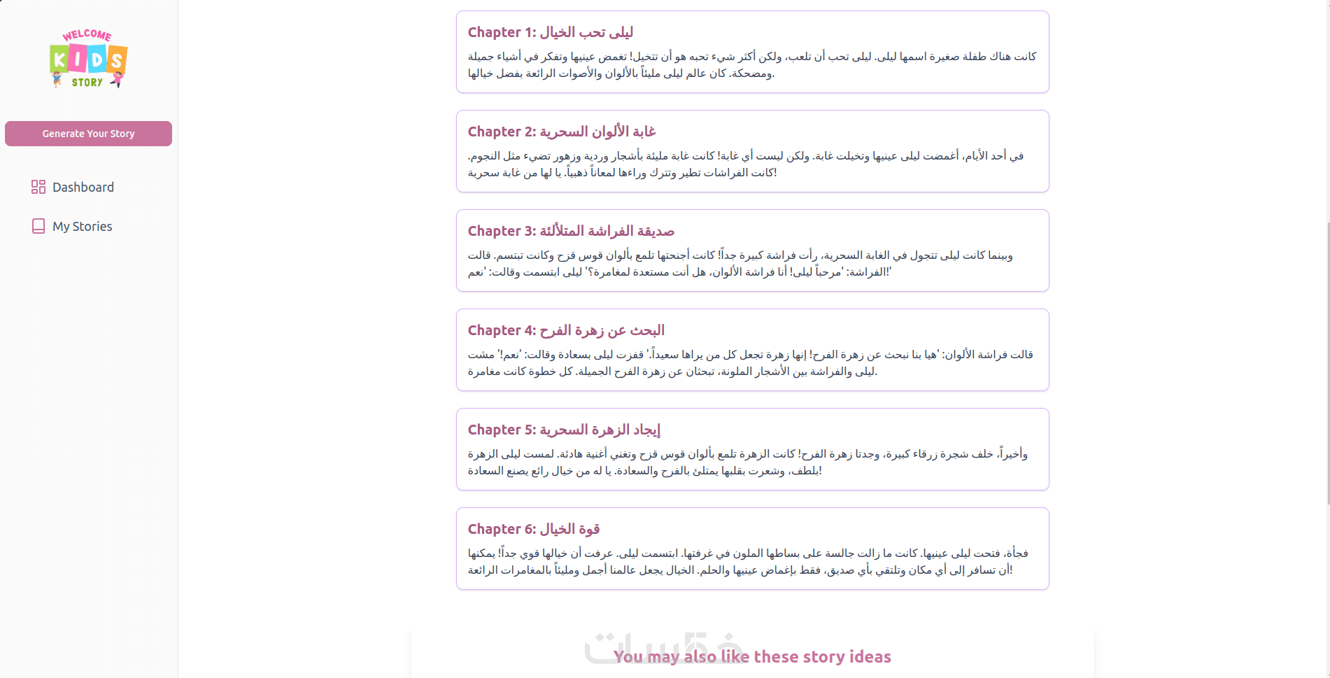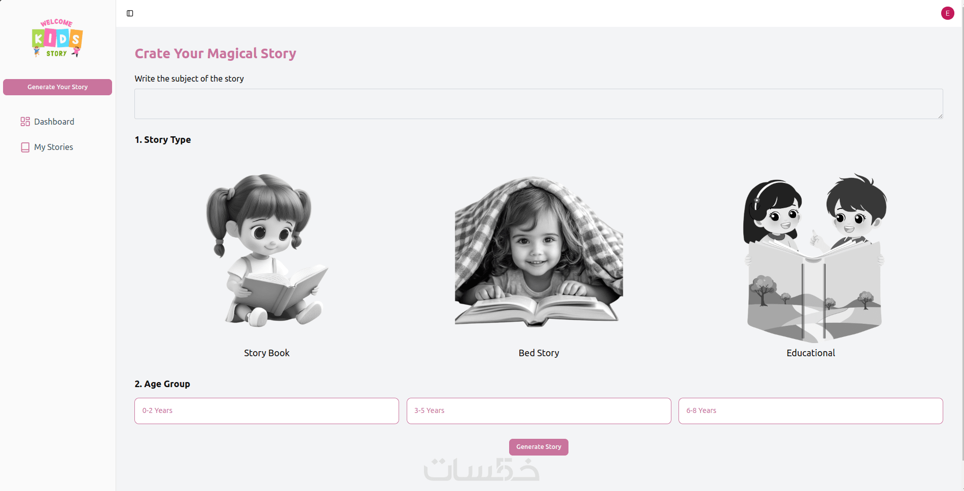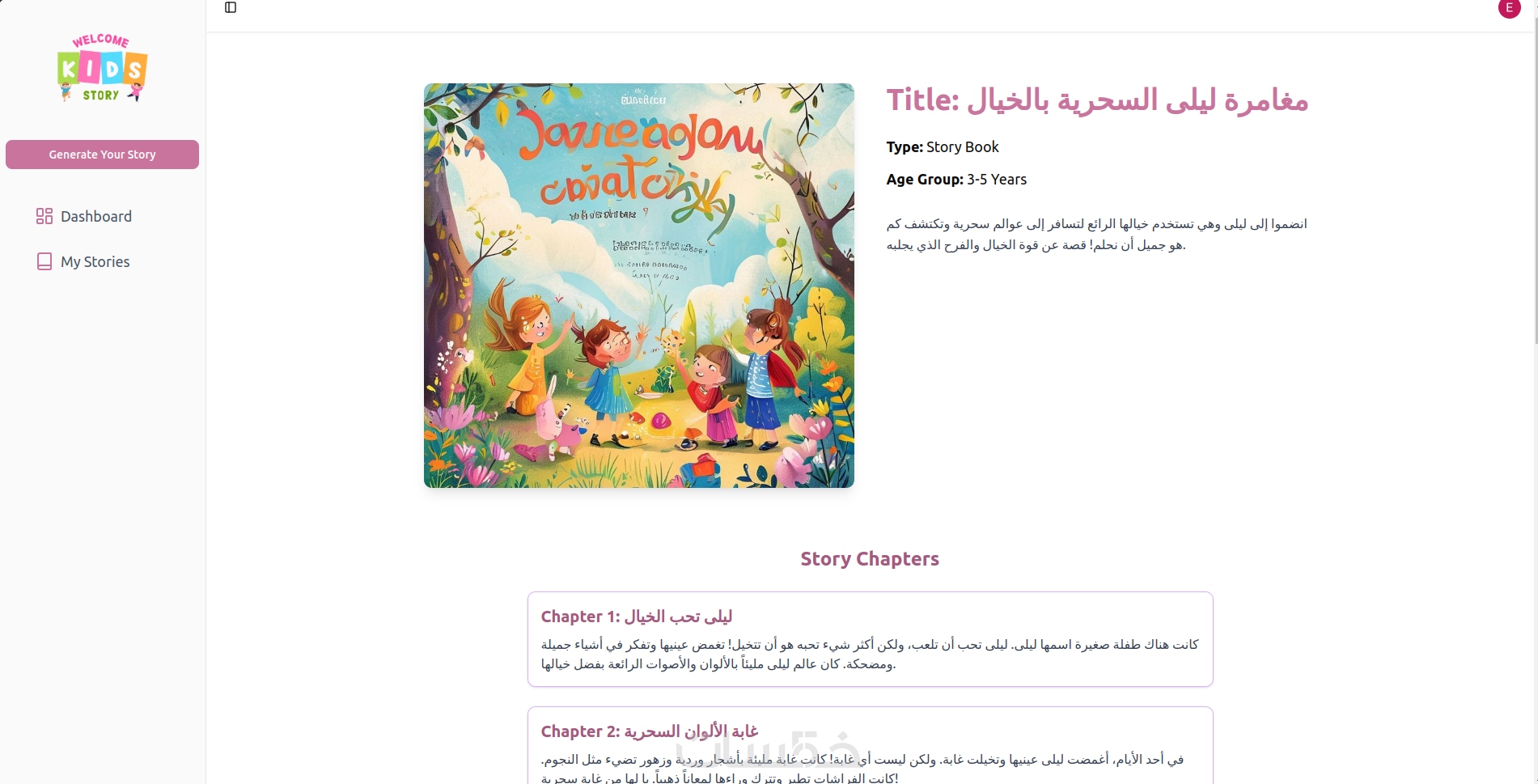 الخدمة الأساسية تحاكي تجربة توليد قصص الأطفال بالذكاء الاصطناعي، بحيث يمكن للمستخدم إدخال العمر، نوع القصة، والشخصيات، ومعاينة القصة مباشرة على الصفح