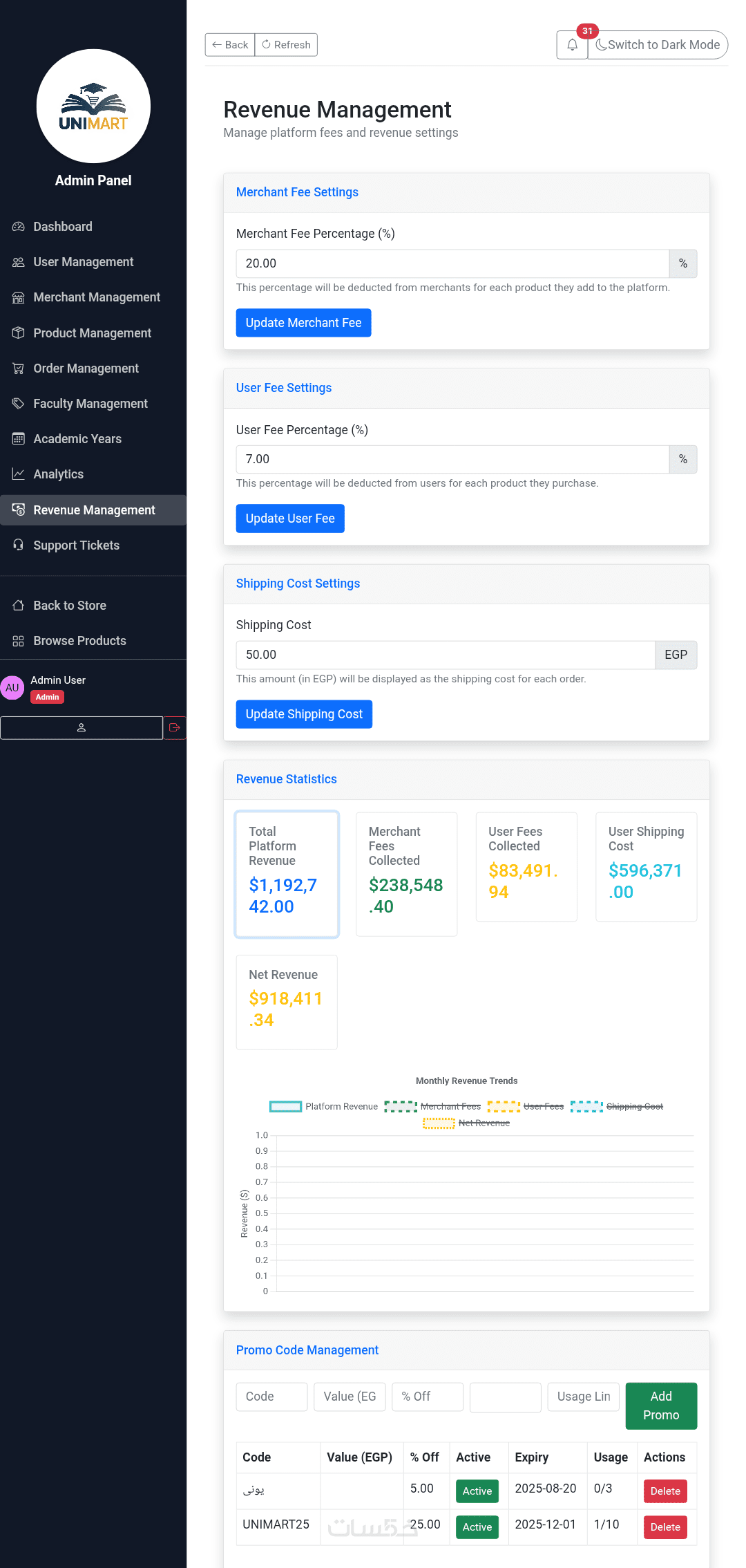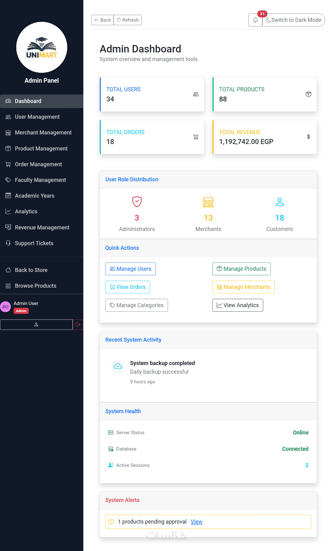 نظام صلاحيات (Admin / User):تحديد صلاحيات المستخدمين والتحكم في الوصول للصفحات والوظائف.