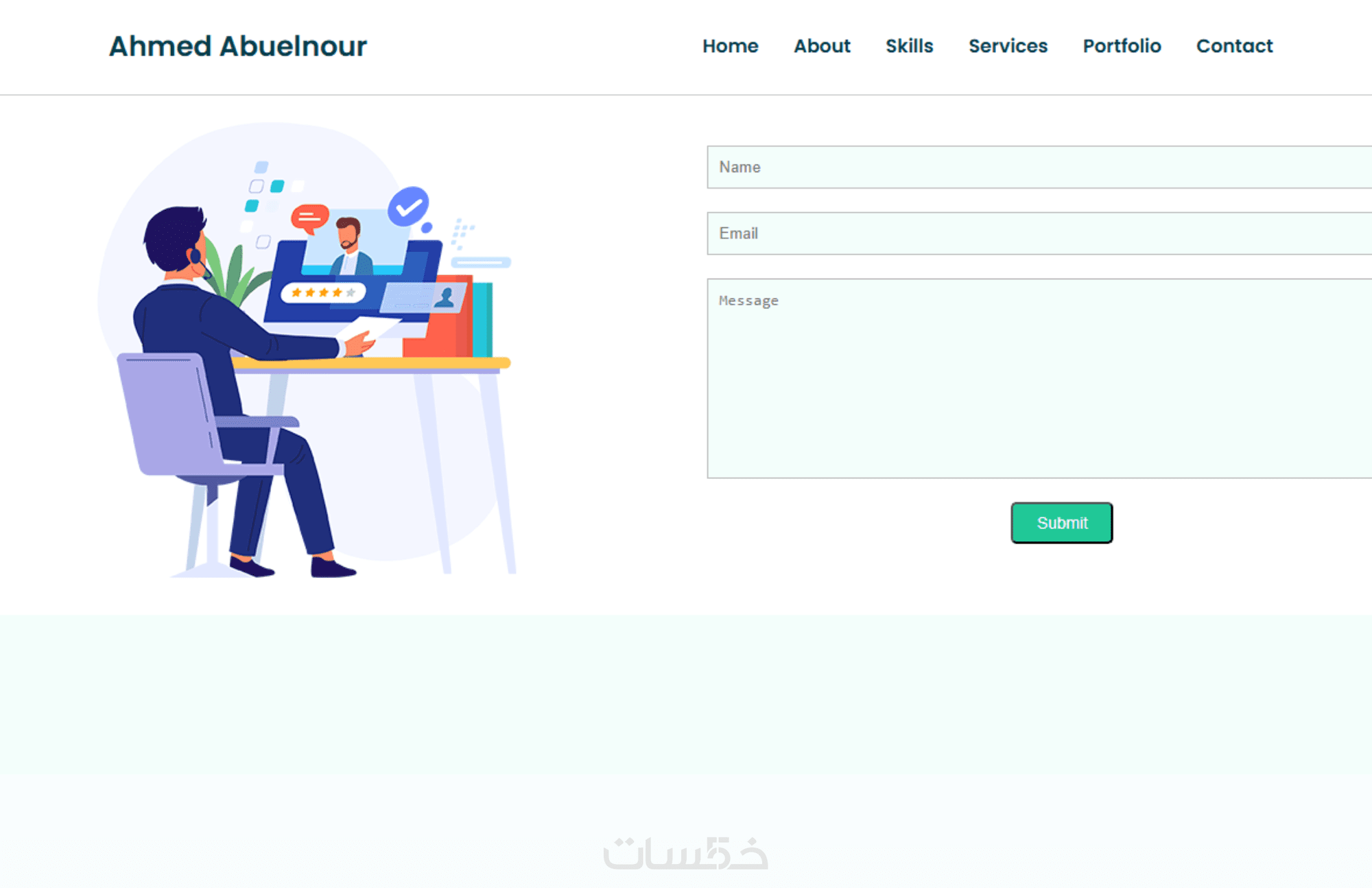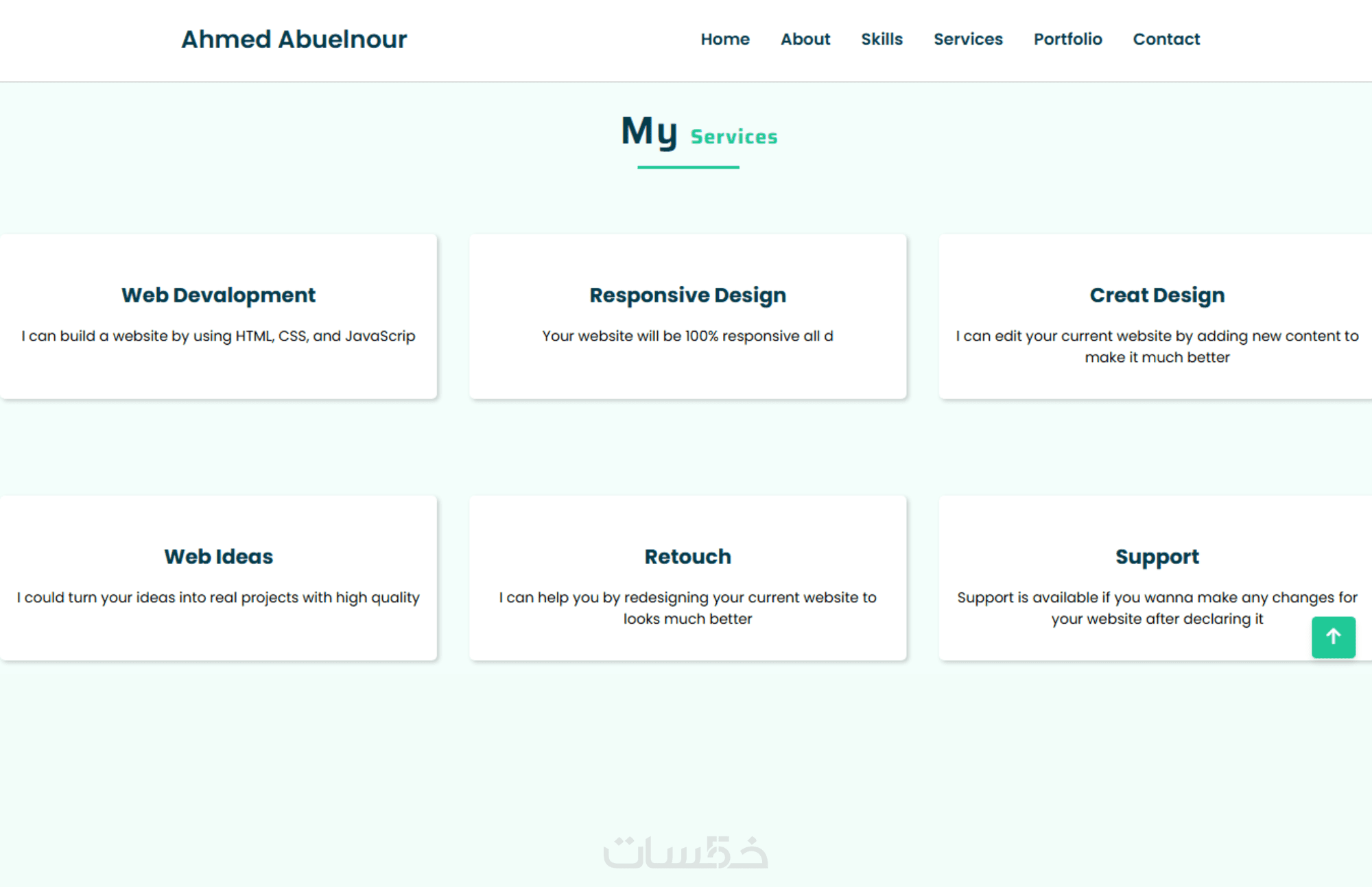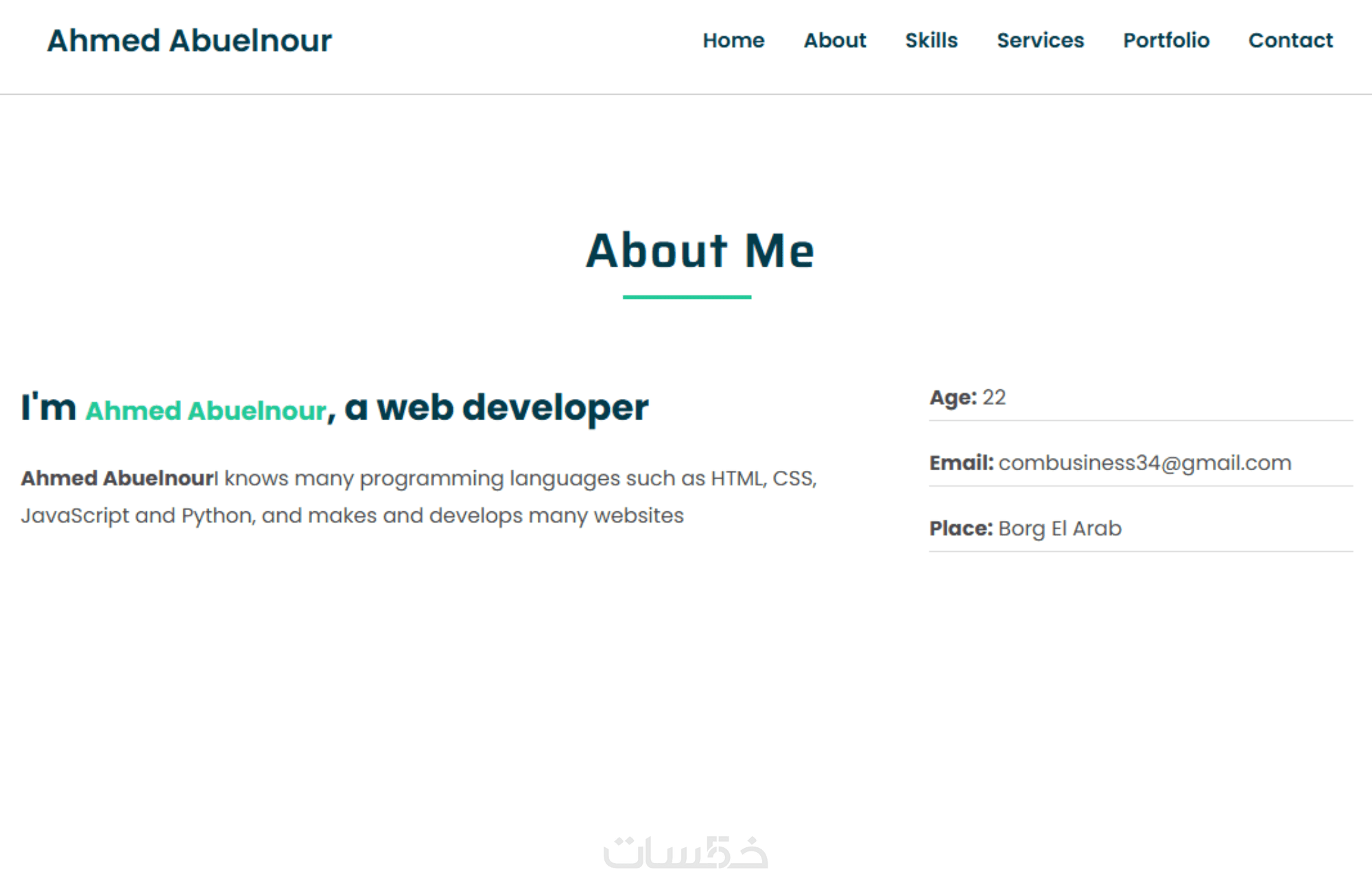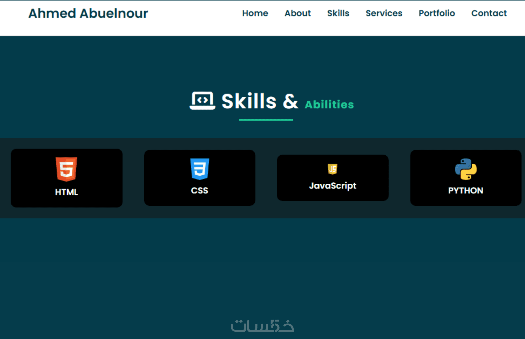أقسام جاهزة ومُنظمة: Home – About – Skills – Services – Portfolio – Contact.