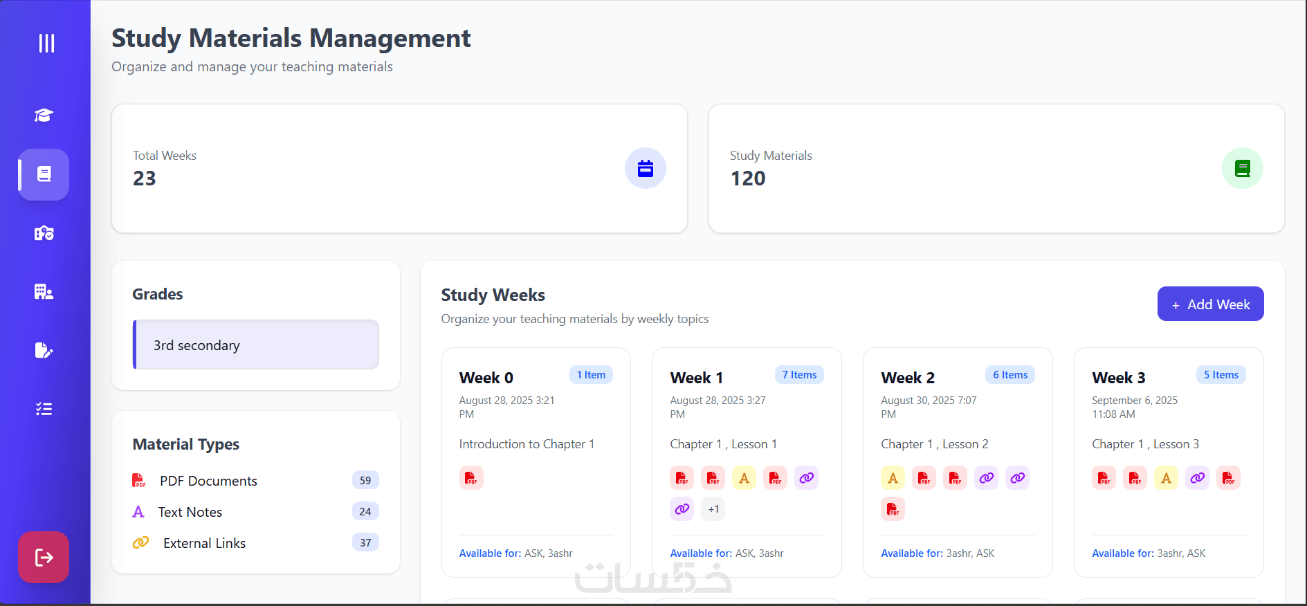 رفع المواد الدراسية بشكل أسبوعي والتحكم في صلاحية ظهورها للطلاب