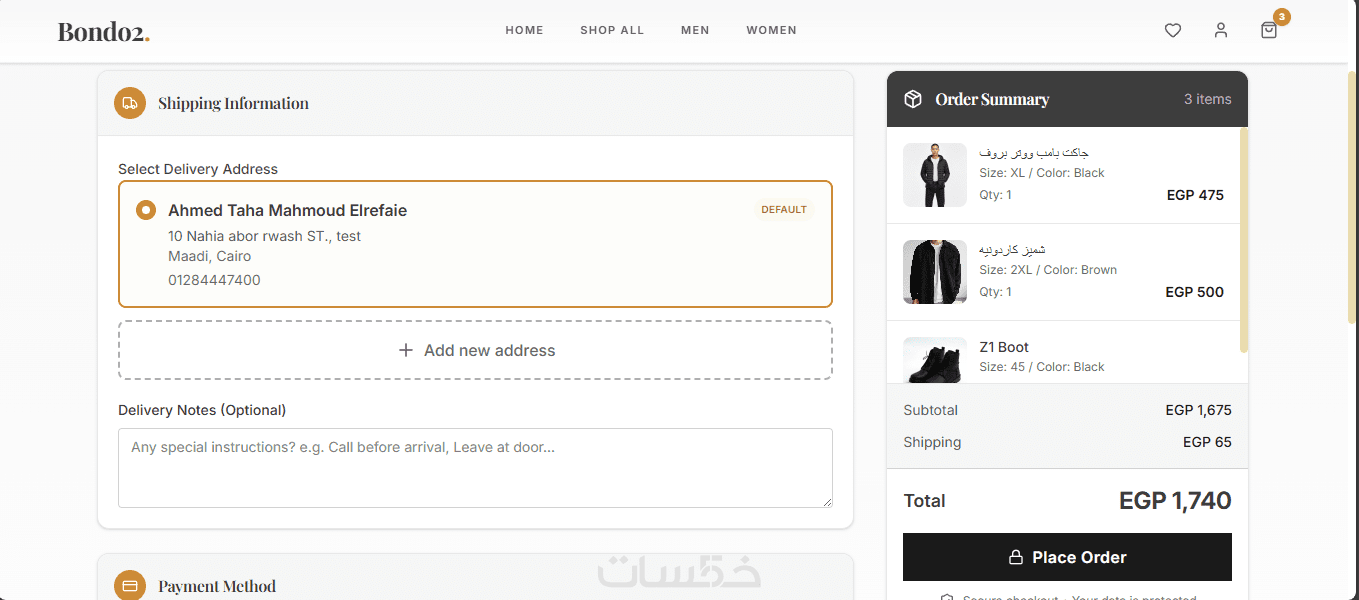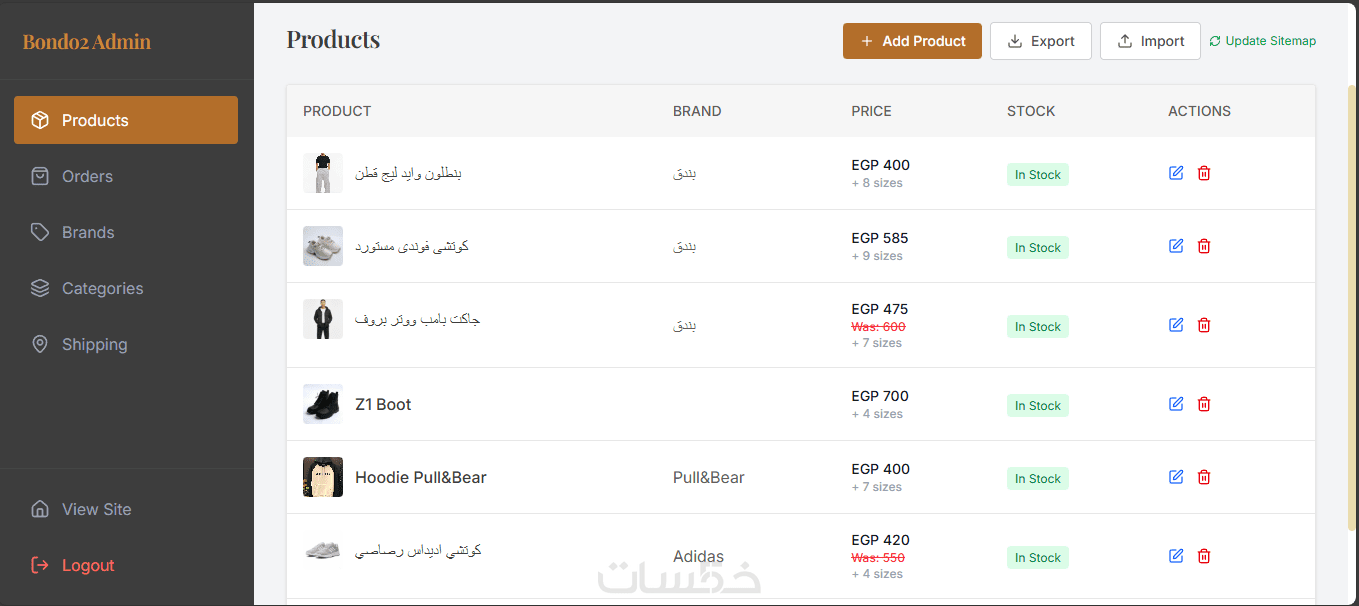 لوحة تحكم (Admin Dashboard): لوحة تحكم متكاملة وسهلة الاستخدام لإدارة (الطلبات، المنتجات، الأقسام، والبراندات, اسعار الشحن لكل محافظة و احياء داخلها) دون الحاجة لخبرة برمجية.