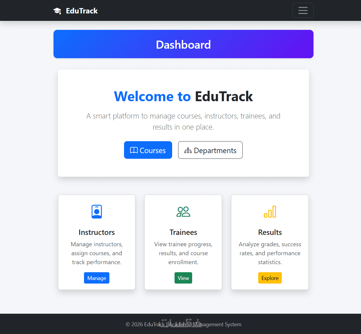 النظام يتيح إنشاء حسابات المستخدمين وتسجيل الدخول، وإدارة الكورسات والأقسام والمدربين والمتدربين، مع عرض النتائج وتحليل حالة النجاح أو الرسوب بطريقة منظمة وسهلة الاستخدام.