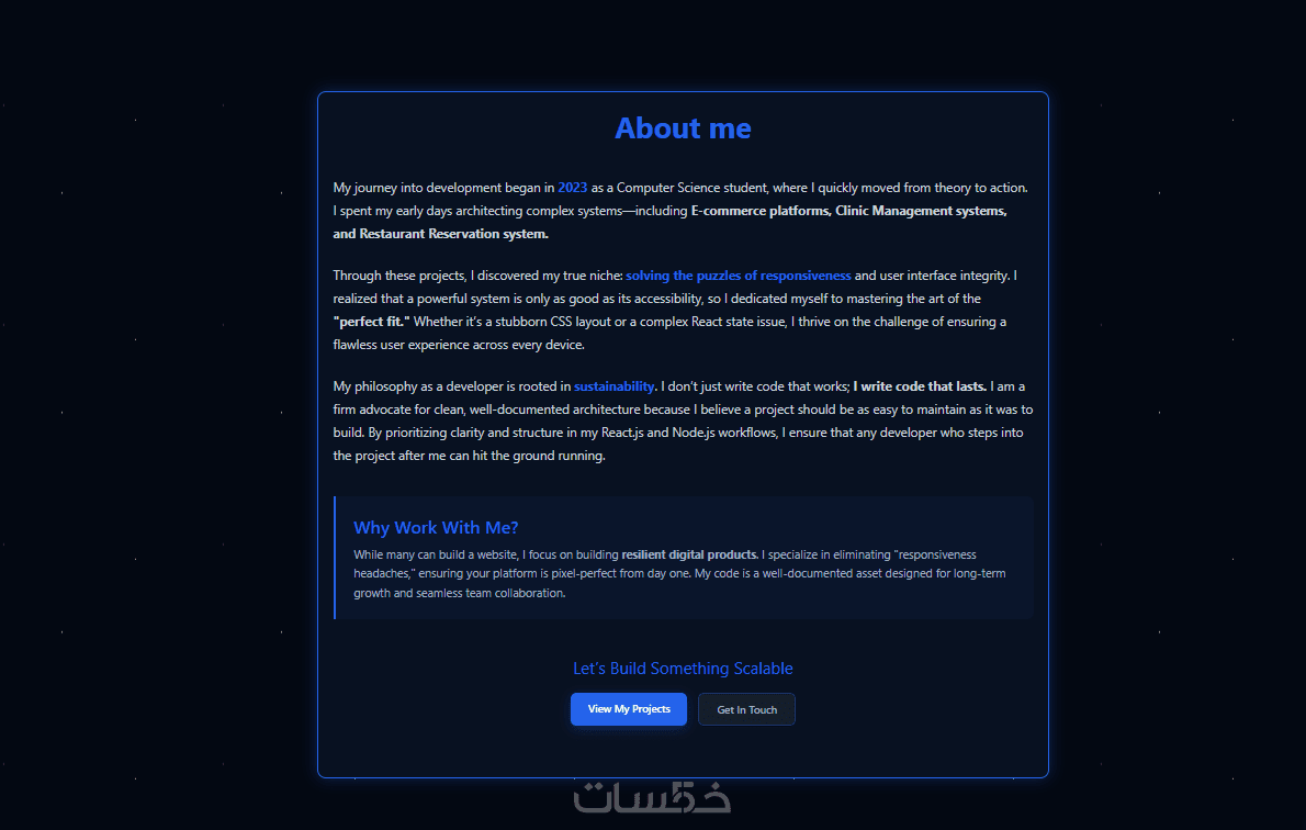 أنا هنا لتحويل رؤيتك إلى واقع رقمي ملموس. لا تتردد في مراسلتي الآن لنناقش تفاصيل مشروعك ونبدأ فوراً في بناء واجهة تليق بك!