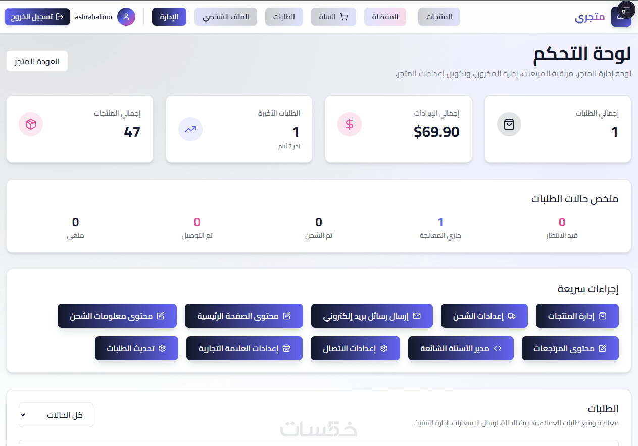 • لوحة تحكم لإدارة المنتجات والطلبات