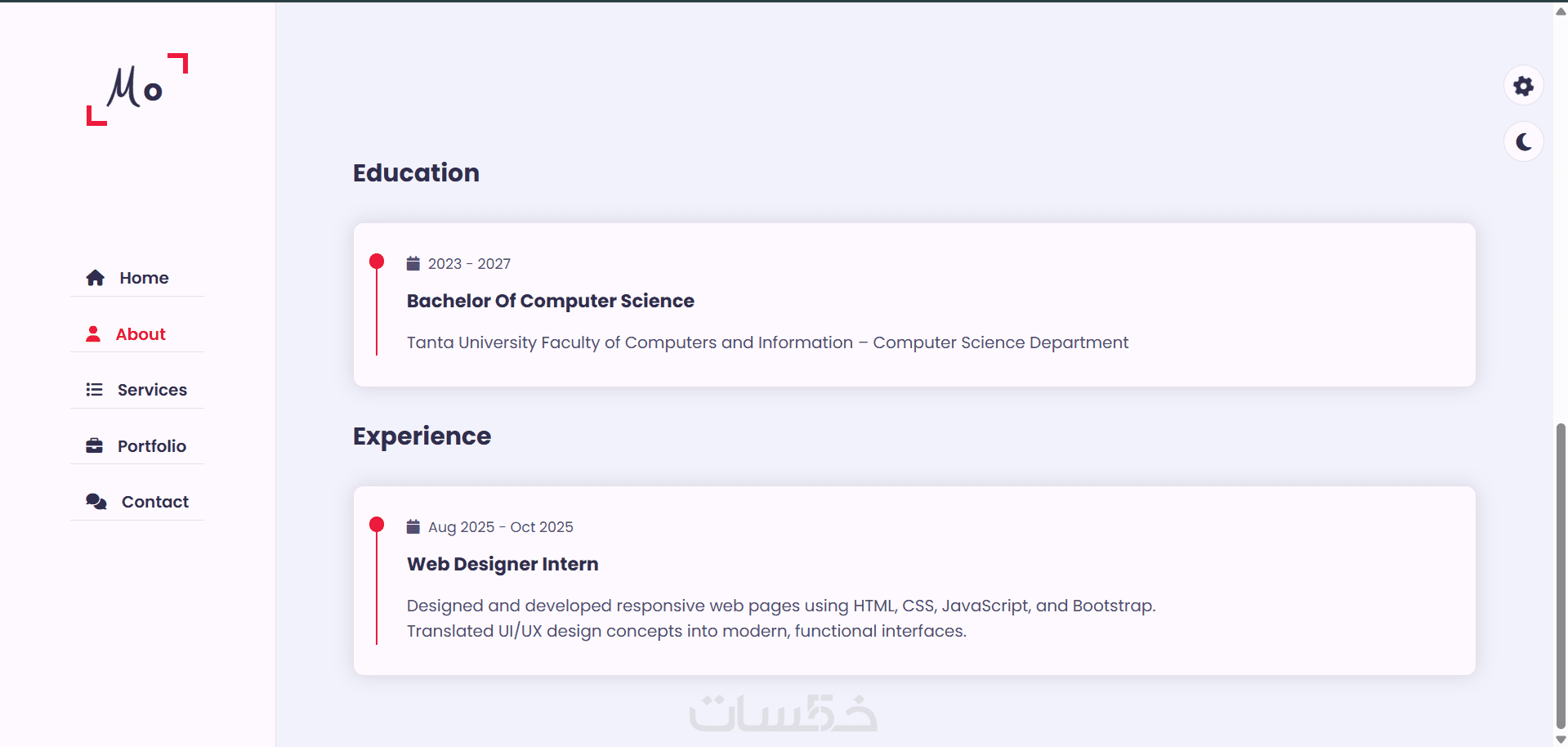 * وسائل التواصل: ربط حساباتك (LinkedIn, GitHub, Behance) ونموذج تواصل.