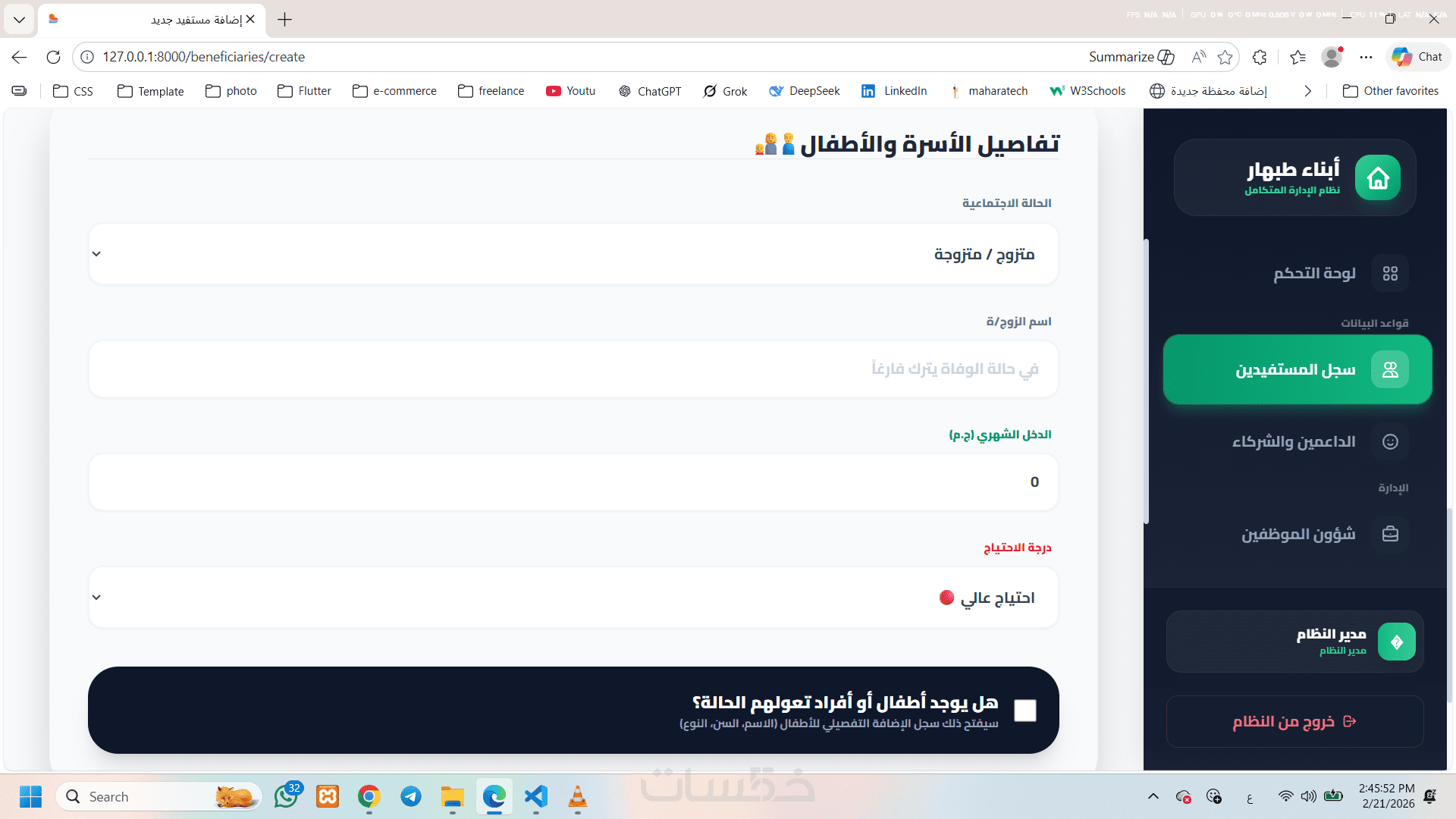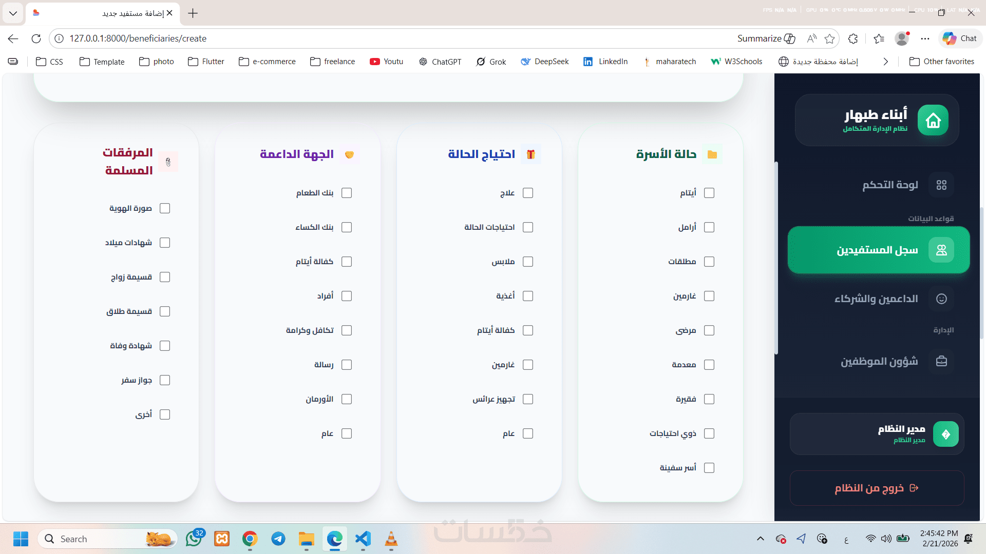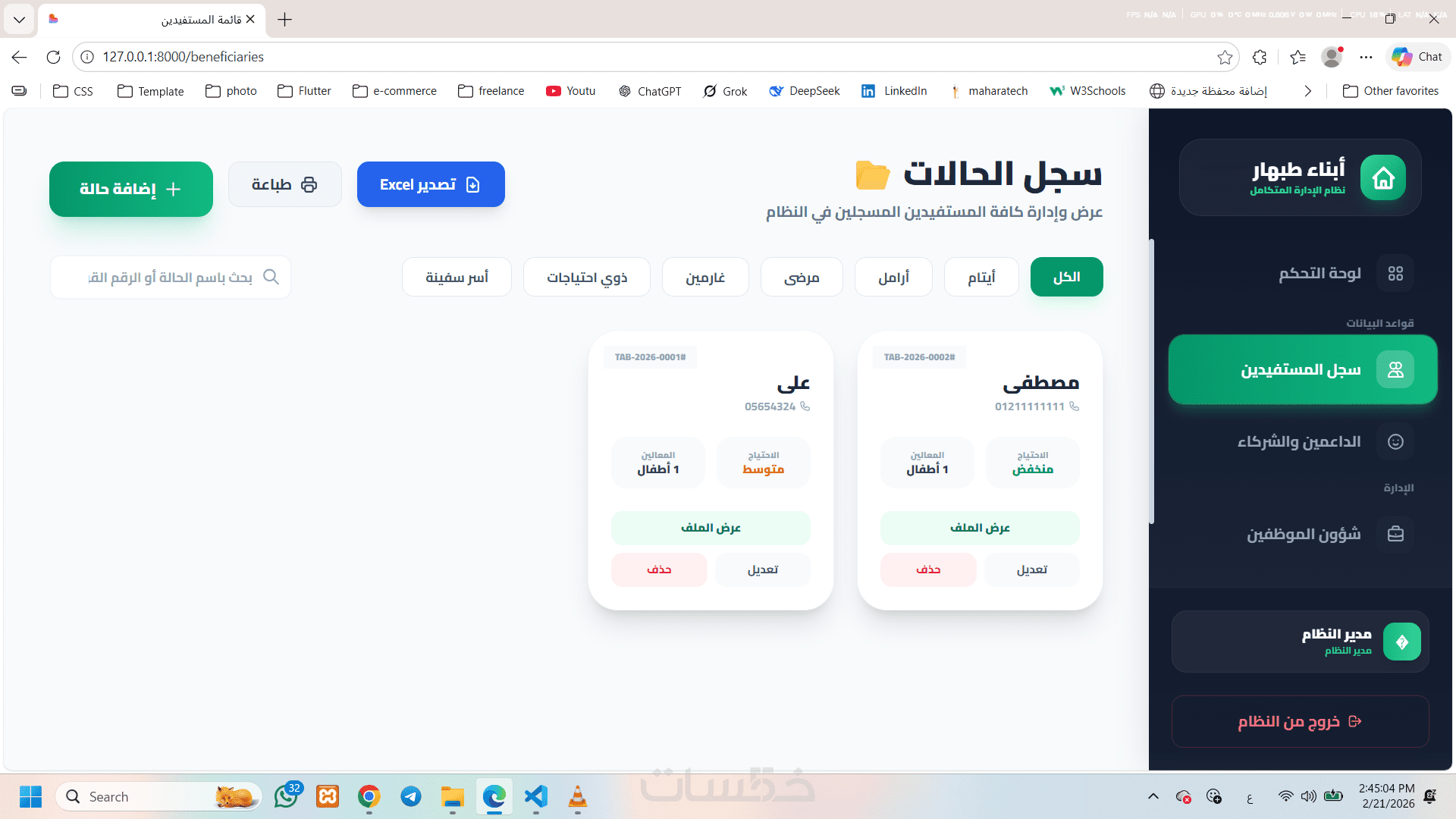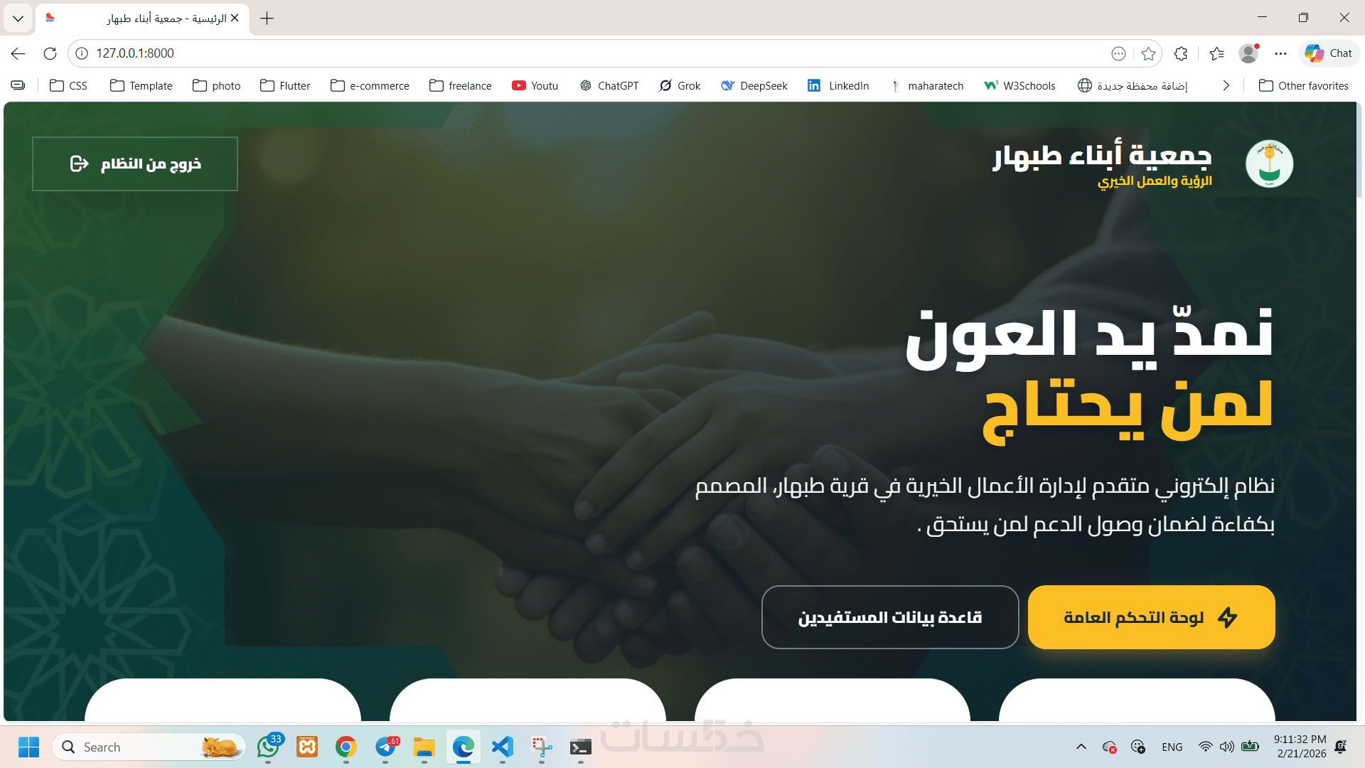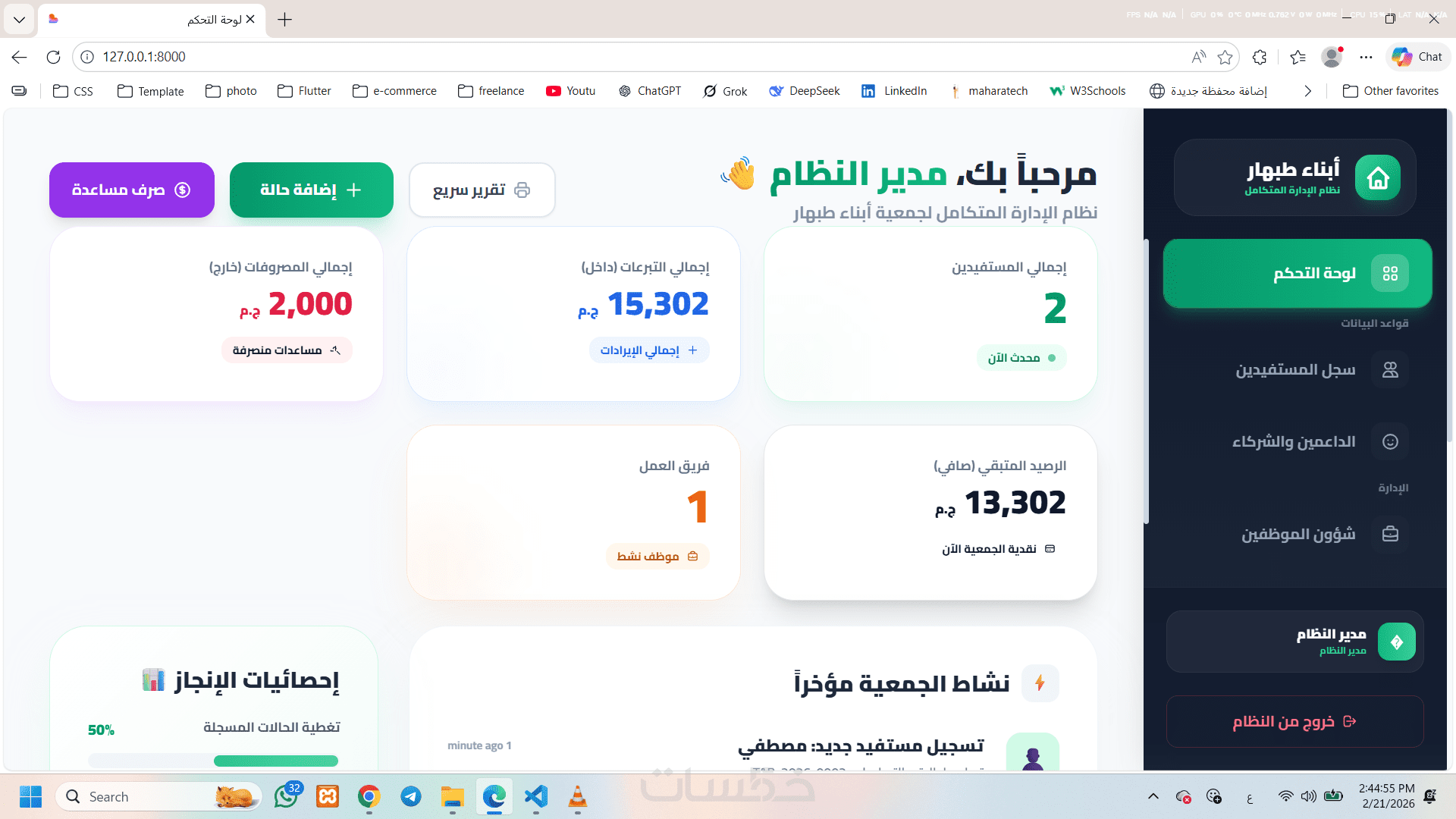 نظام إلكتروني متكامل لإدارة أعمال الجمعية الخيرية، يهدف إلى تنظيم بيانات المستفيدين والداعمين والموظفين وإدارة المساعدات بطريقة احترافية وسهلة الاستخدام.