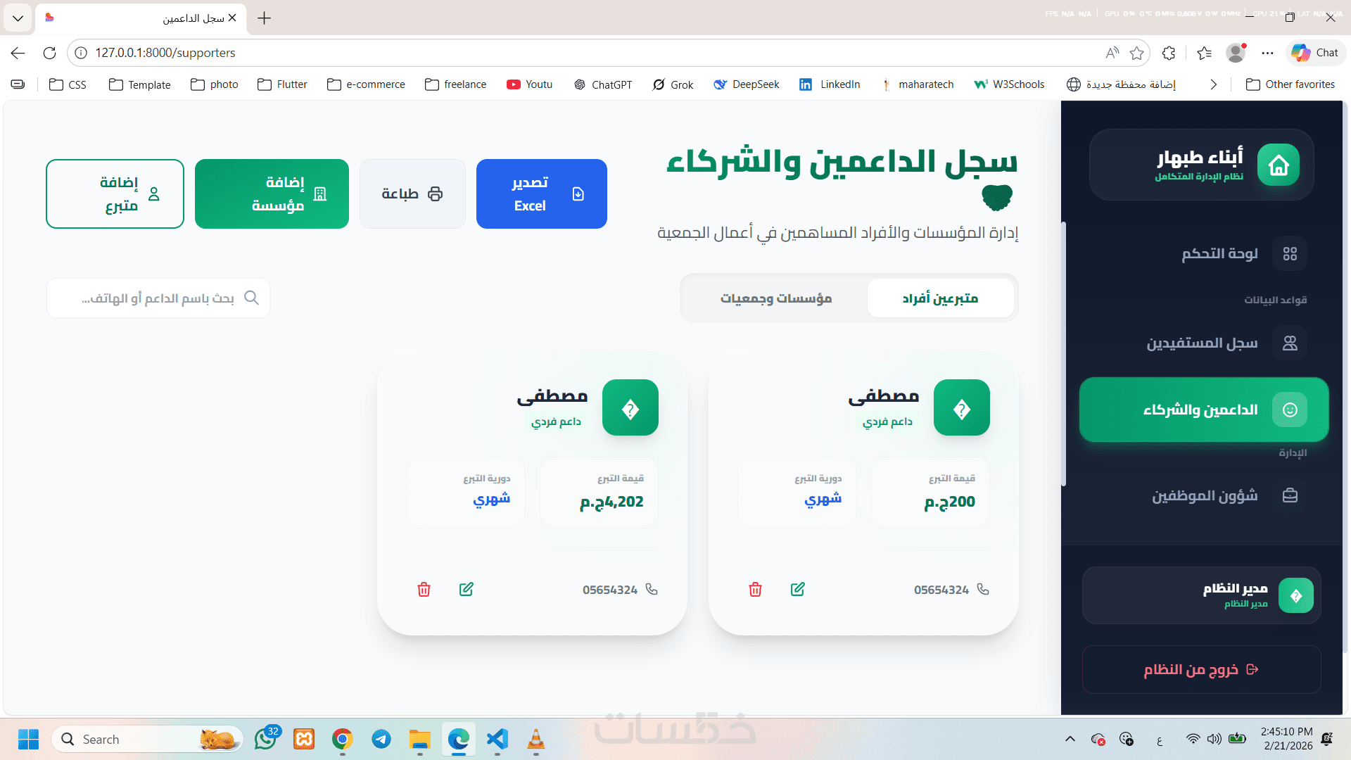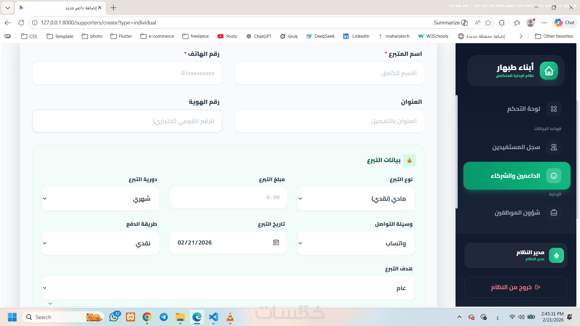 تسجيل بيانات الداعمين (مؤسسات وأفراد) وتوثيق نوع الدعم ومواعيده.