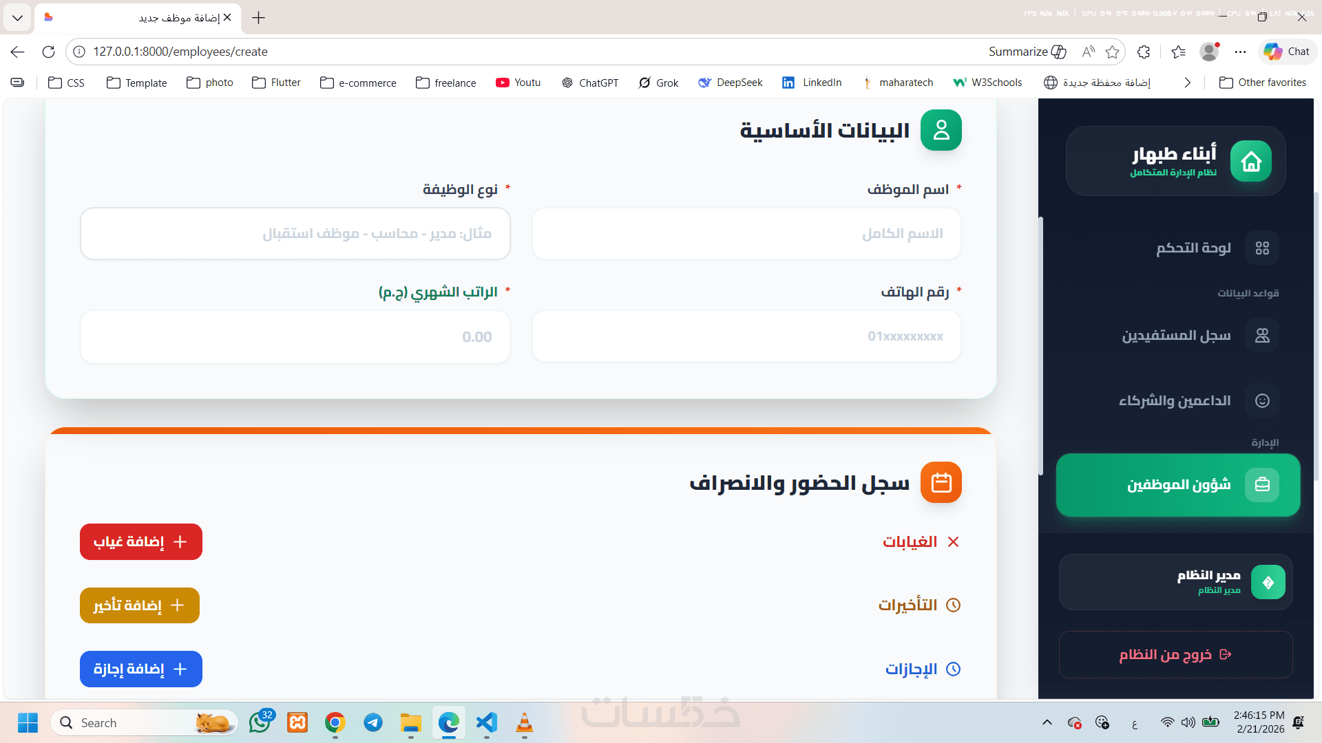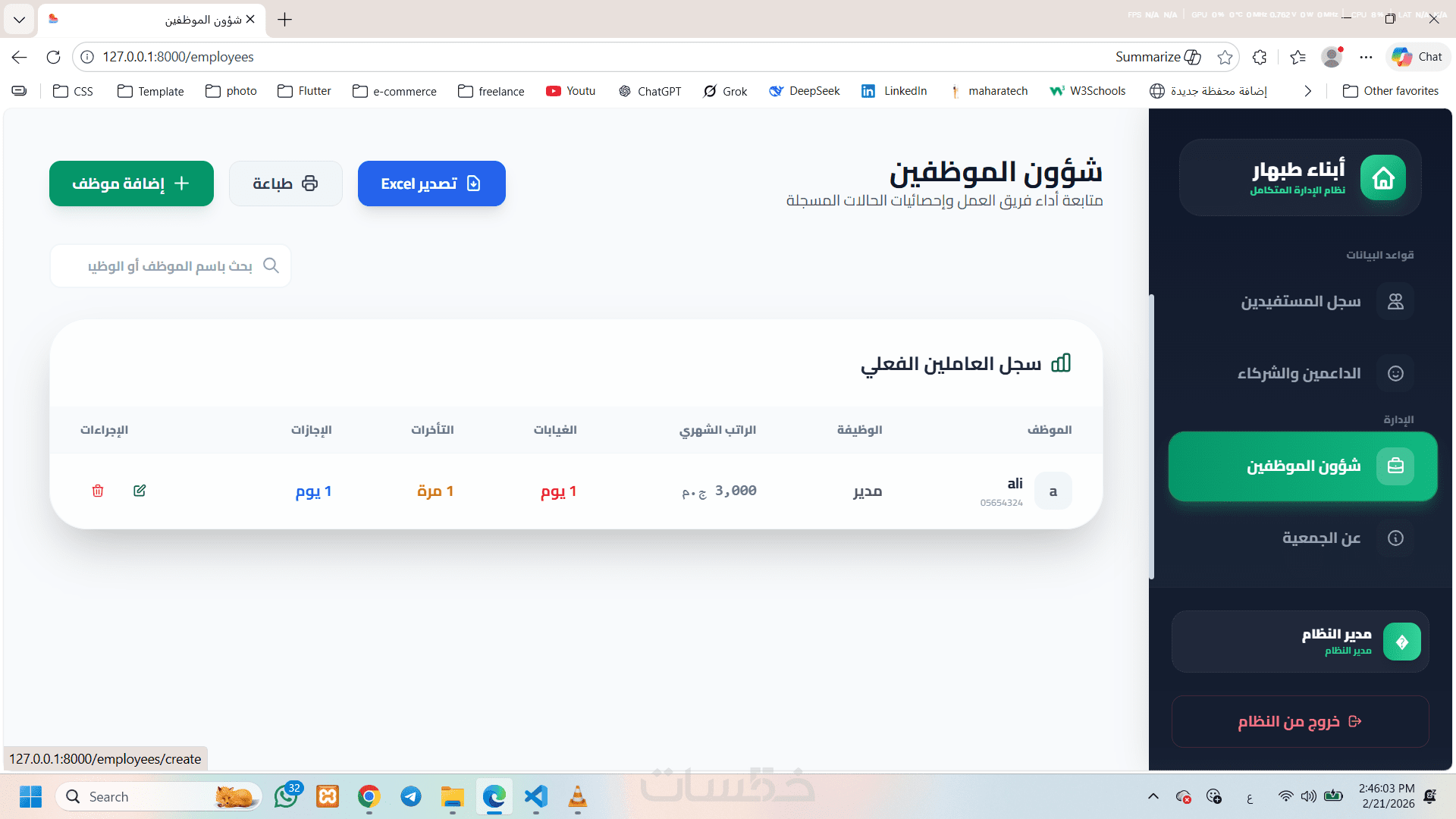 إدارة بيانات العاملين (الوظائف – الرواتب – الحضور والغياب).