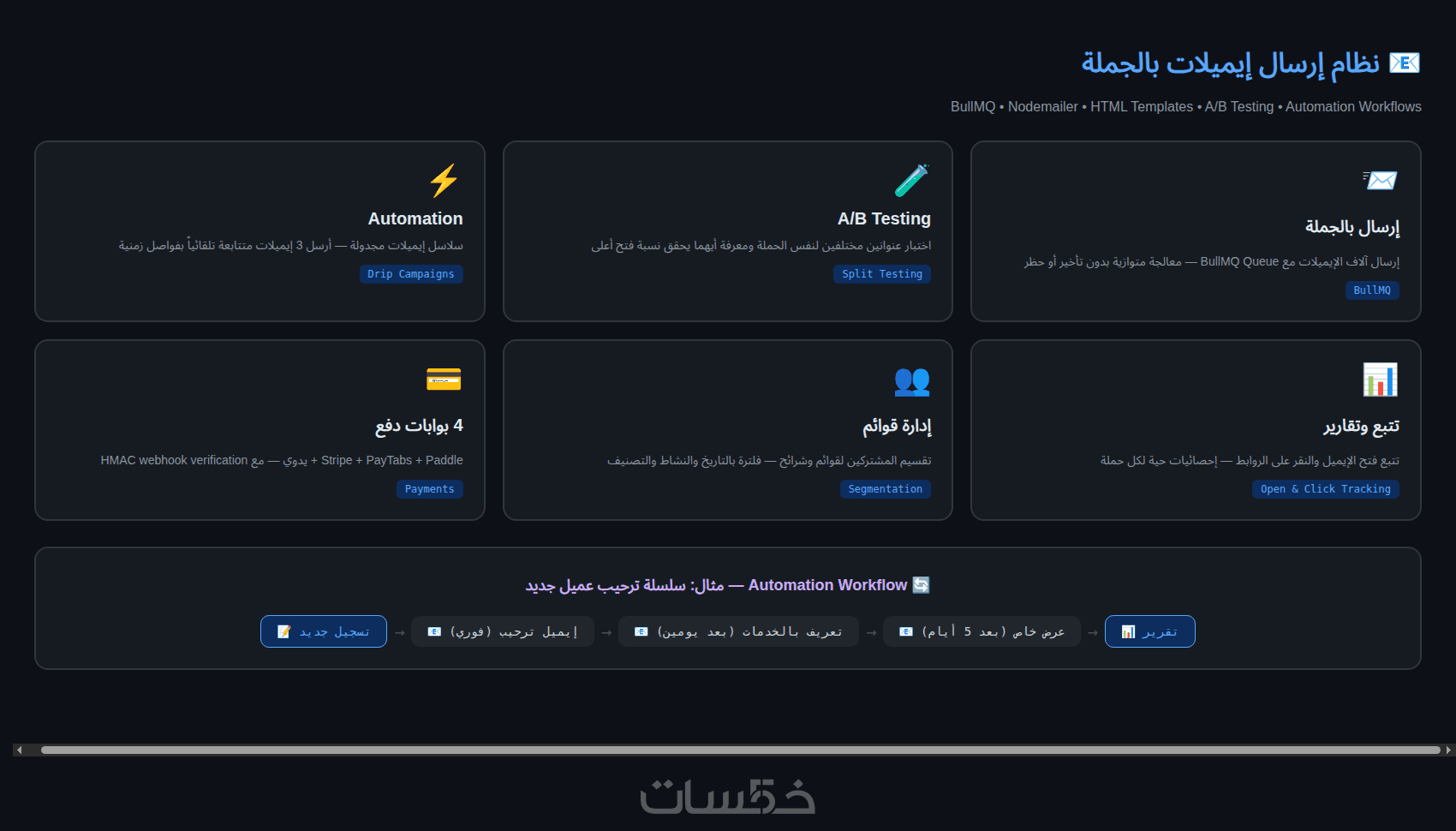 من أعمالي: بوت واتساب SaaS كامل مع 247 unit test و95 E2E test، ونظام إيميلات بالجملة مع BullMQ و4 بوابات دفع