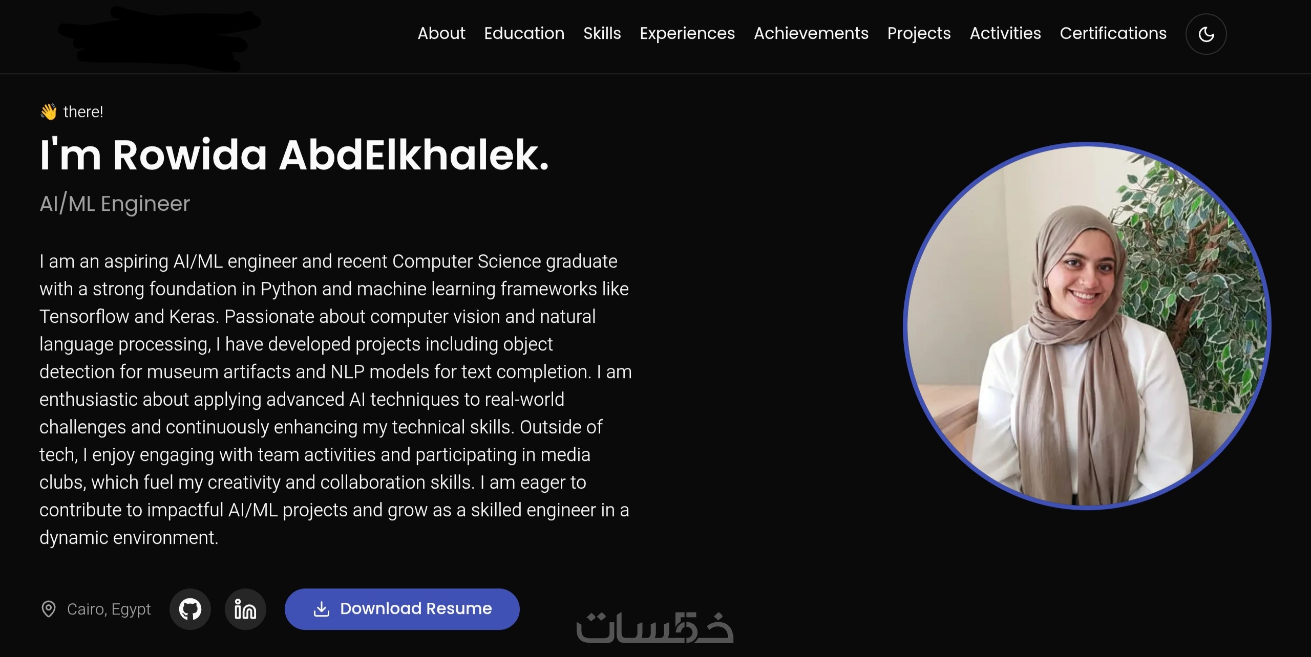 التصميم عبارة صفحة واحدة تحتوي علي الأركان الاساسية لل portfolio: