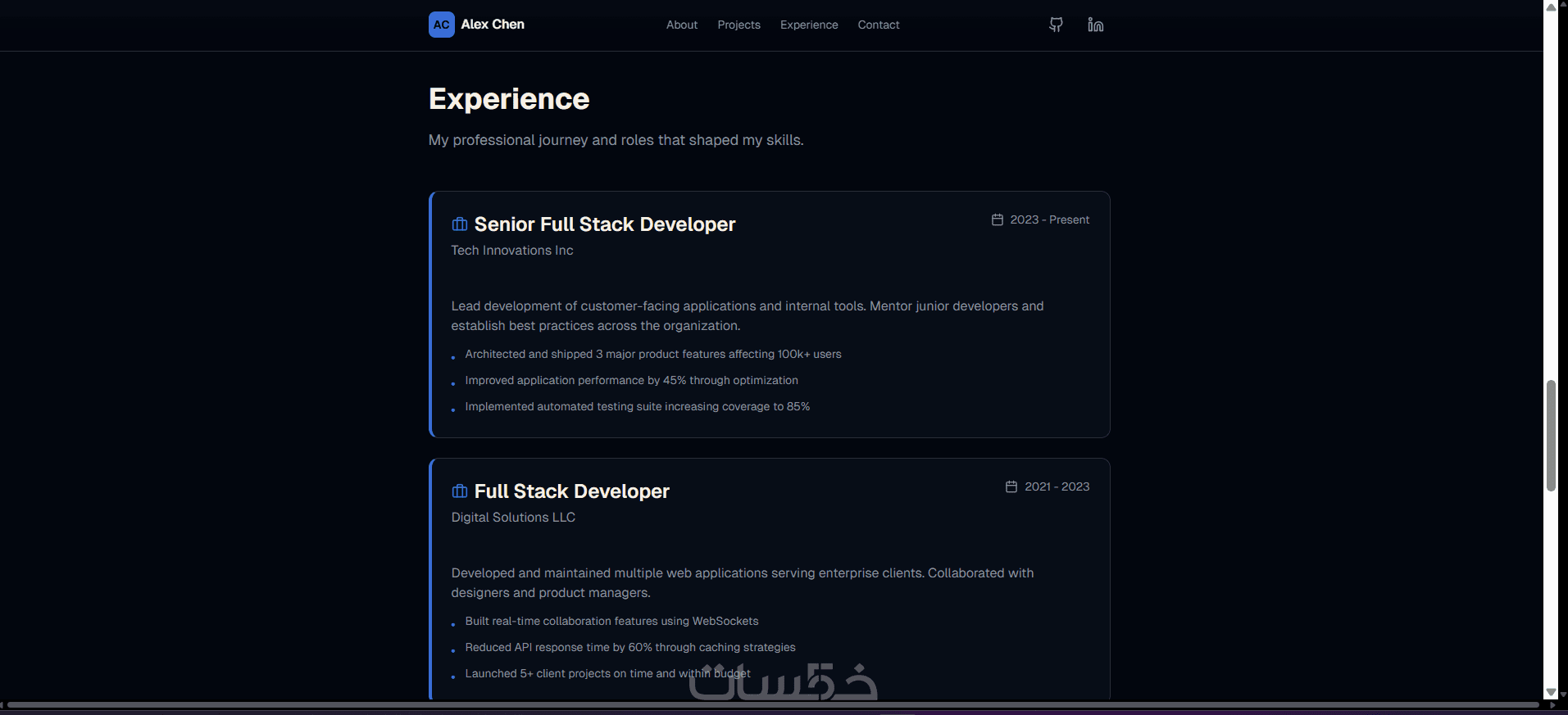 قسم التواصل (Contact): روابط حساباتك المهنية (LinkedIn, GitHub) وبريدك.